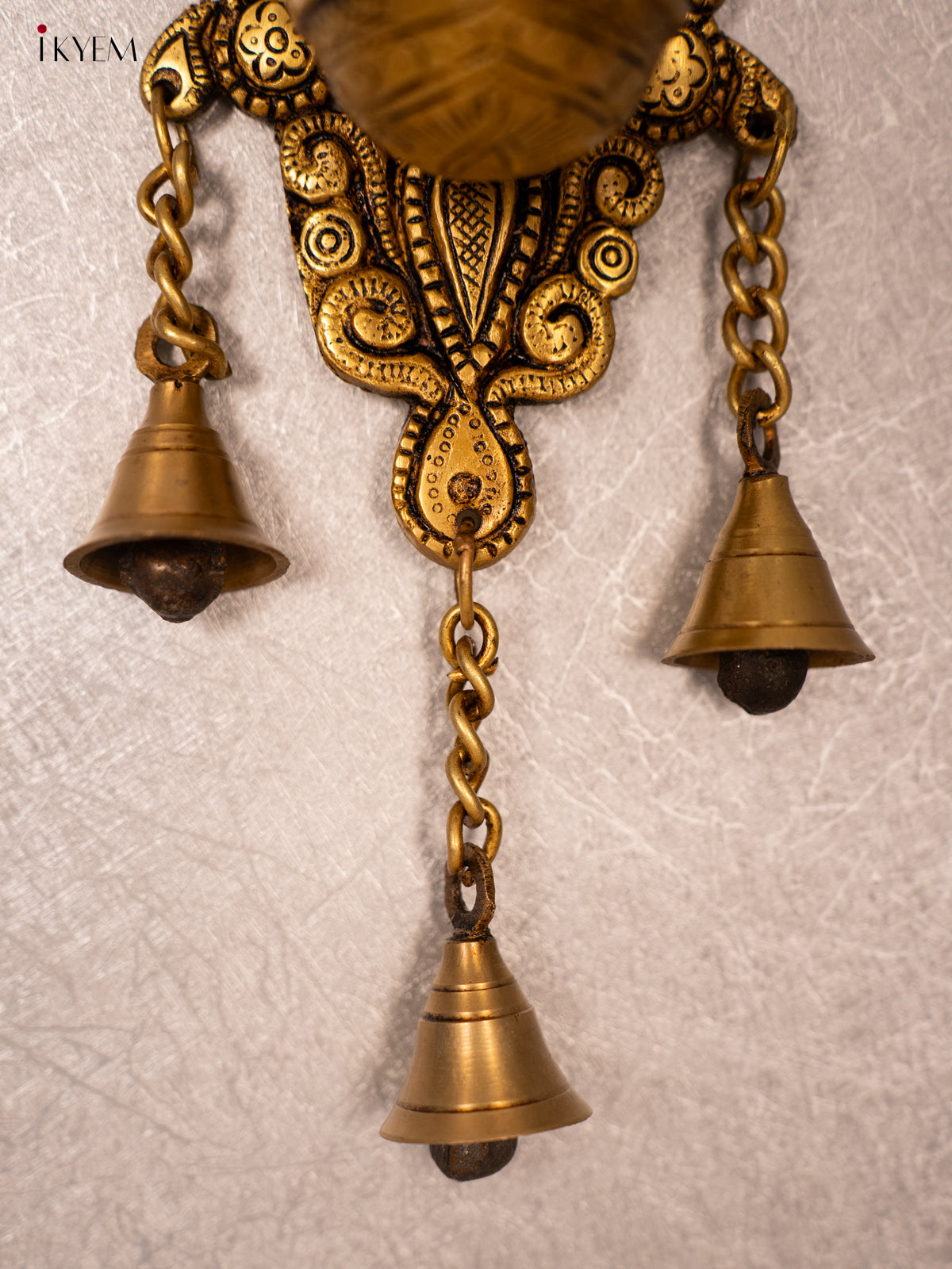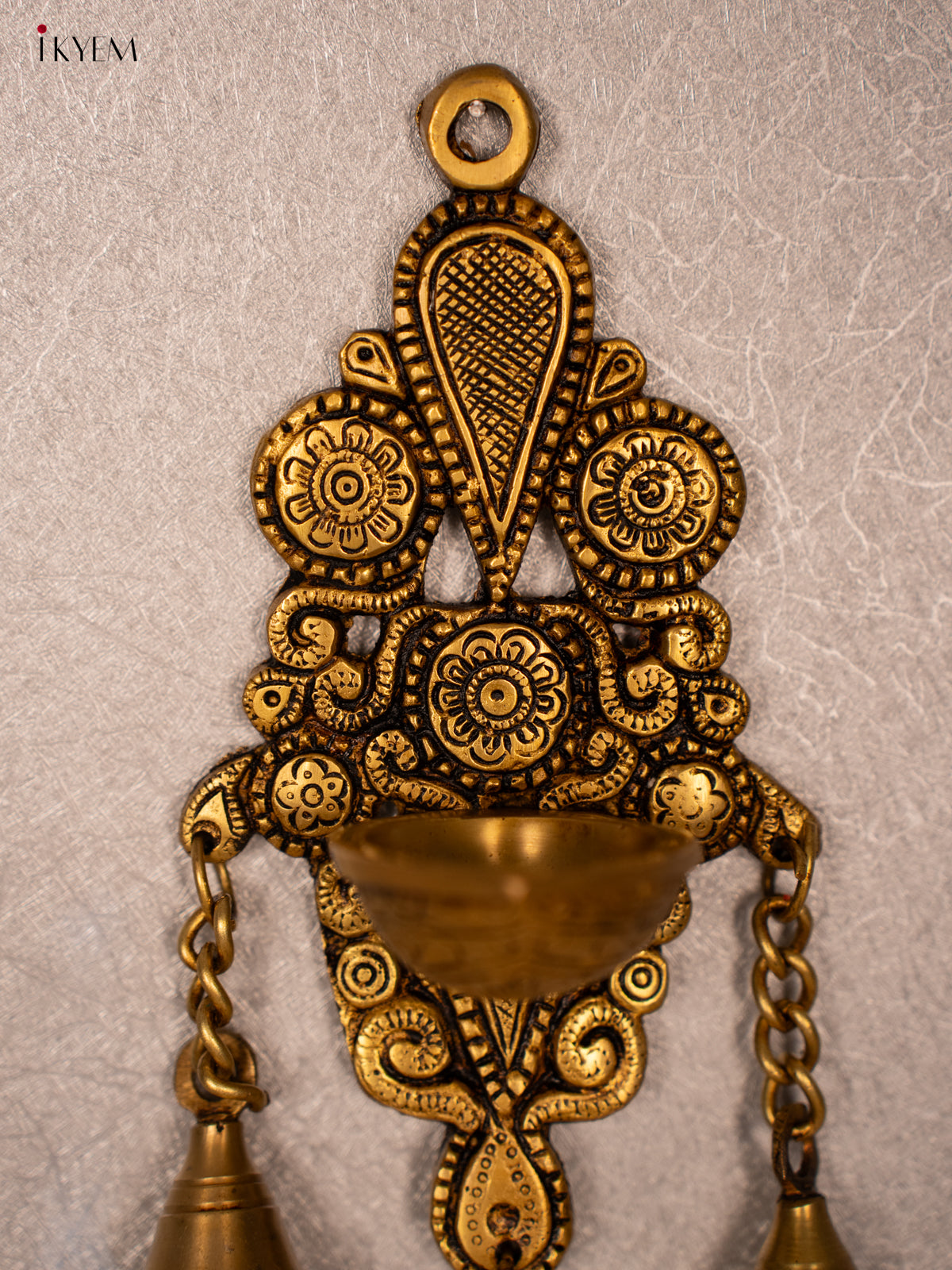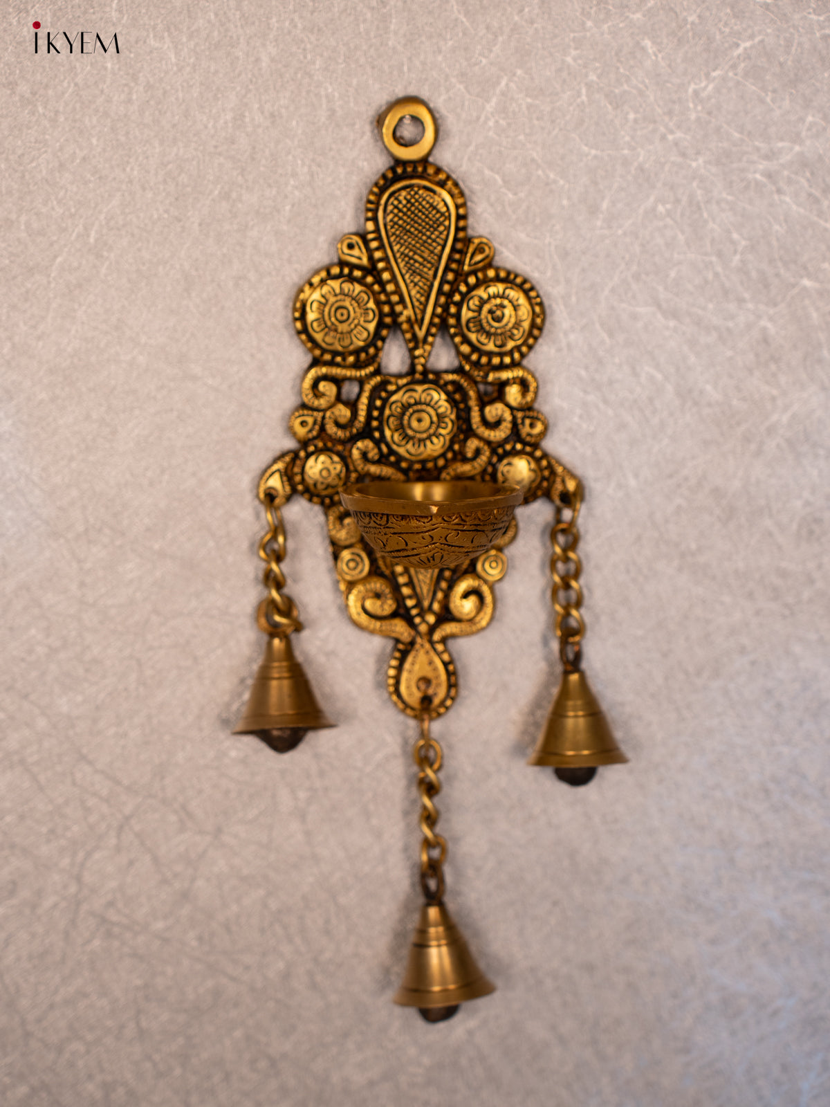 Brass Antique Wall Mount Hanging Diya with 3 Bells - 11 Inches - KG26112