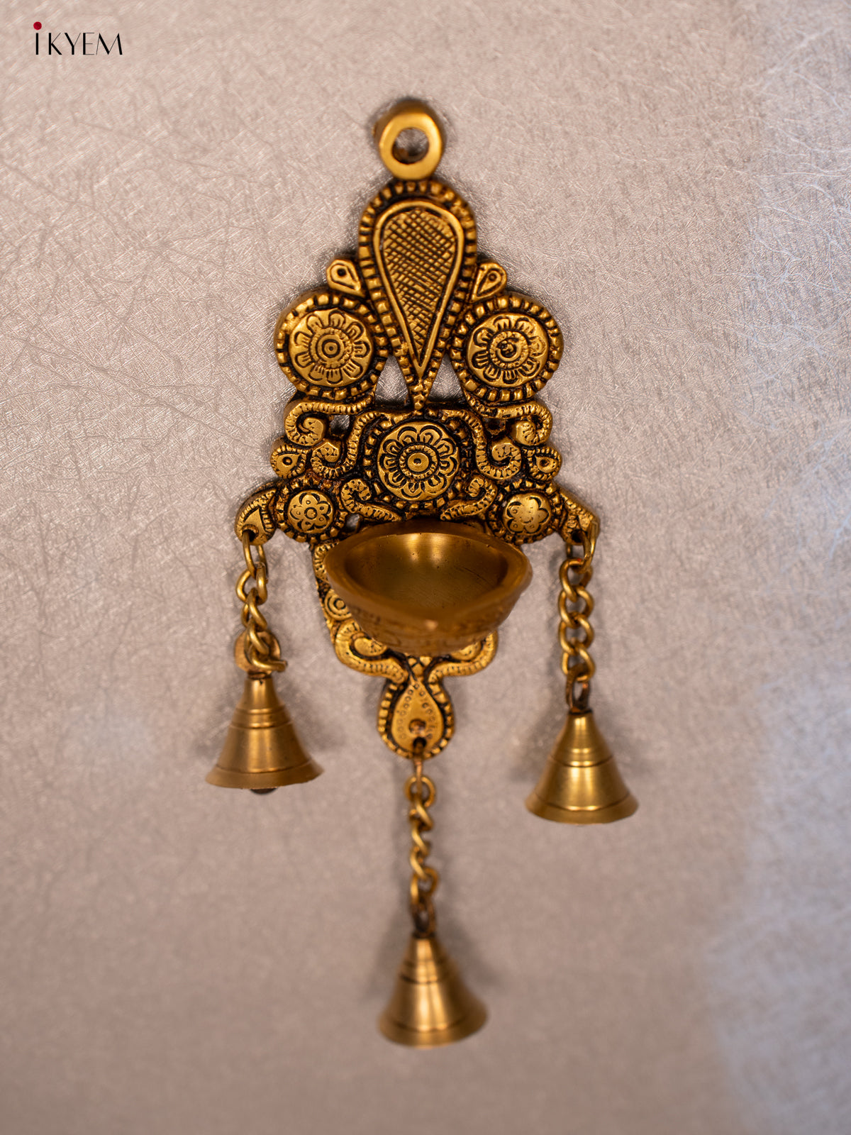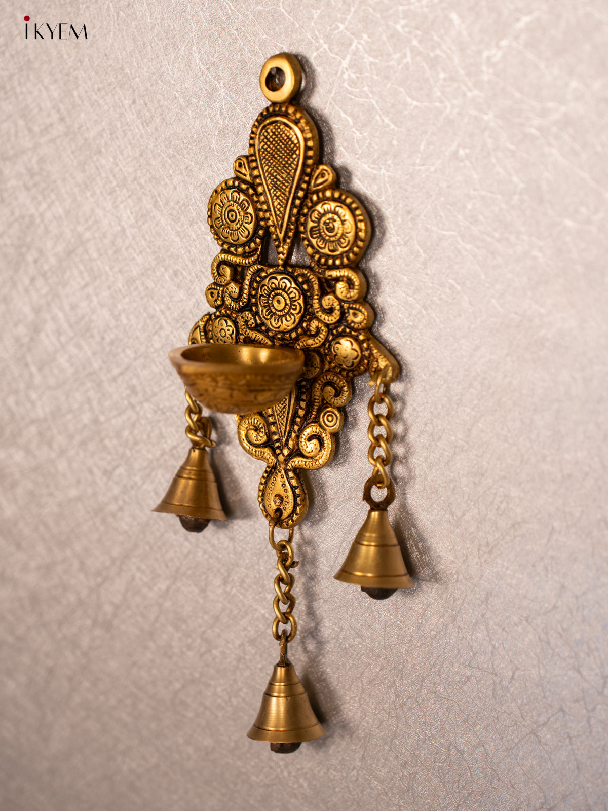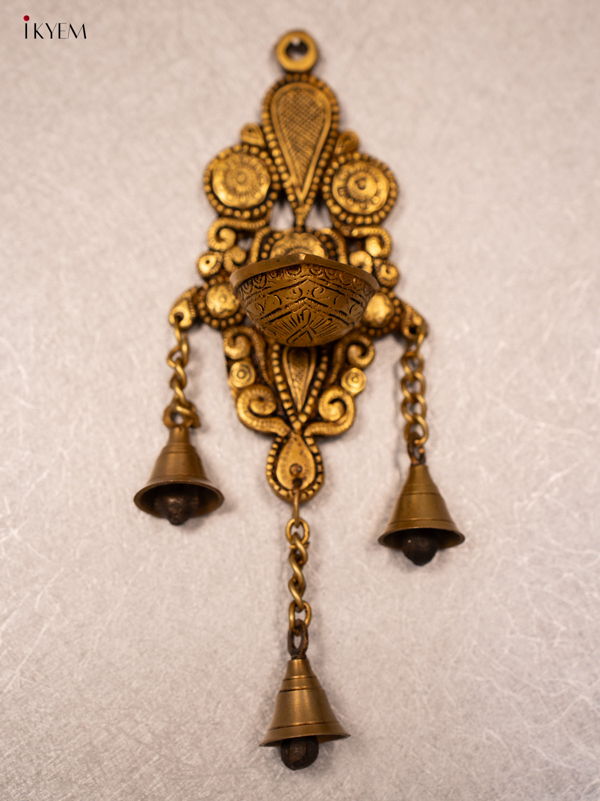 - Enhance your pooja space with the Brass Antique Wall Mount Hanging Diya, featuring three decorative bells.