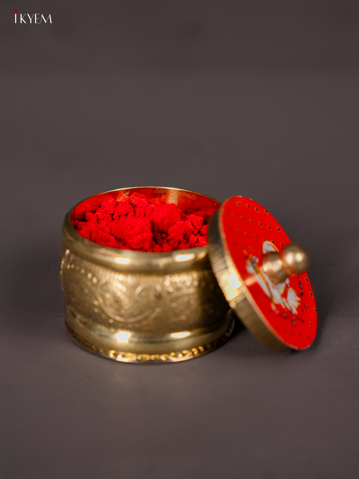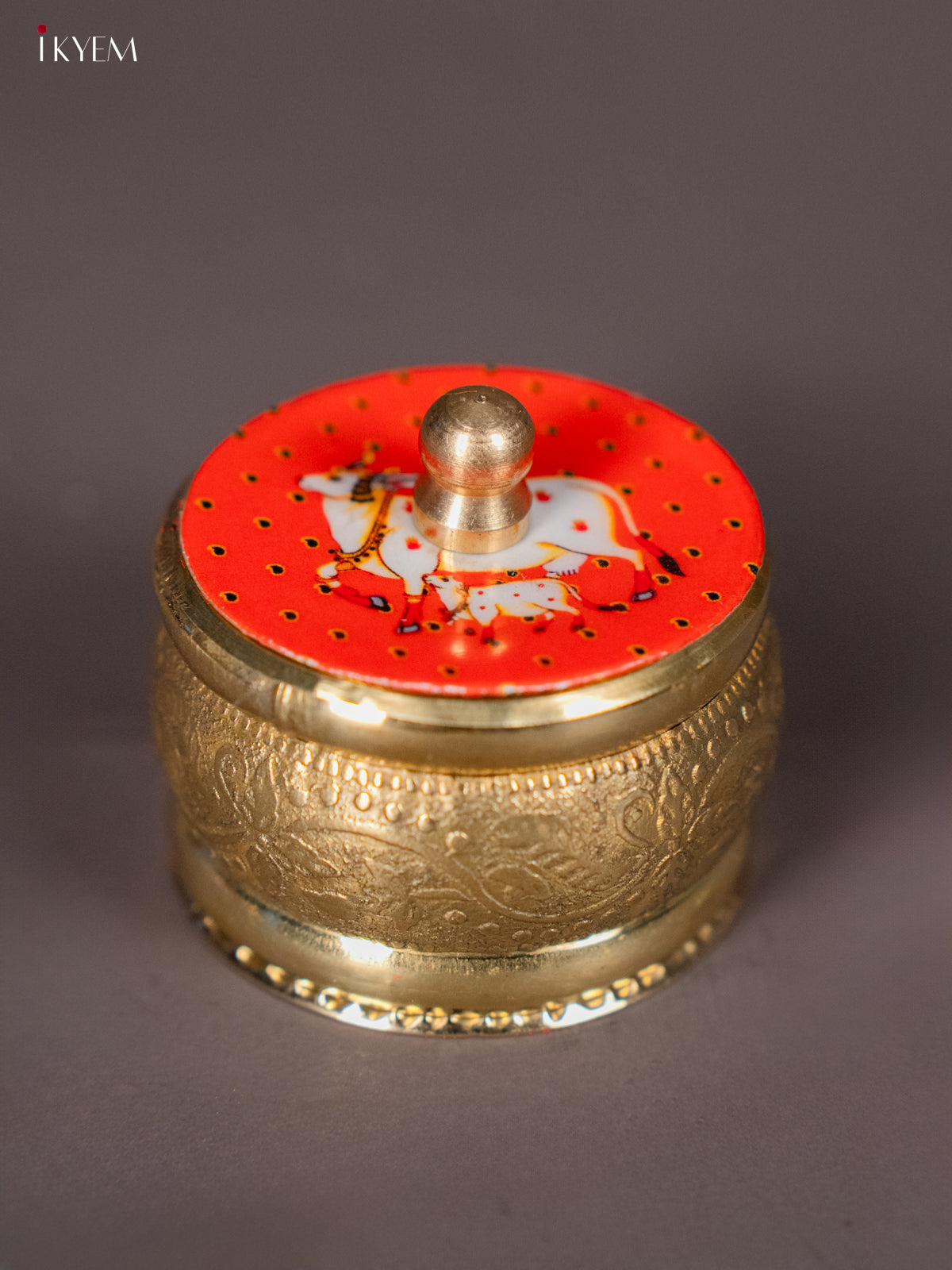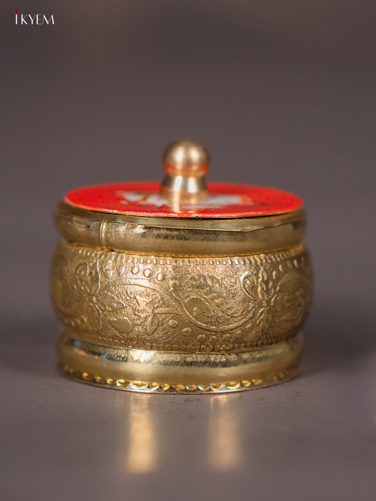 Artistic Brass coated Kumkum Holder with Red Colour Pichwai Printed Lid - KI01215