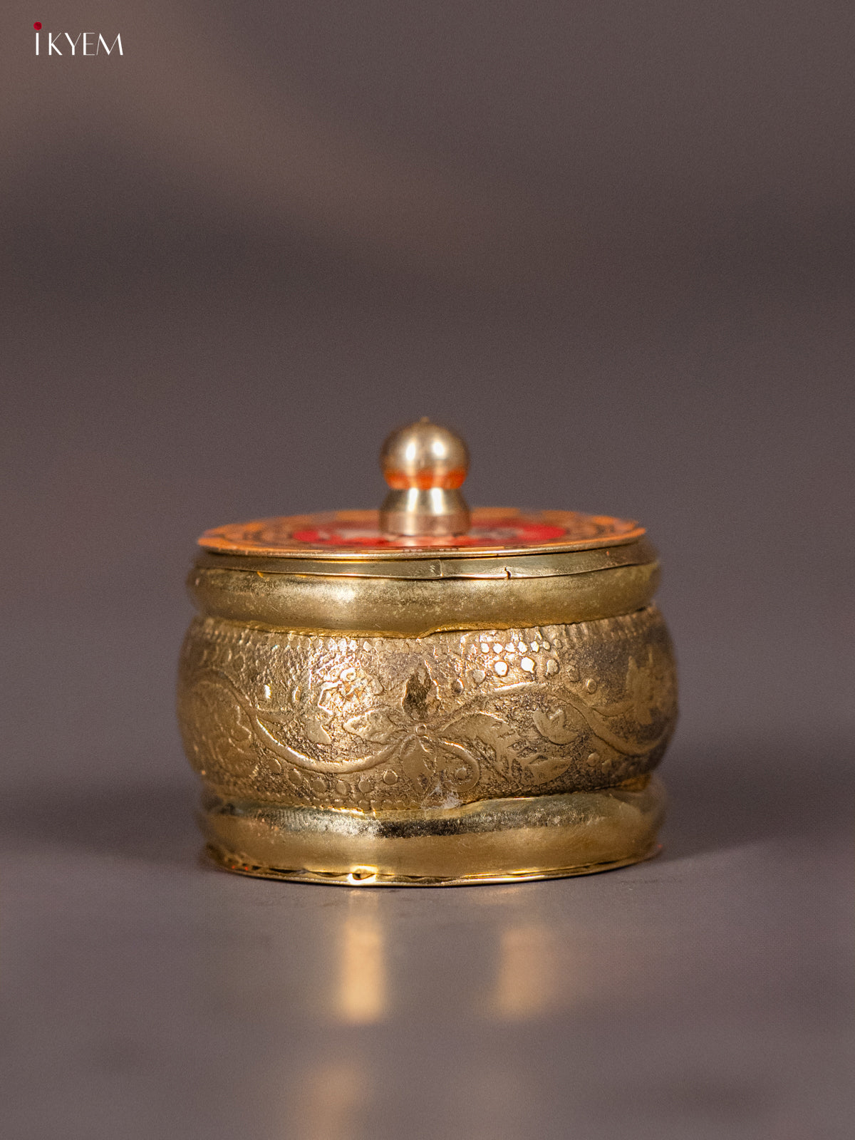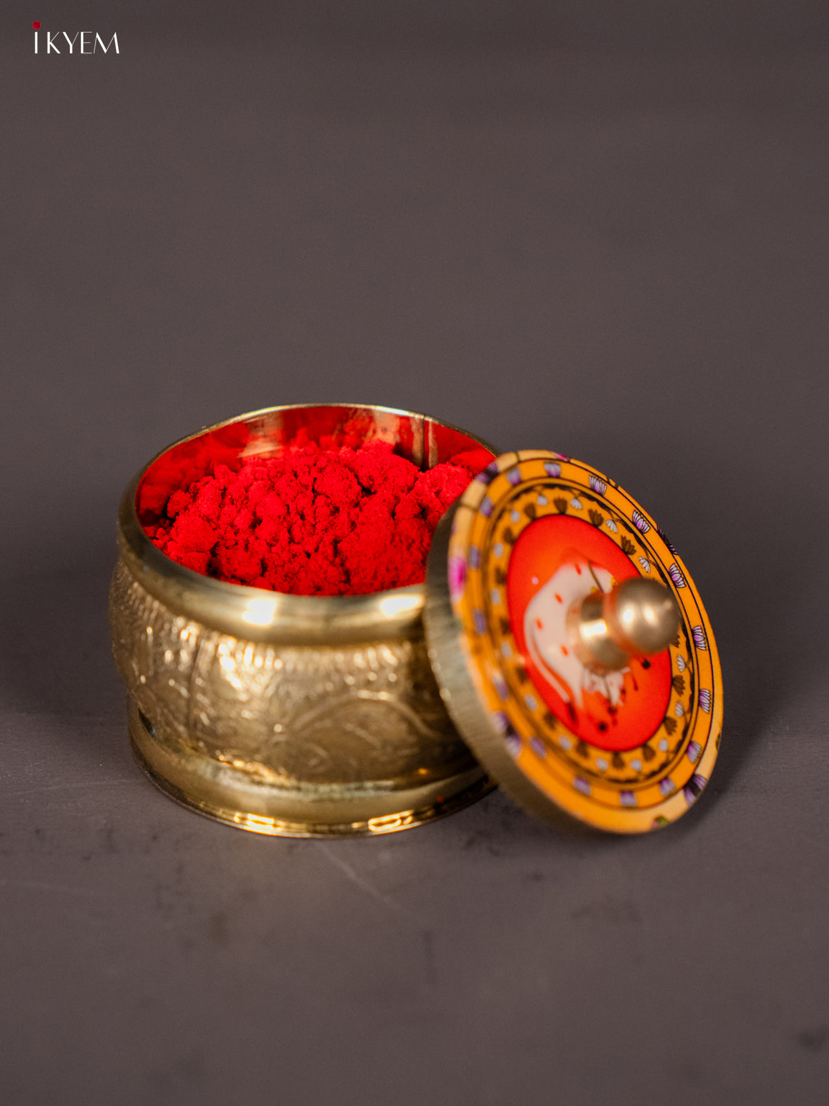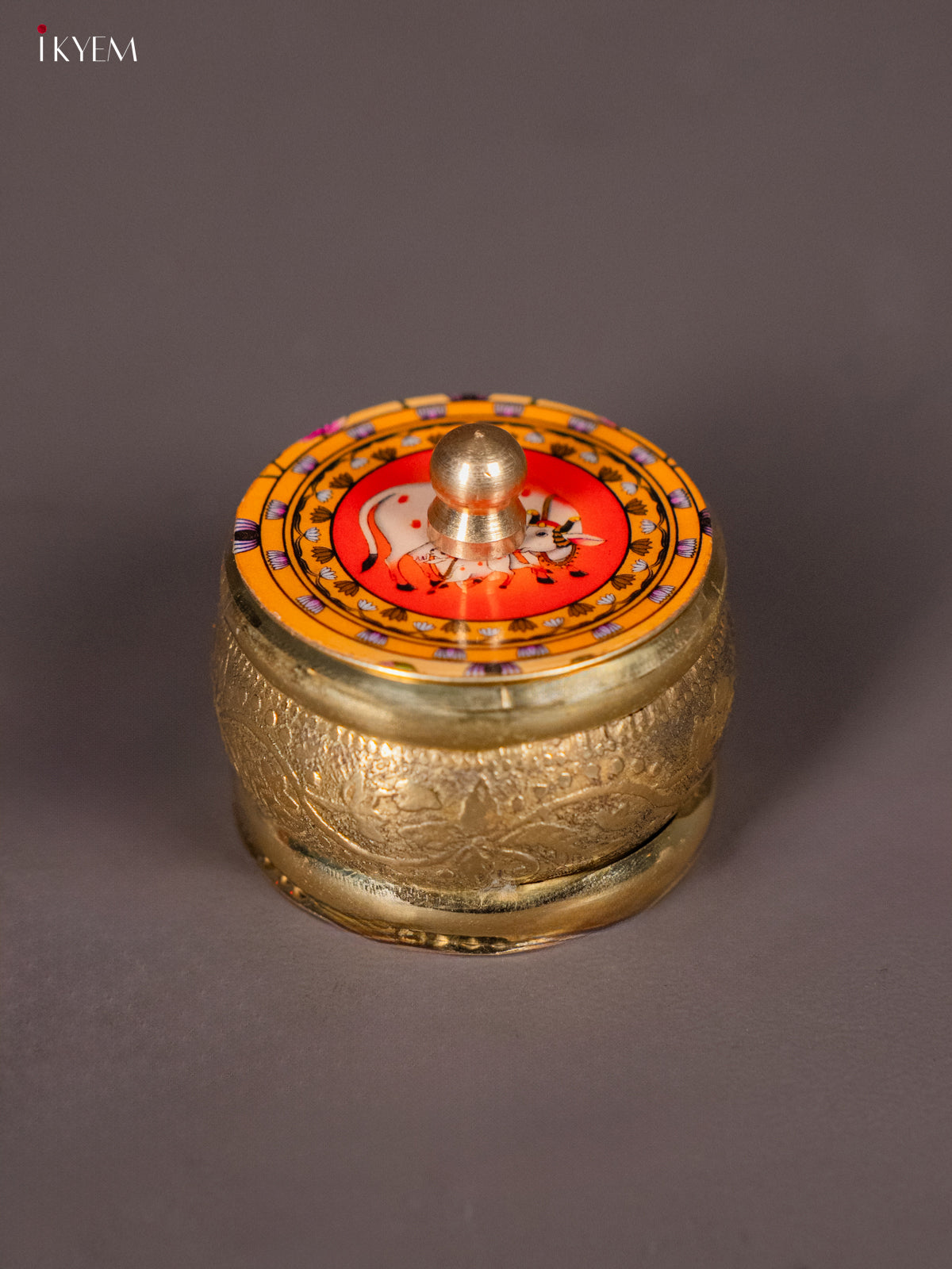 Brass coated Kumkum Holder With Yellow & Orange Pichwai Cow & Calf Printed Lid - KI01213