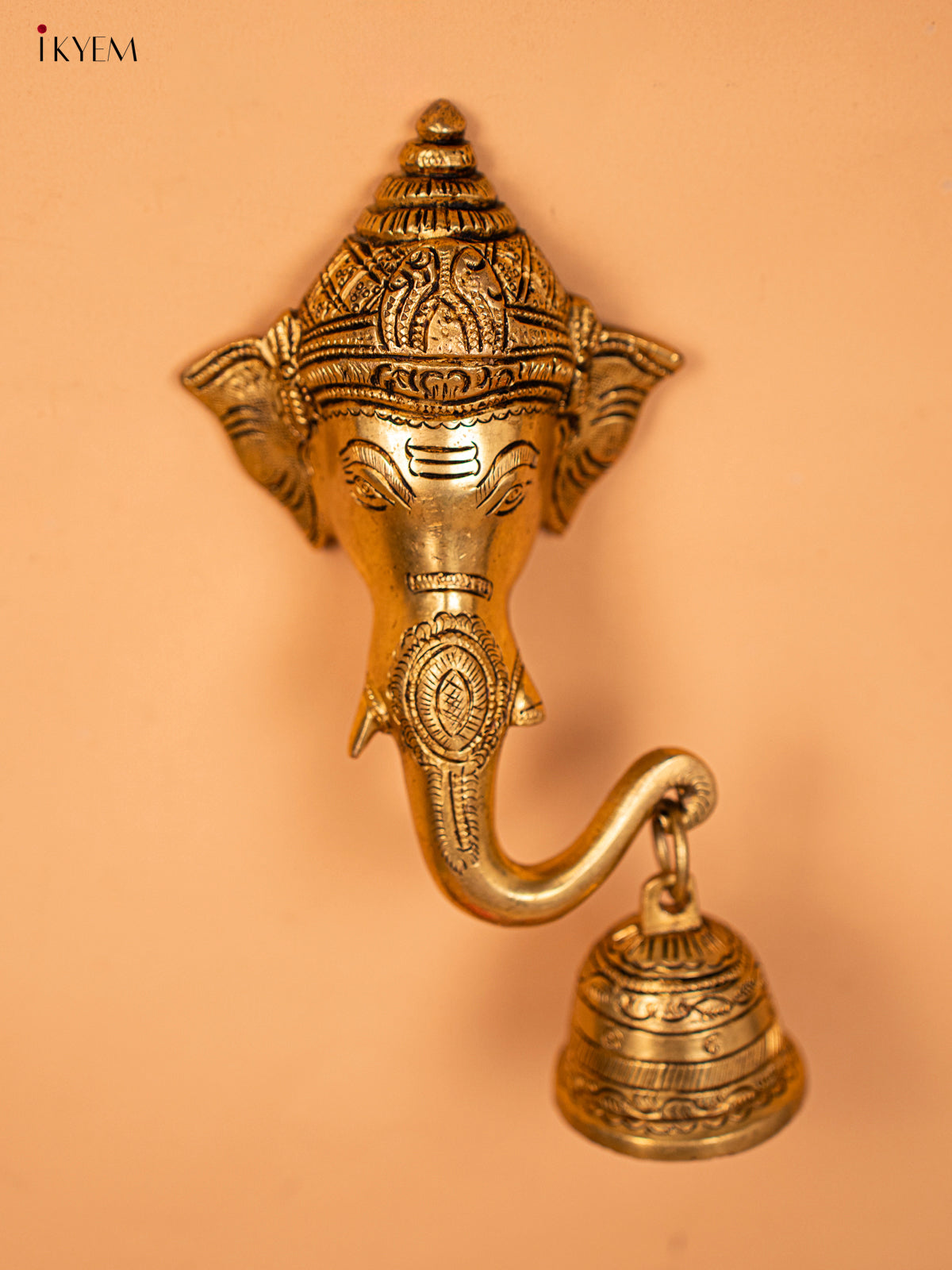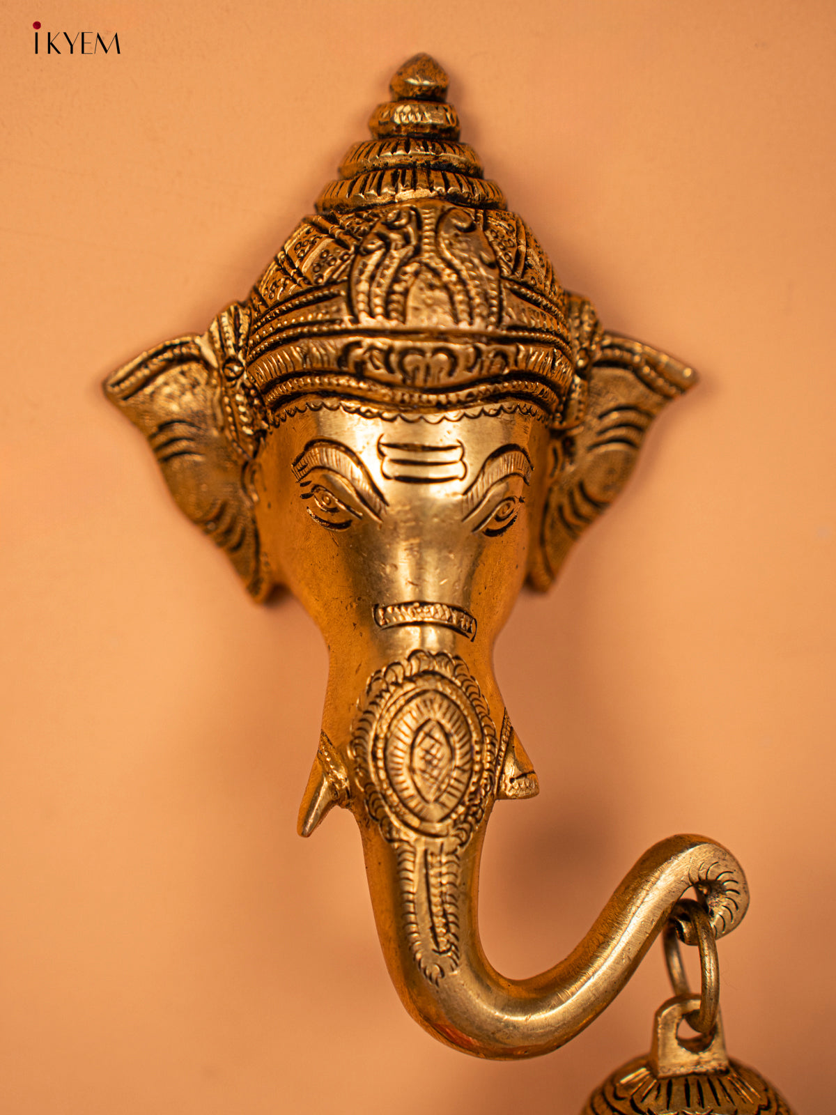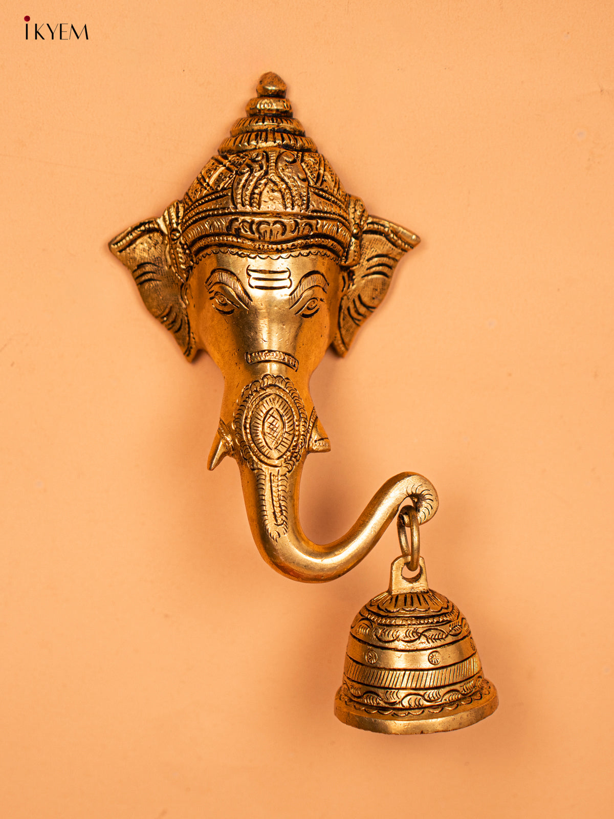 - Expertly crafted from brass, this stunning Ganesha face features intricate details and a delicate bell.