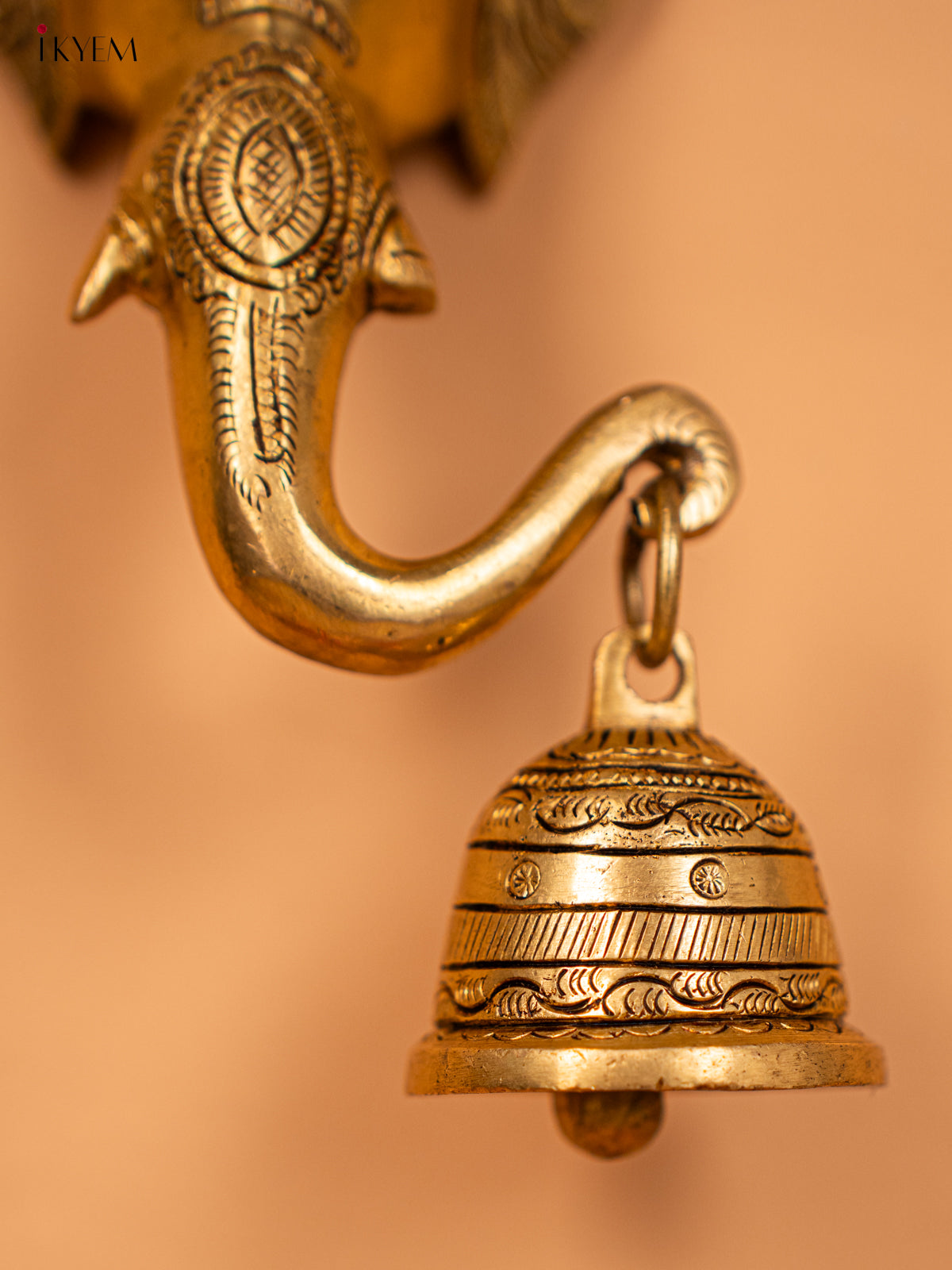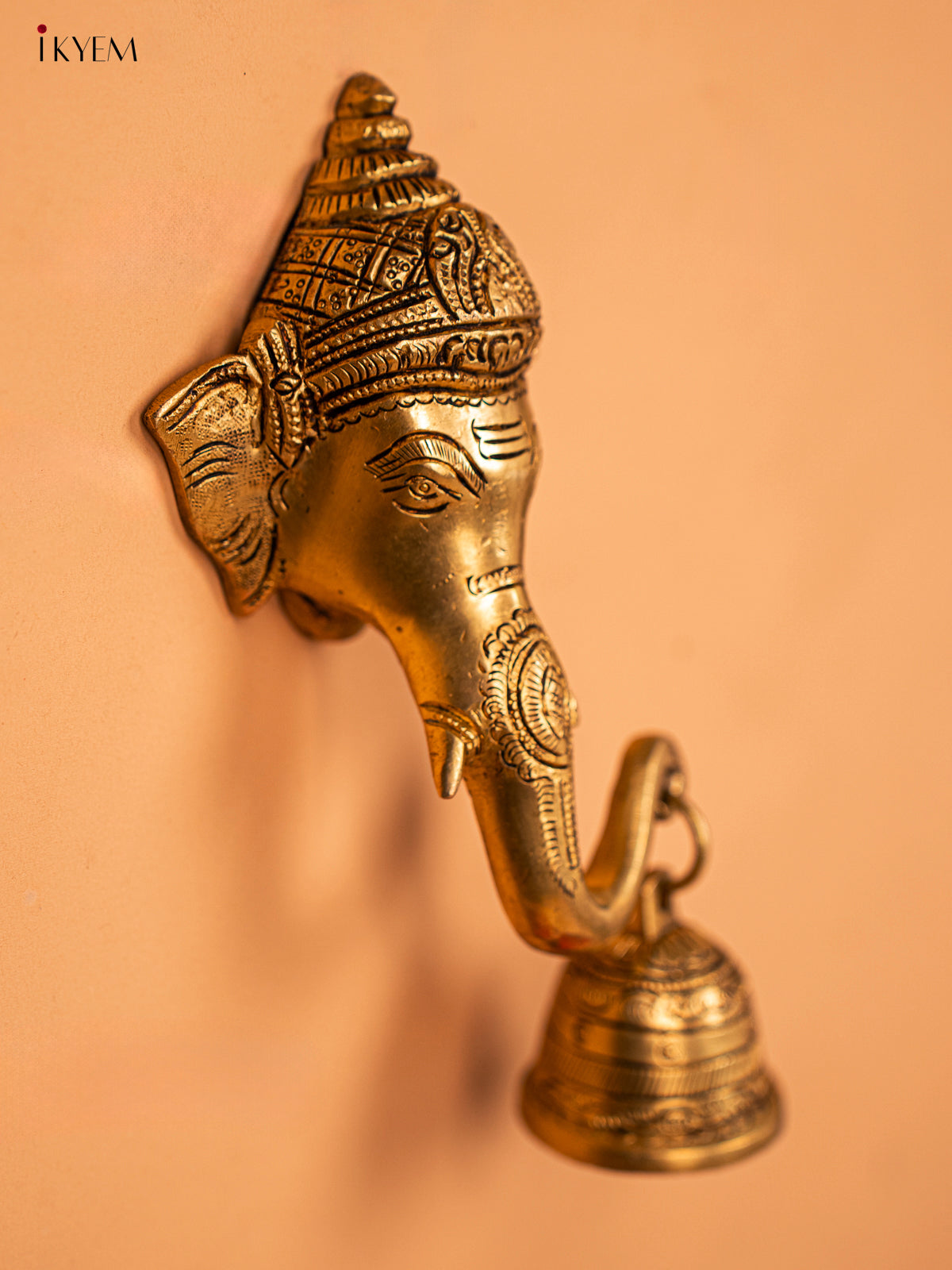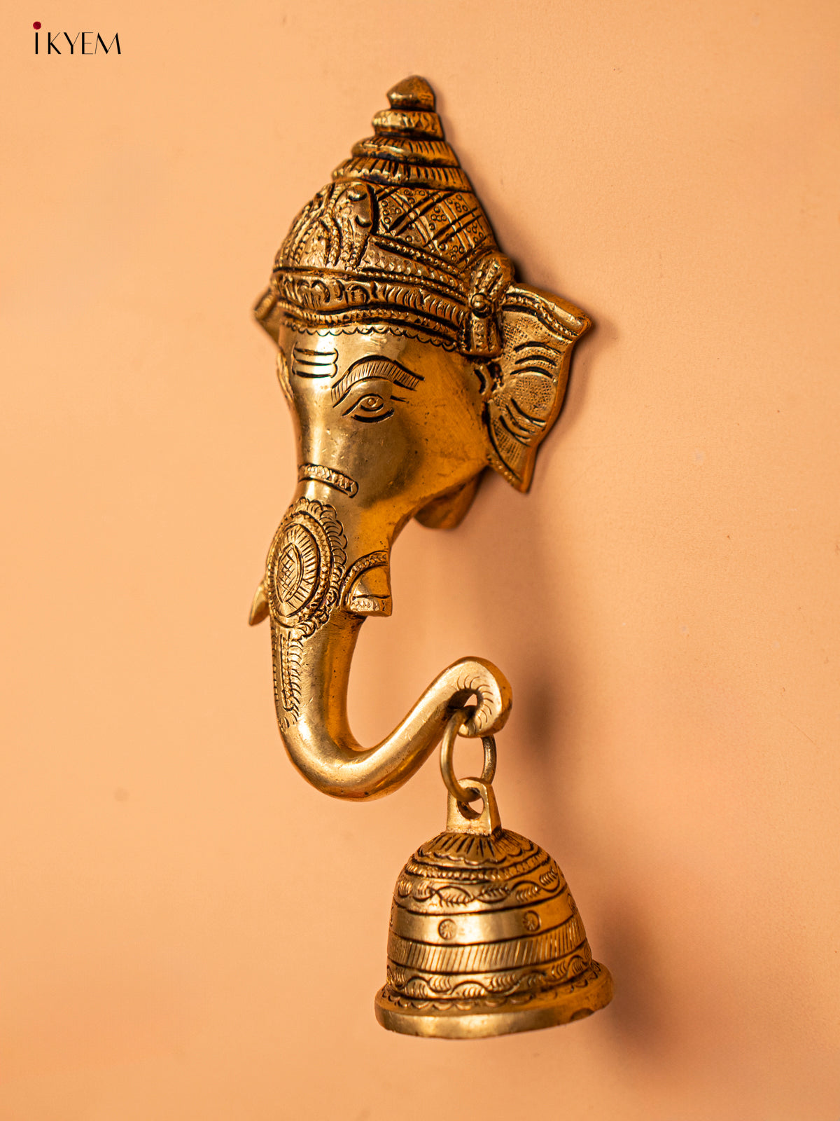 - Expertly crafted from brass, this stunning Ganesha face features intricate details and a delicate bell.