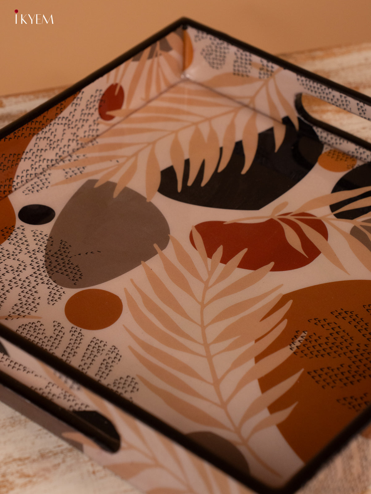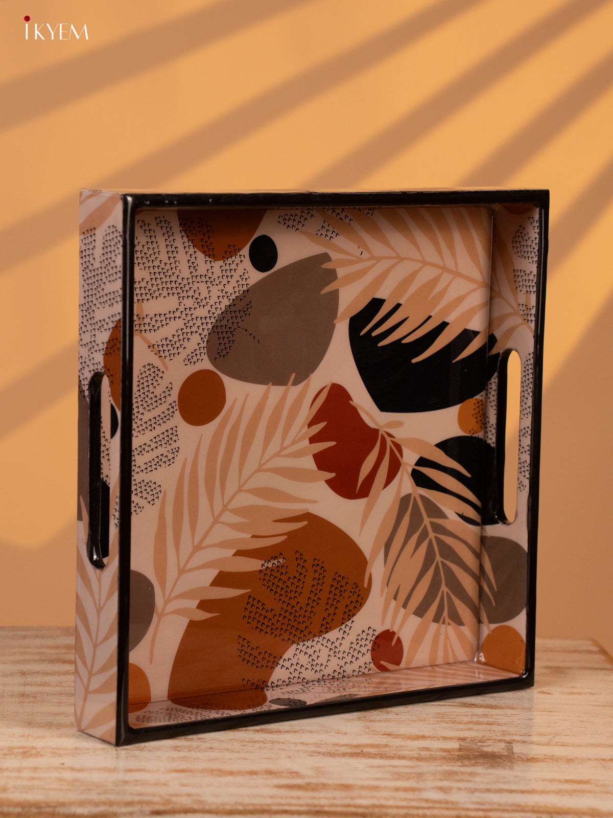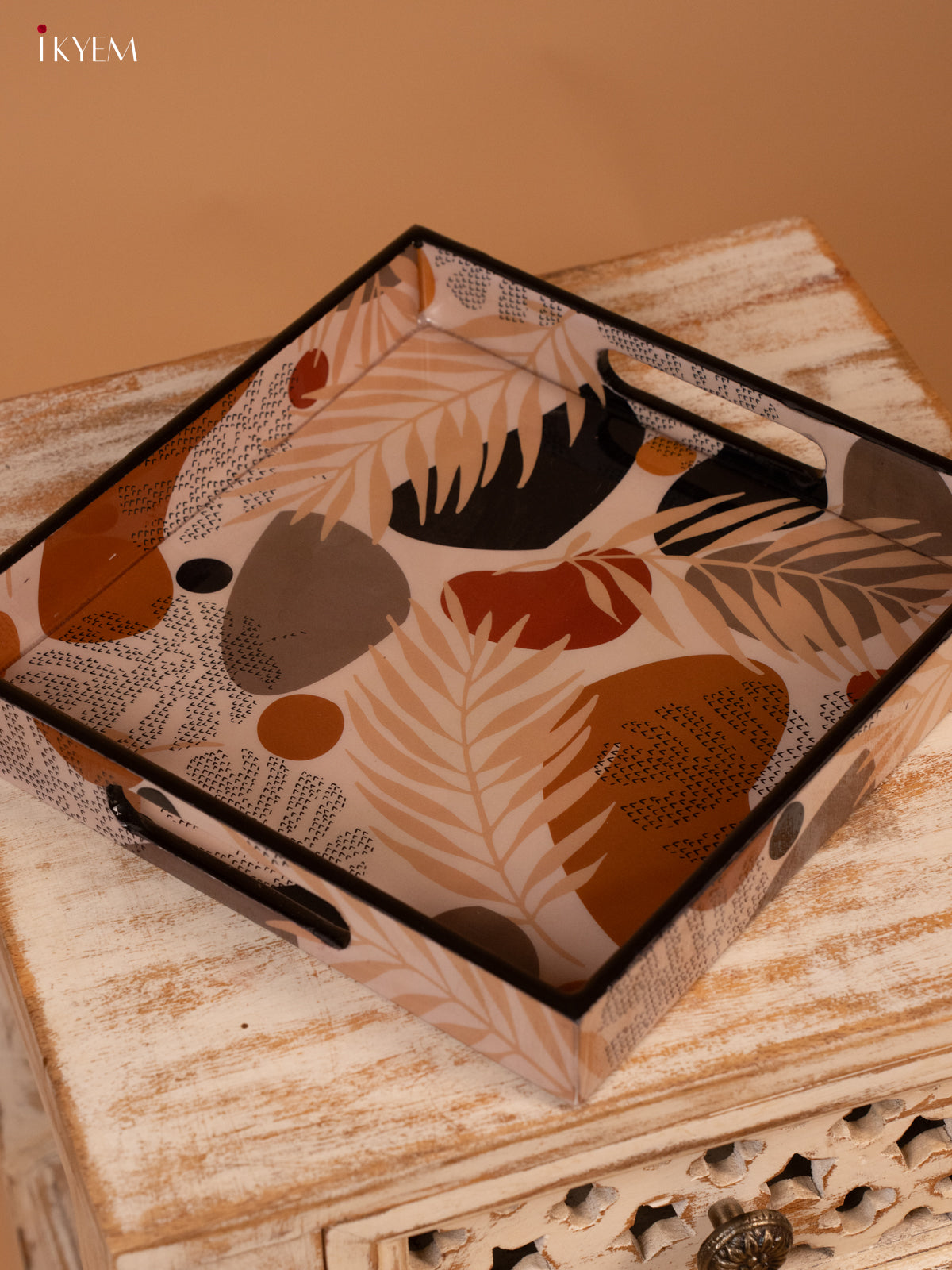 Brown Leaf Printed Square Wooden Tray (10x10) - KL03117