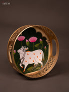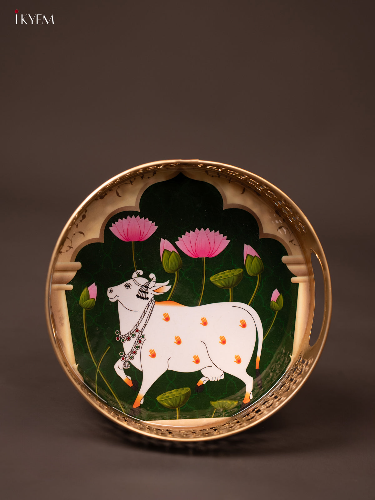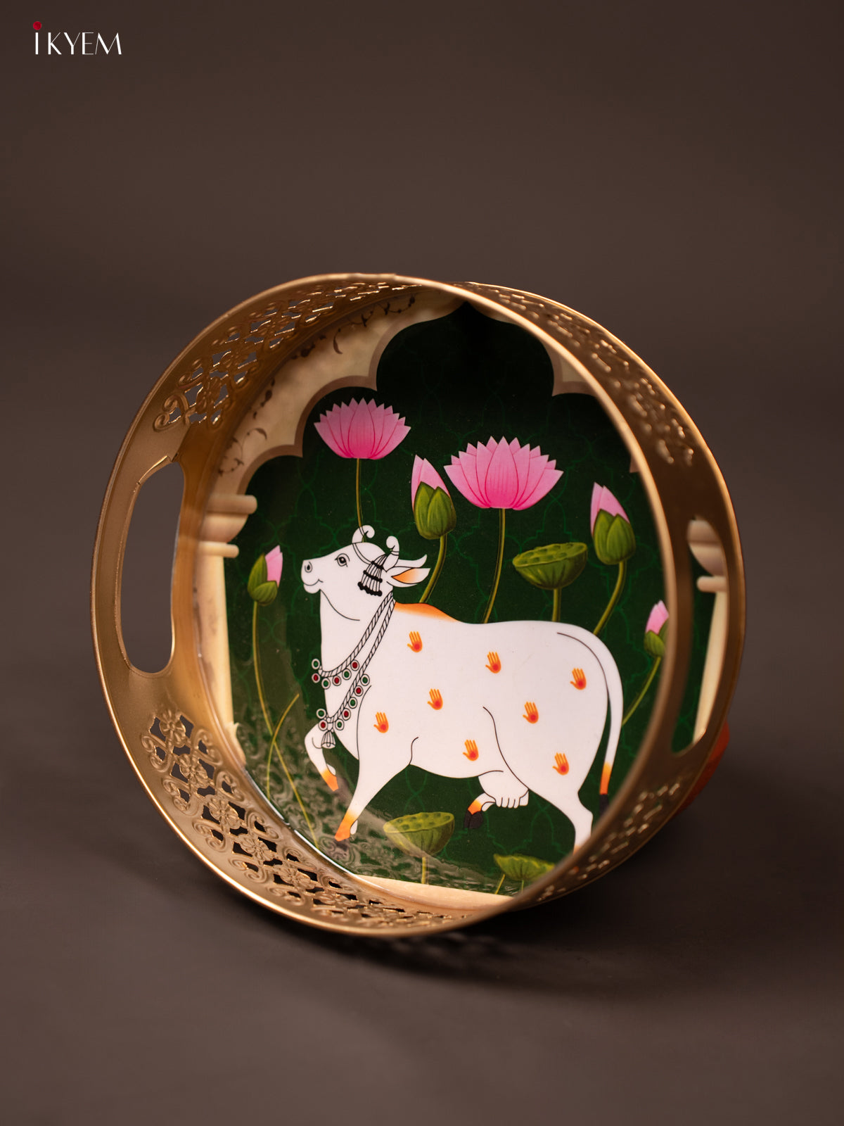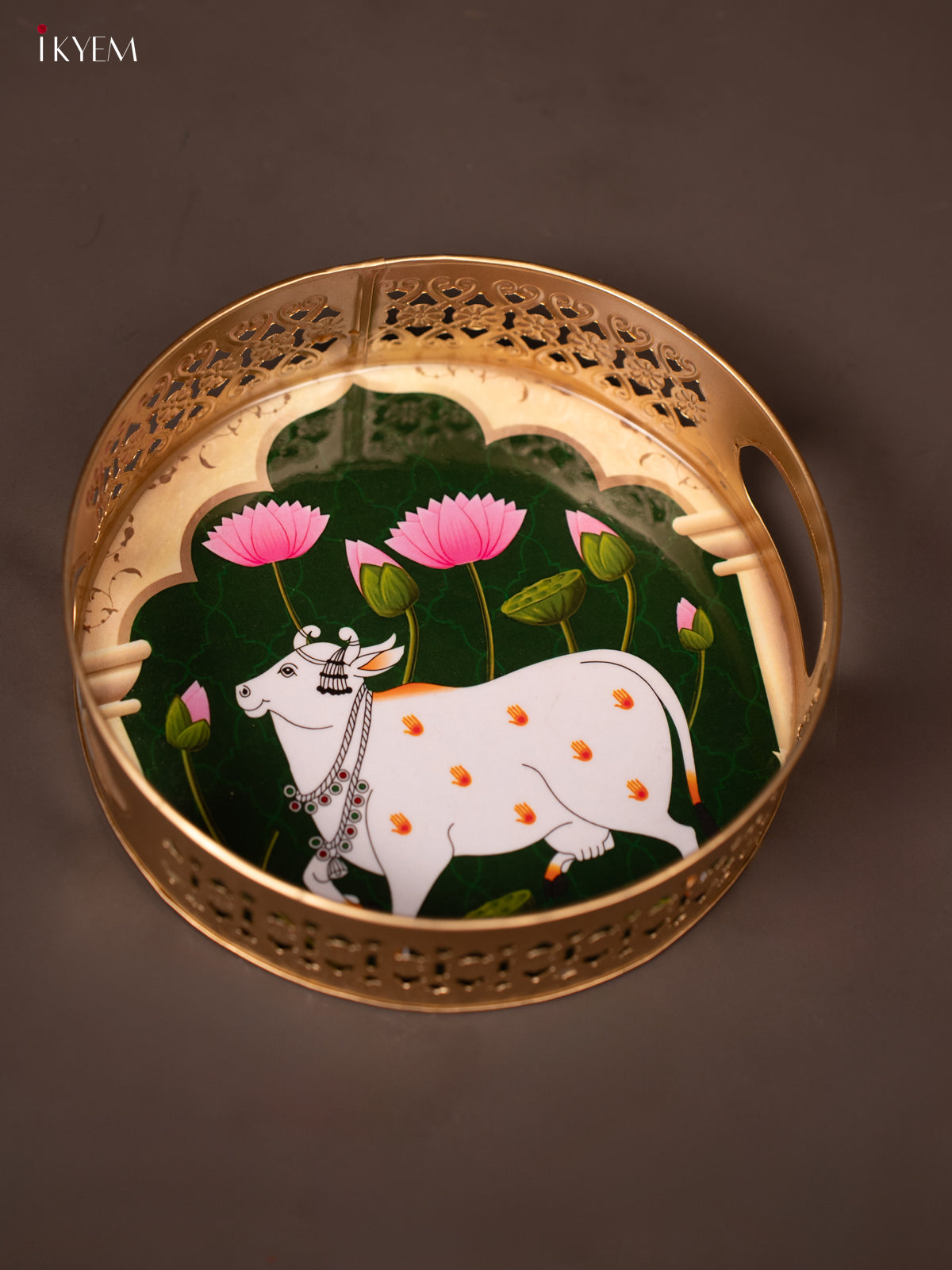 - This 8-inch Metal Digital Pichwai Round Tray in dark green, features a beautiful Pichwai cow design.