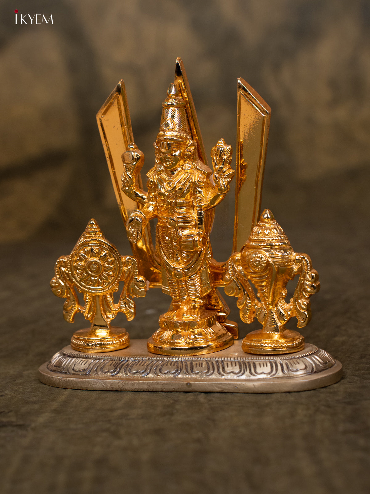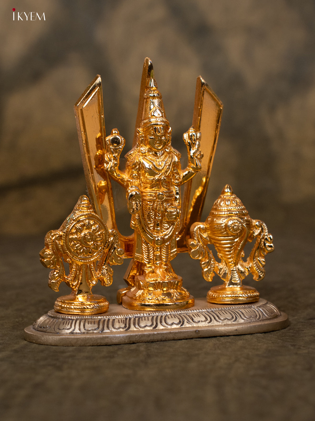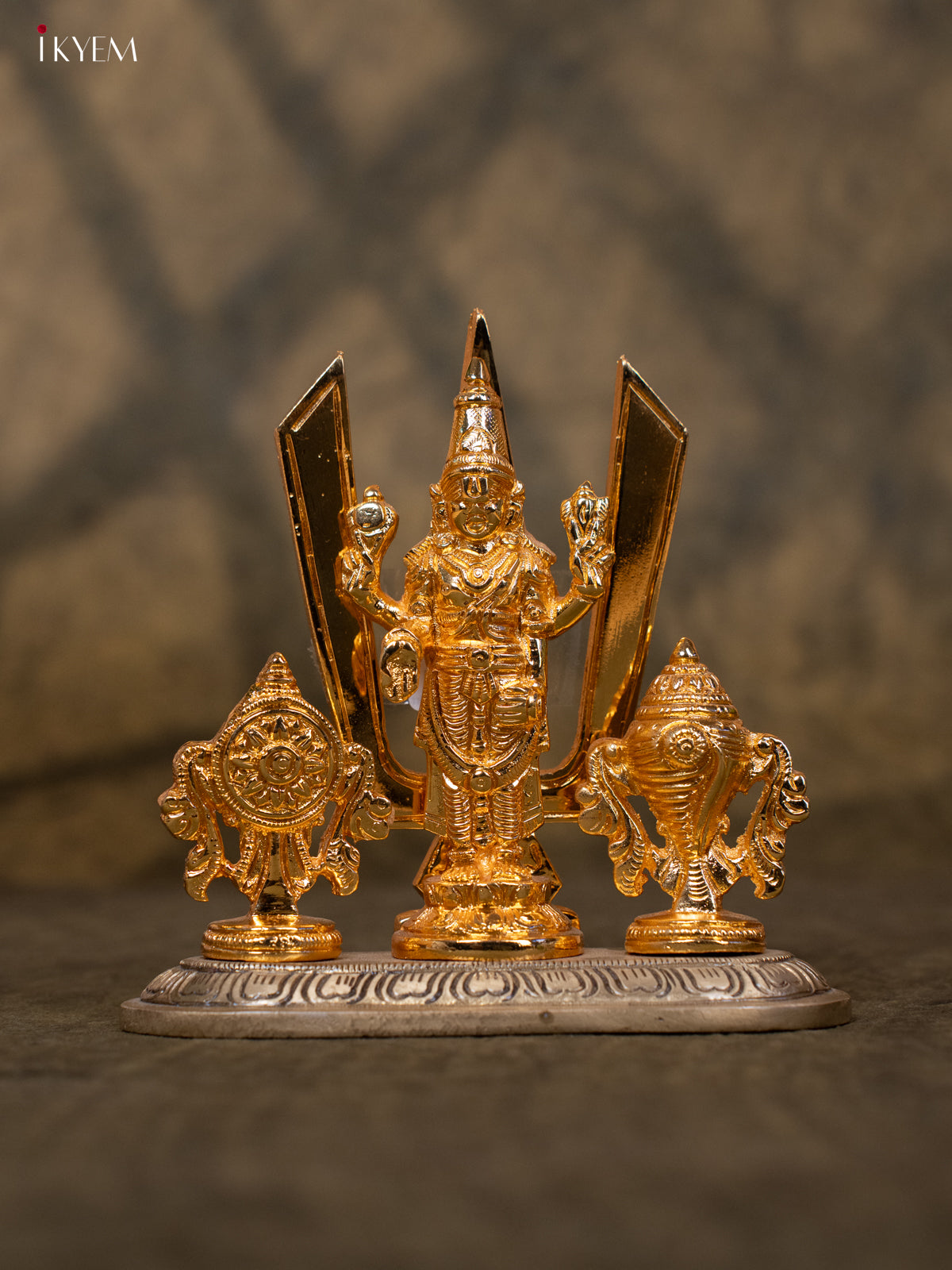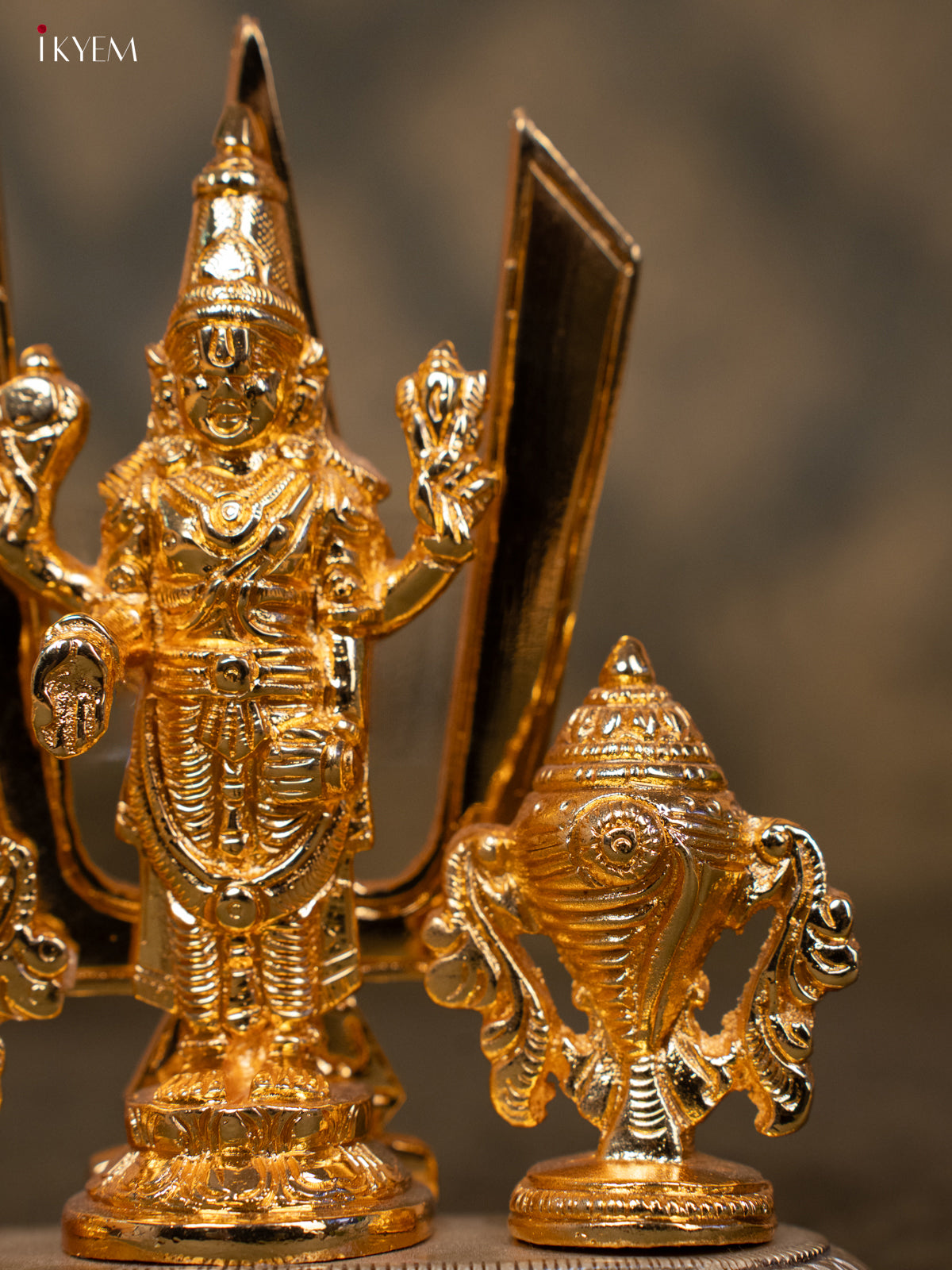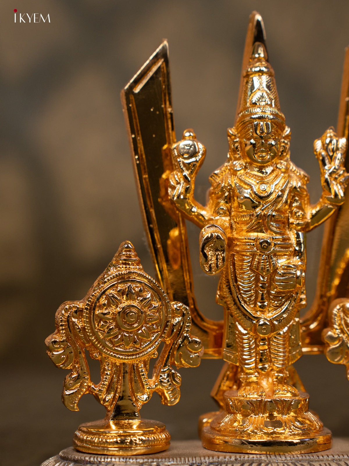 Handcrafted brass figurine of Lord Balaji with is sigils the Shanku and Chakram on either side. They are powerful symbols of protection, and are revered as the God himself. The idol stands on a carved pedestal. The lord is shown in elaborate finery with garlands and jewels gracing his person. The idol is ornately carved, and detailed by some of India’s finest craftsmen. The idol is finished in pure 24 kt Gold Coated Finish, and protected with a lacquer coating. Vishnu is best worshipped on Thursdays, by offering laddus, or sweet dal. The idol purifies our homes with his protection and prosperity.