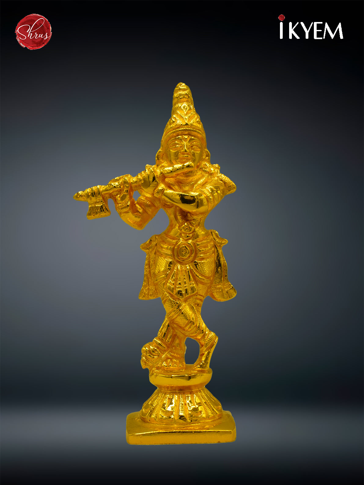 A beautiful idol of the Lord Krishna in a playful pose, handcrafted from the finest bronze. The idol is finished in 24 Gold Plated Finish.The idol is set on an elegant pedestal in a dancer’s posture exhibiting fluid symmetry. He sports delicate jewellery and in his hands he bears a Golden flute with which he plays mesmerising melodies that lull all of life.The Krishna idol is said to attract fertility and prosperity into the home. The protective lacquer coating on the surface keeps it from tarnishing even with daily puja and abhishekam.
