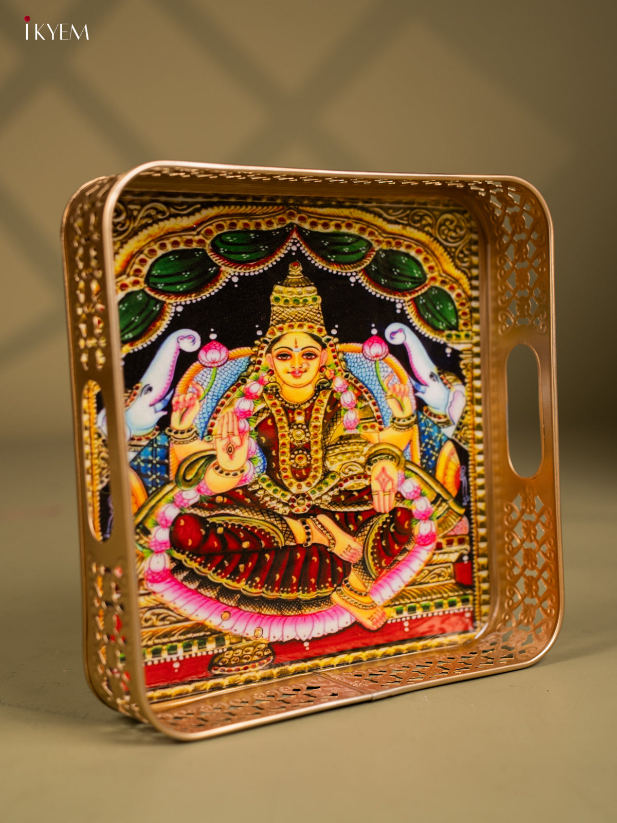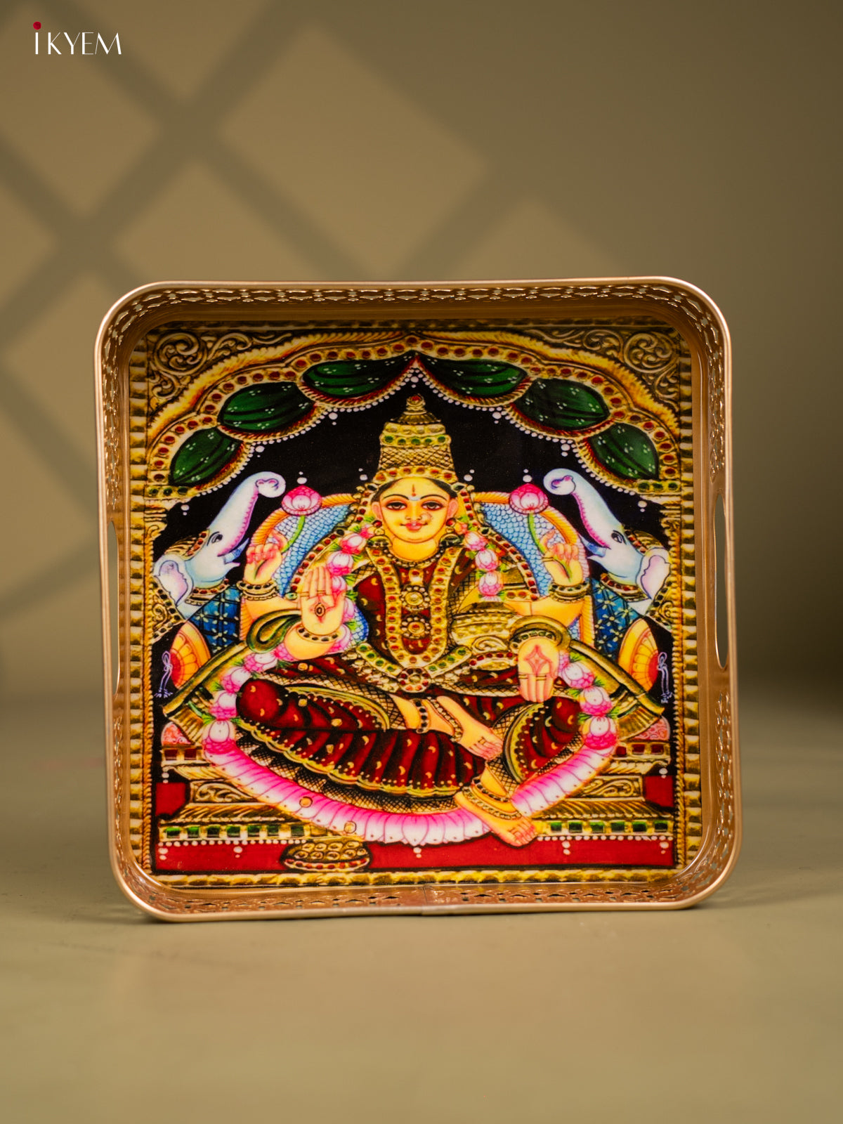 - Infuse your celebrations with divine grace through this vibrant 10-inch square metal tray featuring Goddess Gajalakshmi flanked by two intricately illustrated elephants.