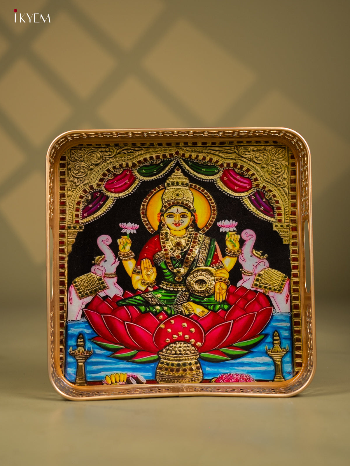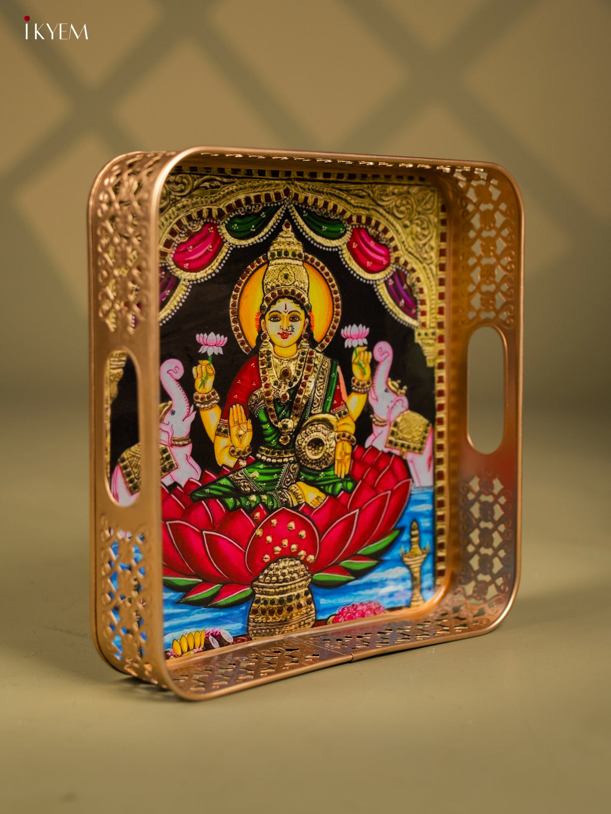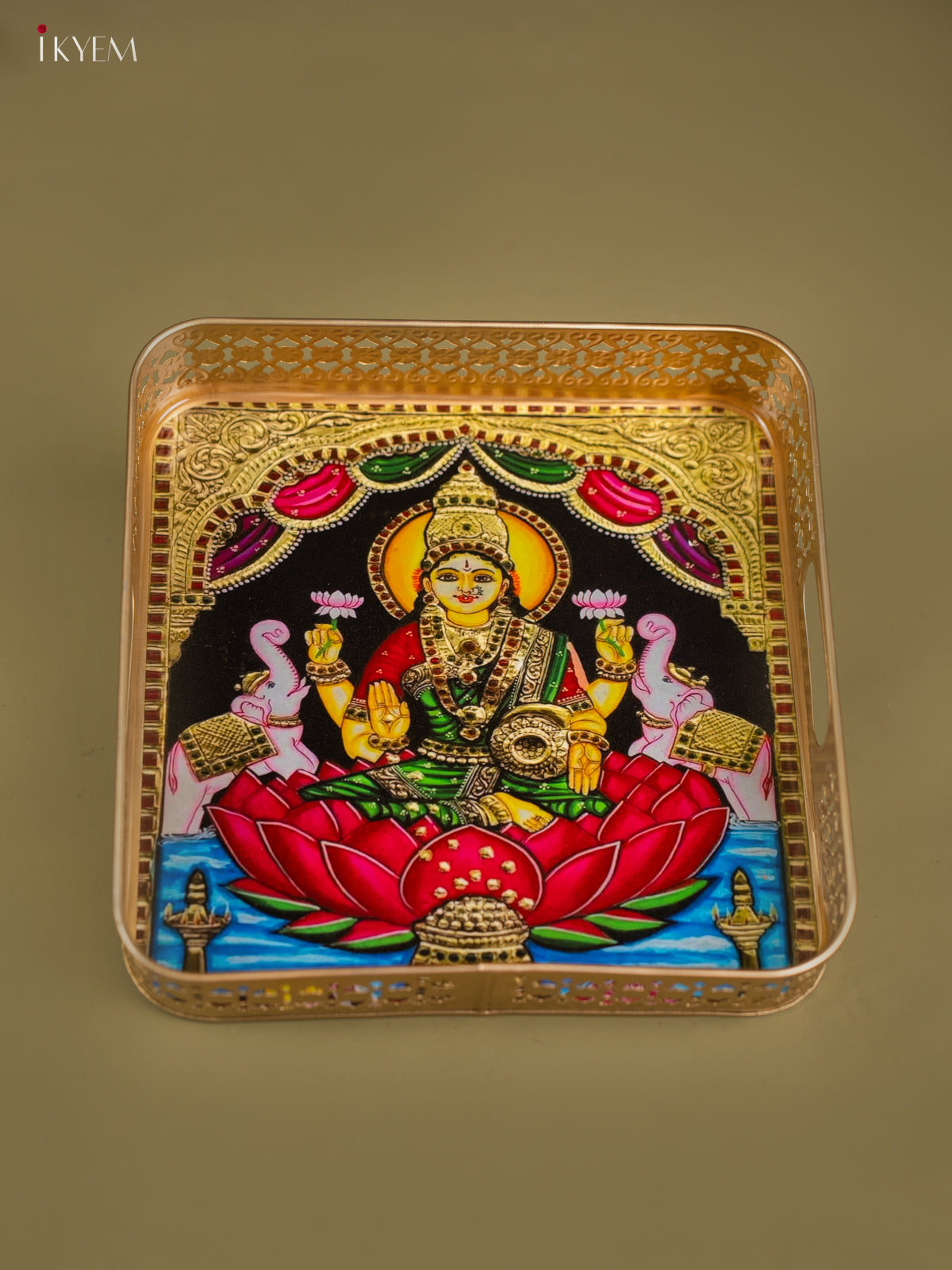 - This 10-inch square metal tray featuring Godess Gajalakshmi with twin elephants is a divine pick for pooja decor and ideal return gift ideas for festive celebrations.