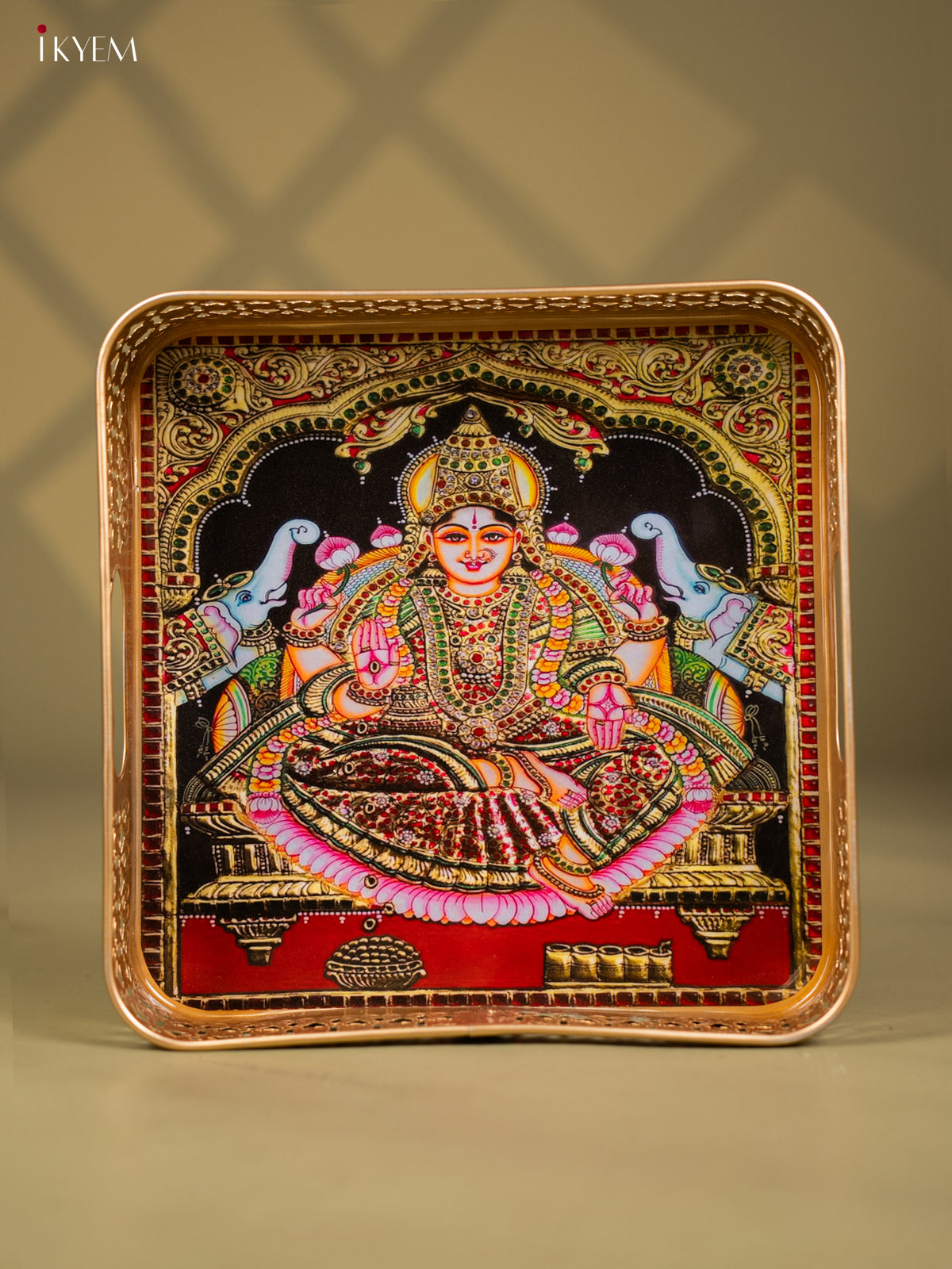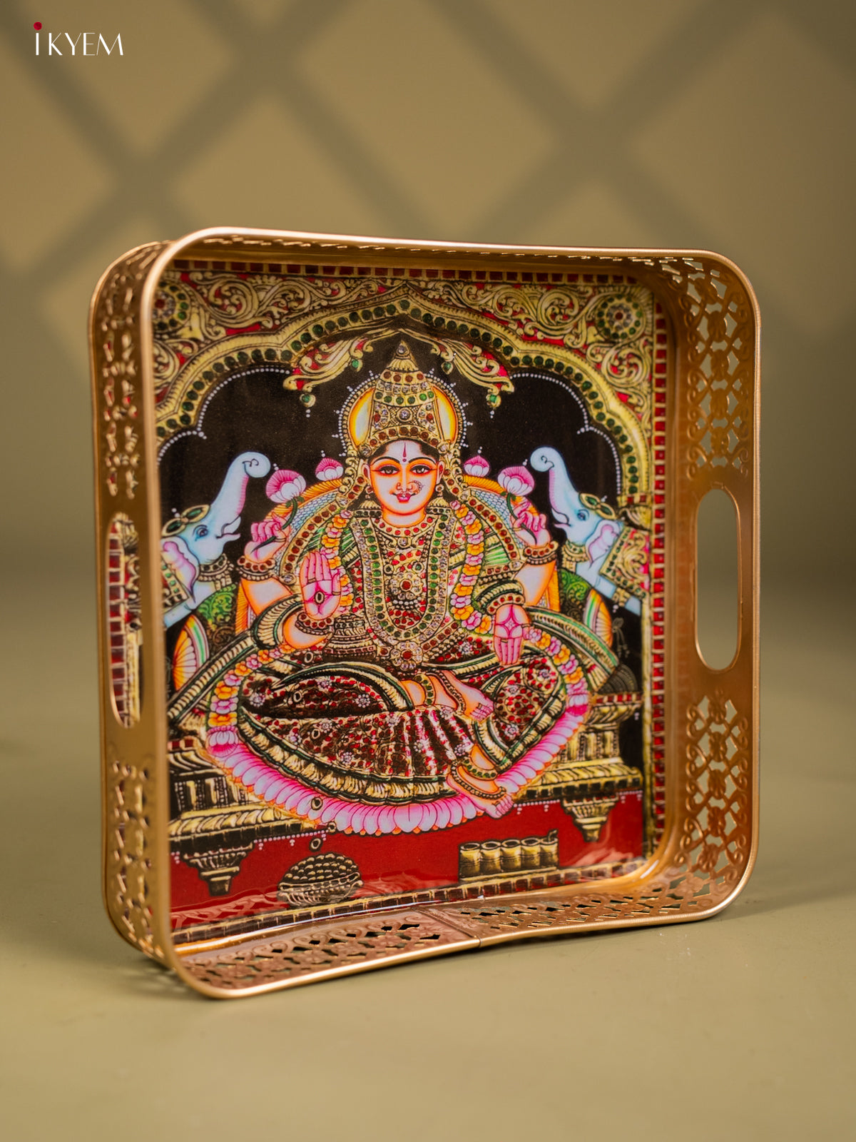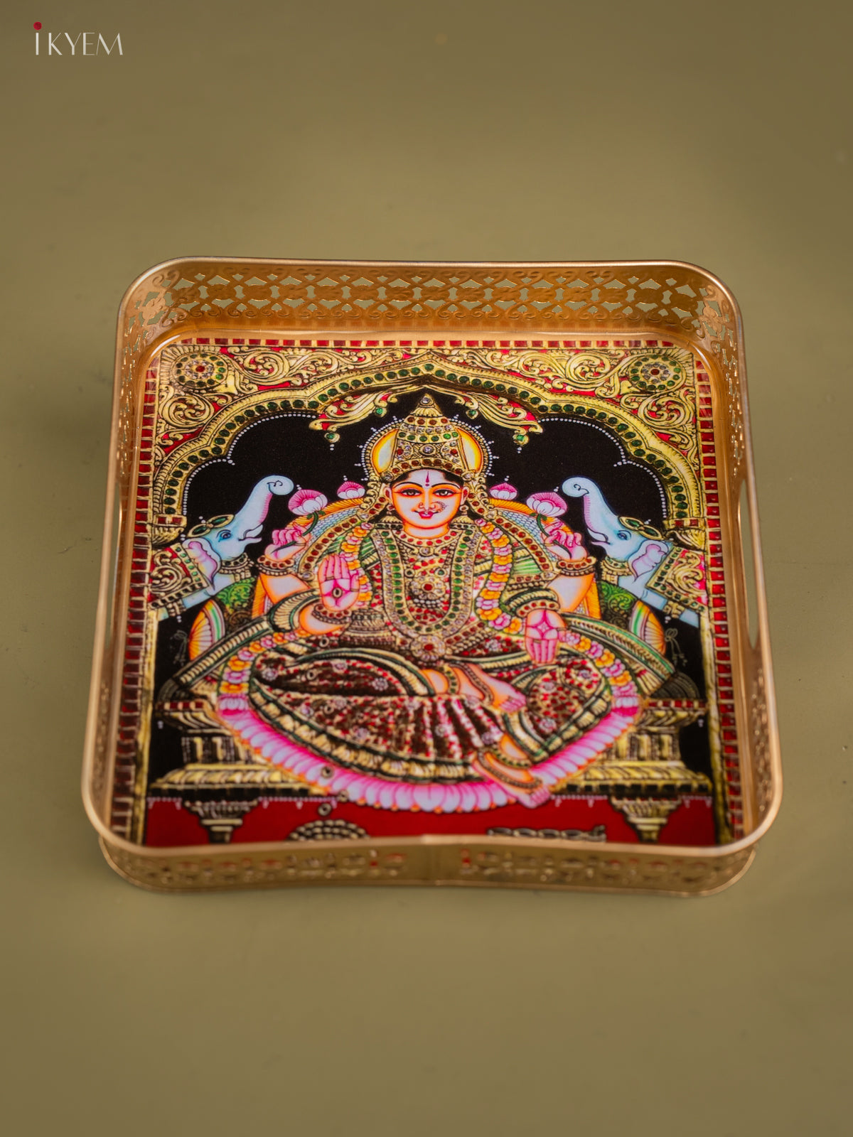 Goddess Gajalakshmi Printed Square Metal Tray with Twin Elephants - KF25146