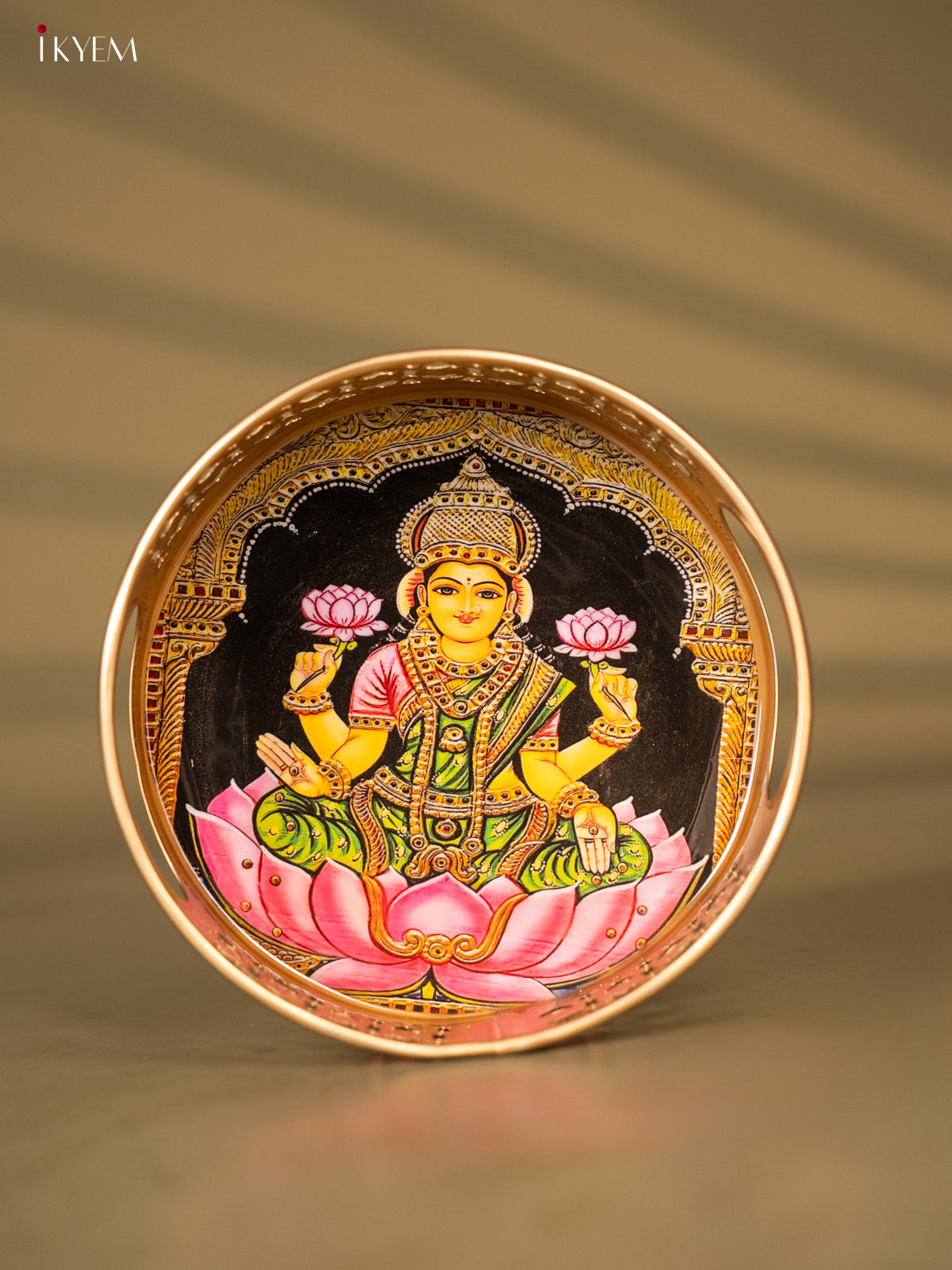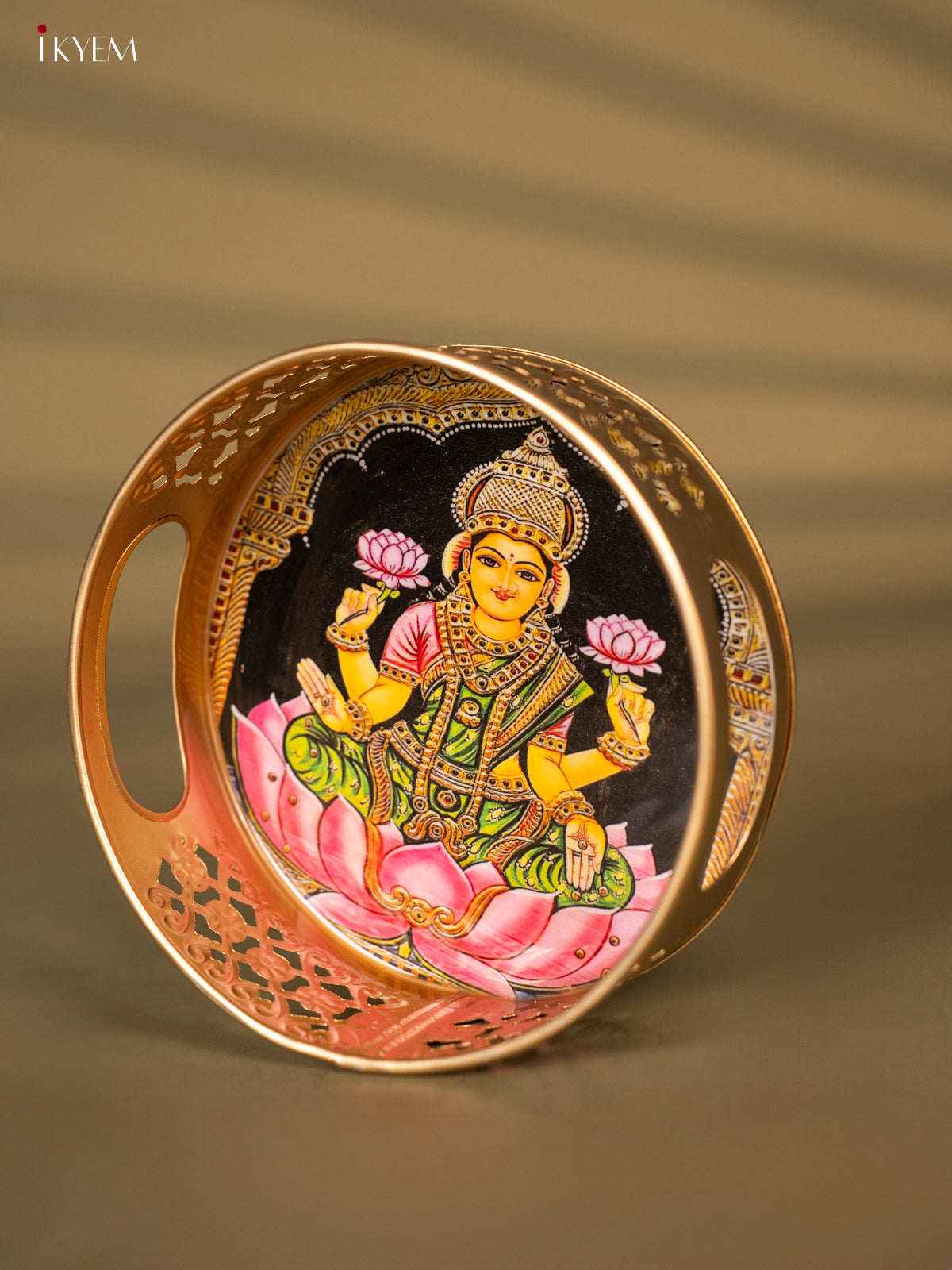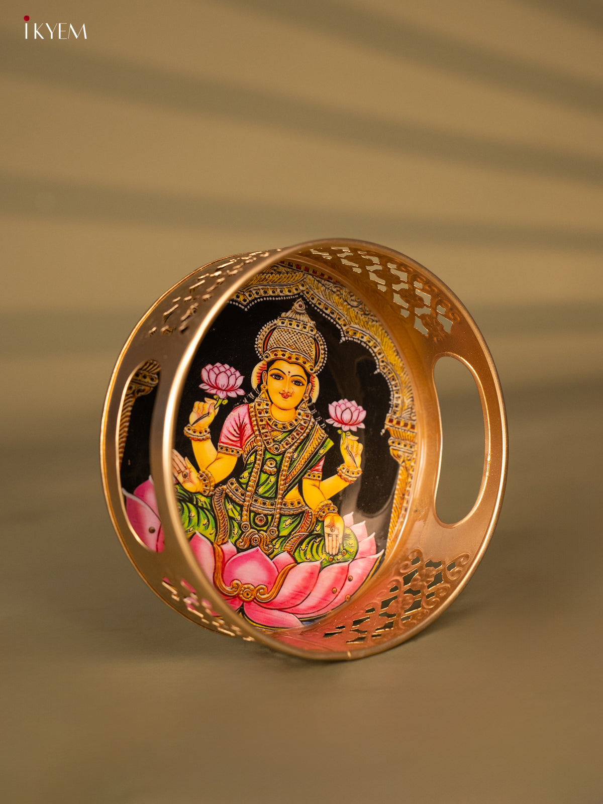 - Enhance your pooja rituals and home decor with this 6-inch Digital Metal Tray featuring a vibrant depiction of Goddess Lakshmi with a pink lotus.
