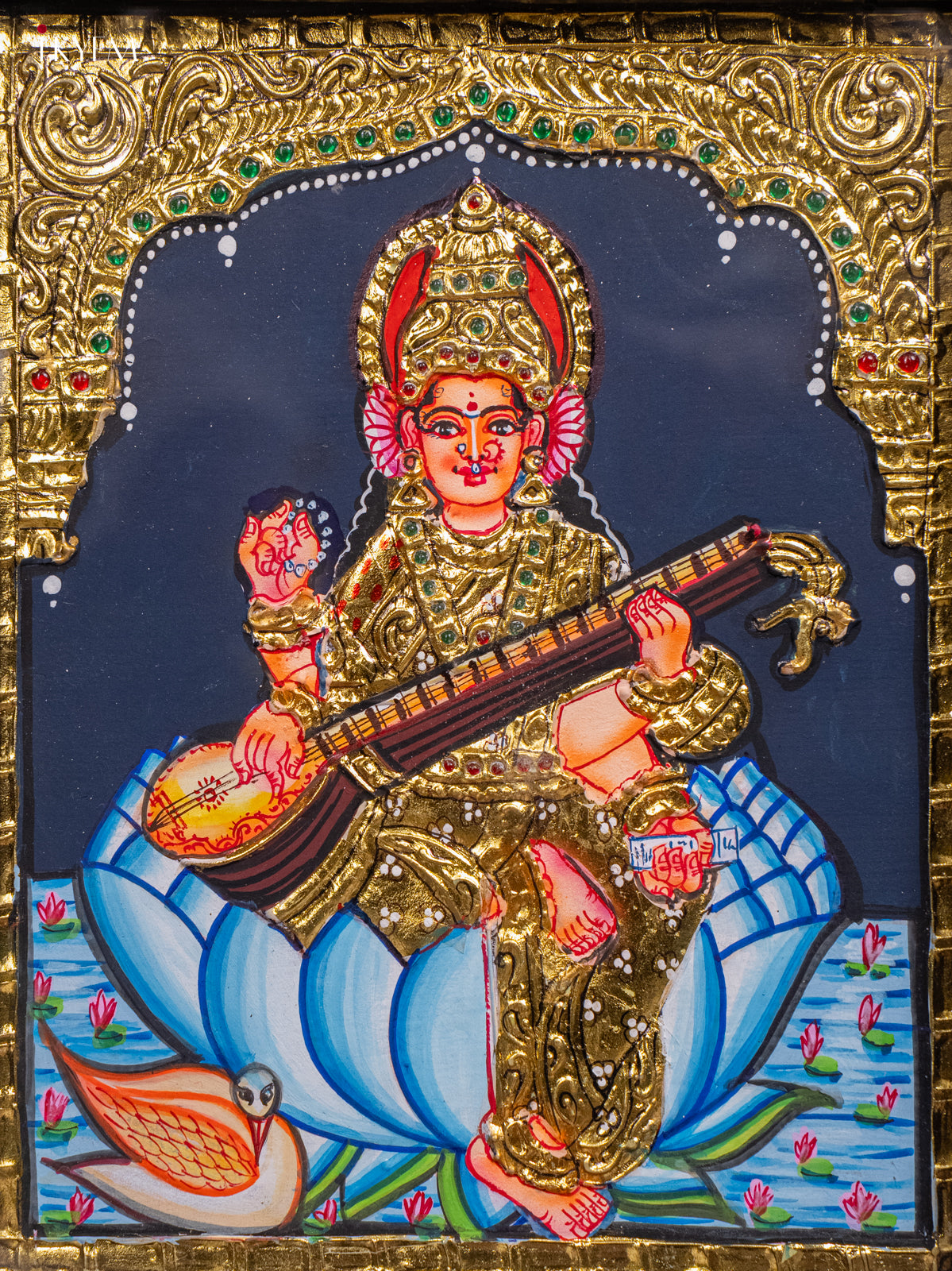 - This 13 x 11-inch Saraswathi Tanjore painting features traditional design and vibrant colours, Perfect for enhancing your pooja room, it also makes an elegant wall hanging decor piece that draws attention with its traditional charm..
