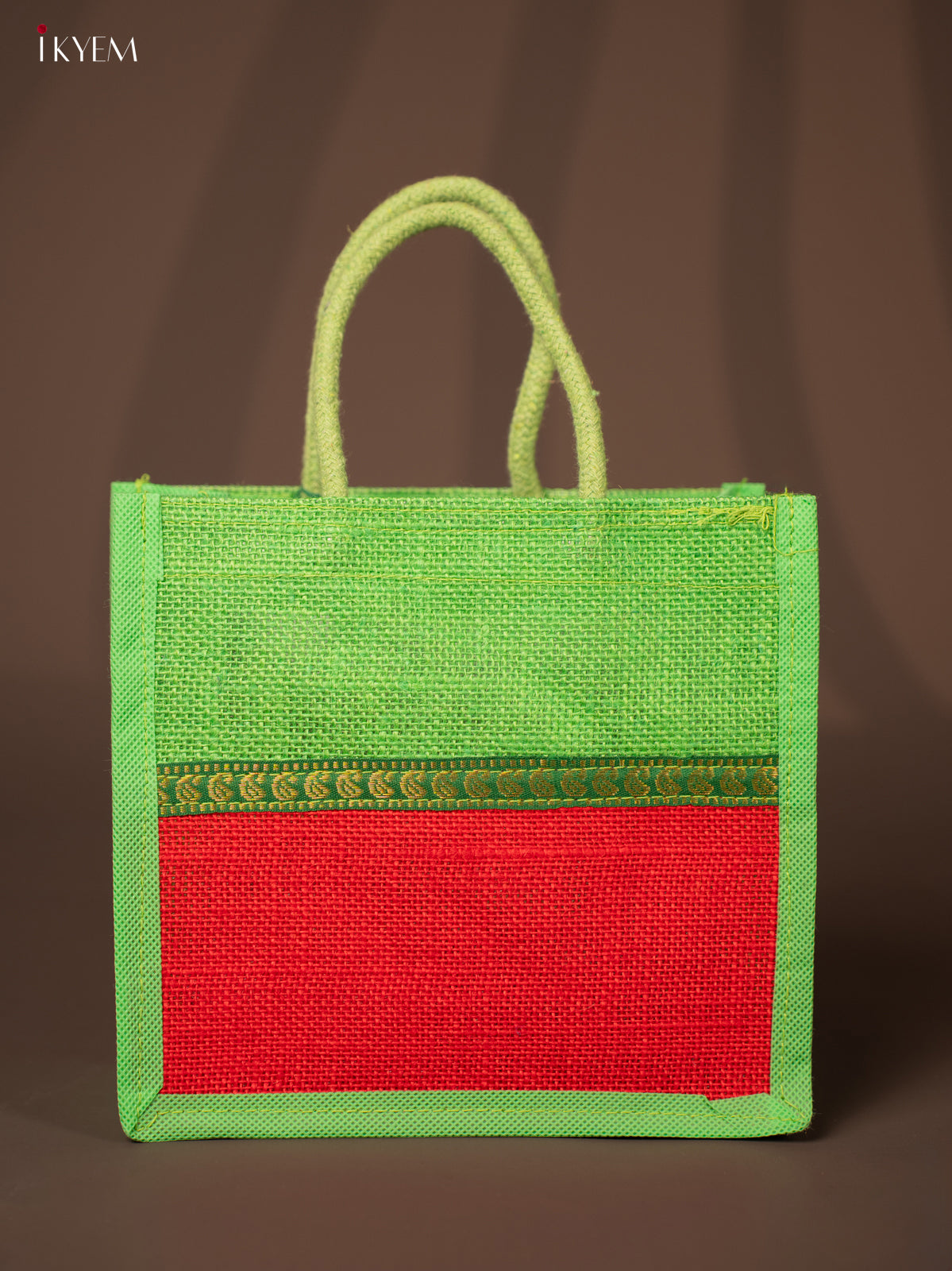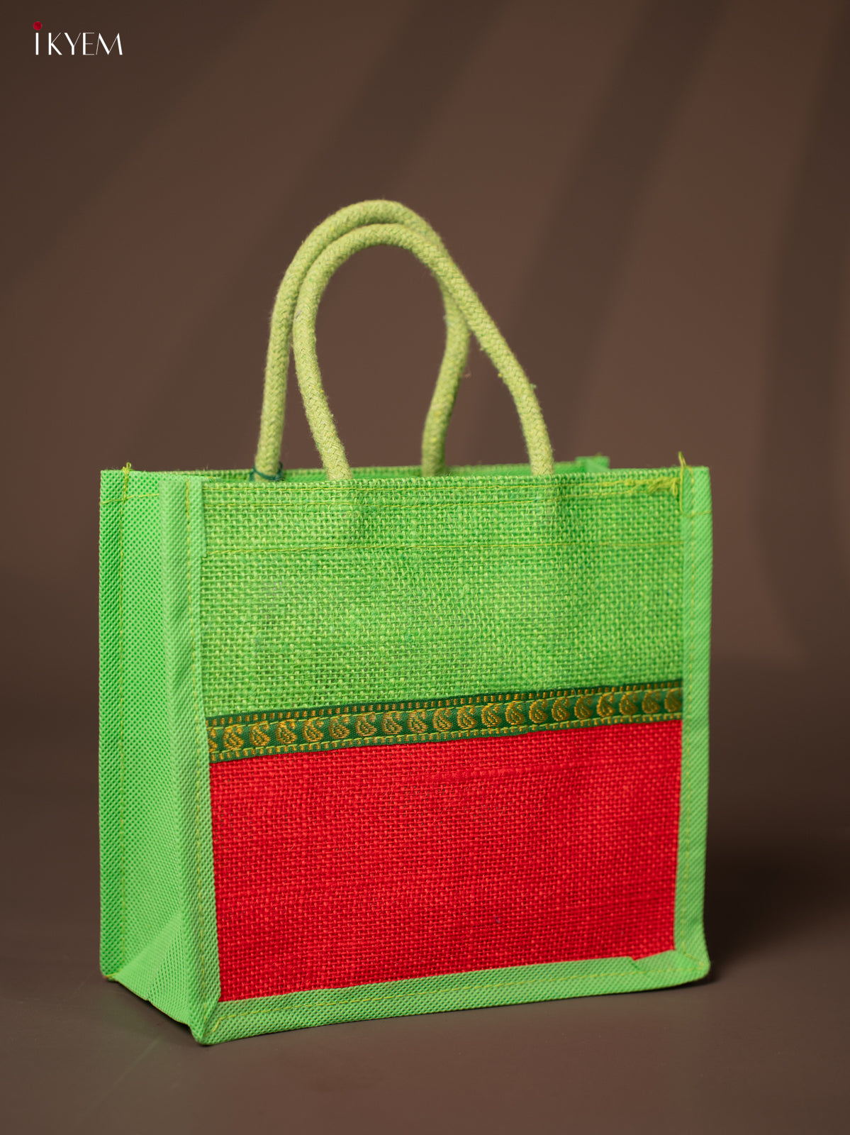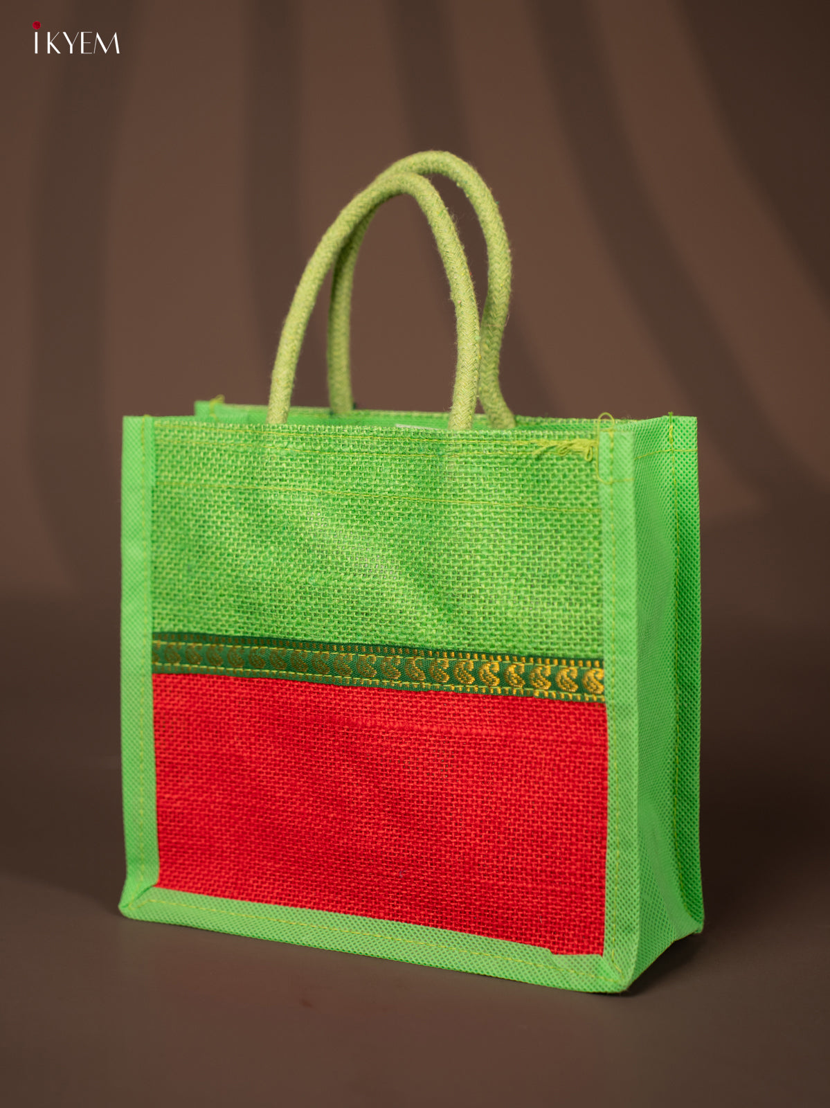 - This green jute bag features a red 8-inch Velcro closure, sturdy rope handles, and an elegant zari strip.