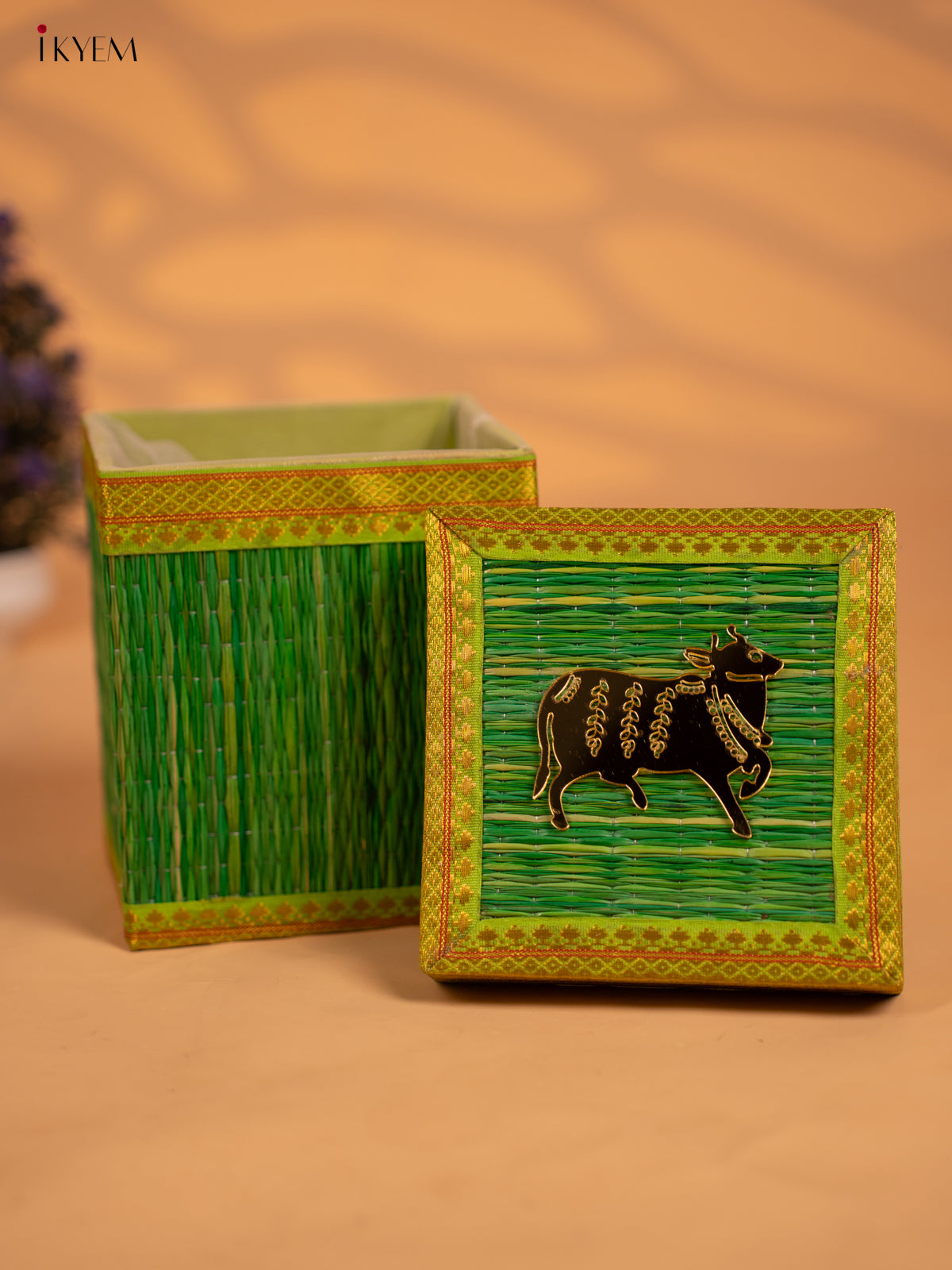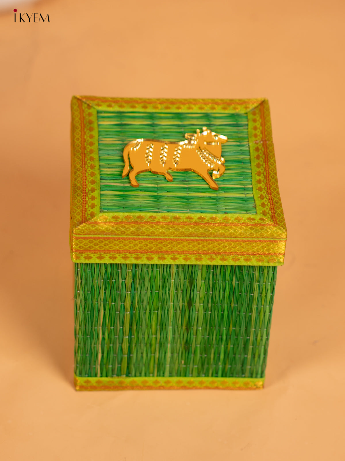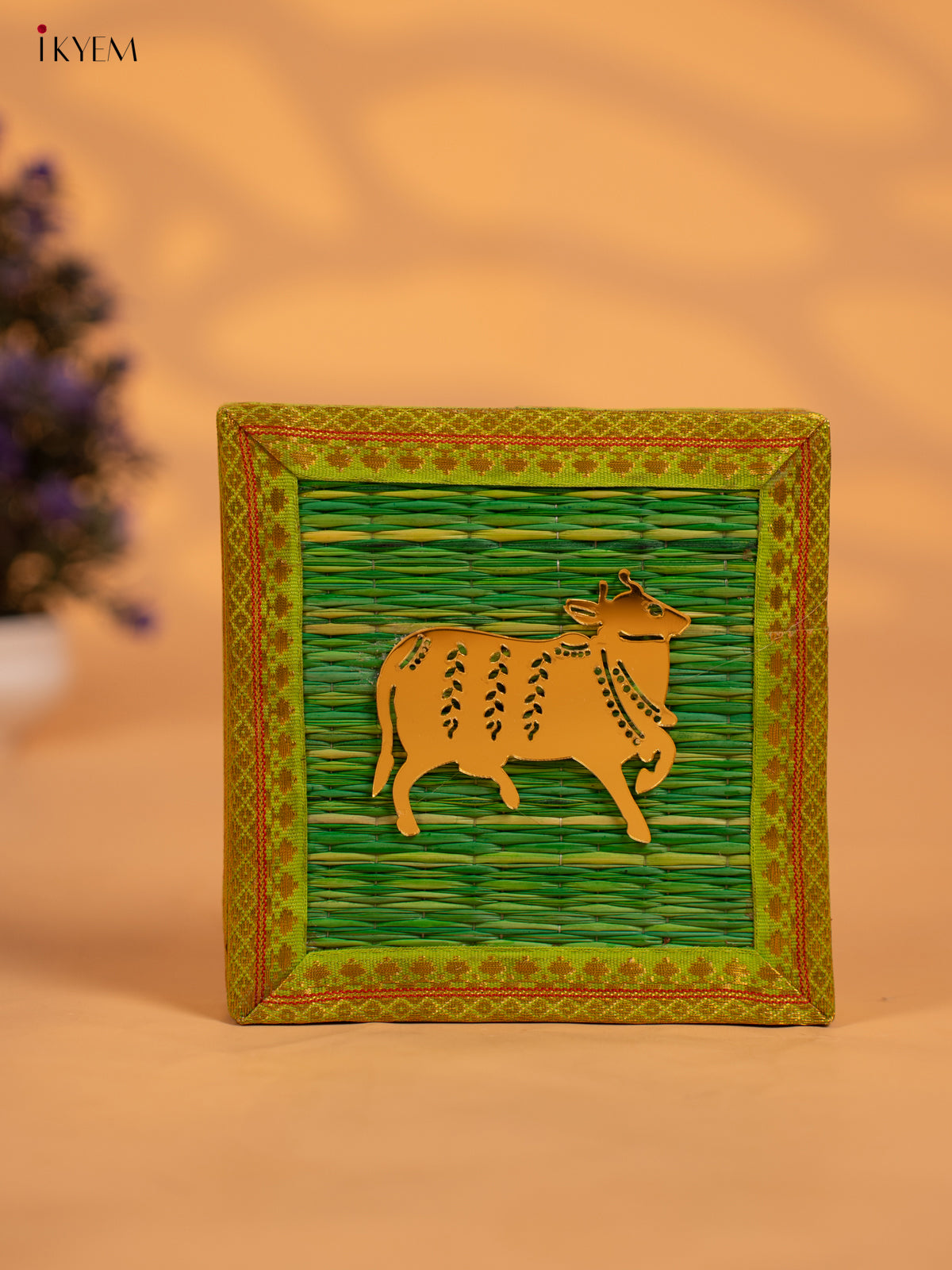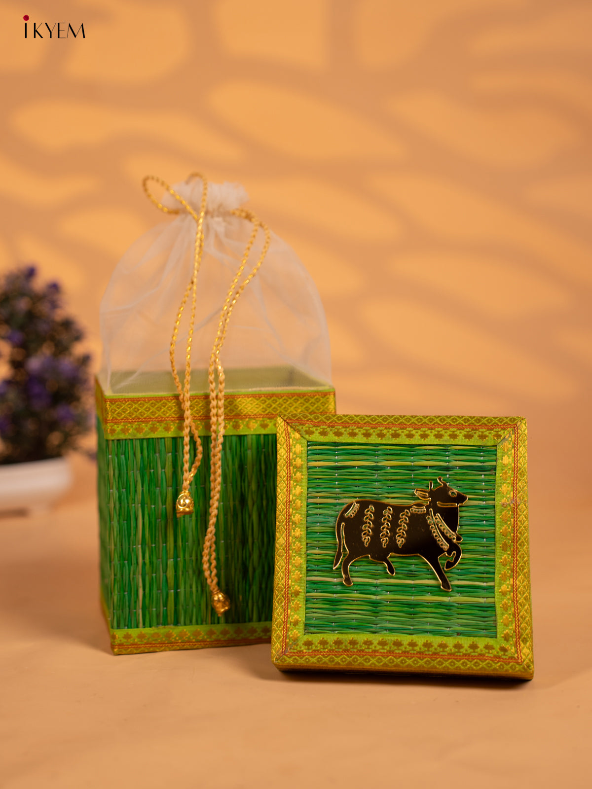- Enhance your gift giving with our Green Korai Gift Box and Net Potli featuring a beautiful Cow motif.