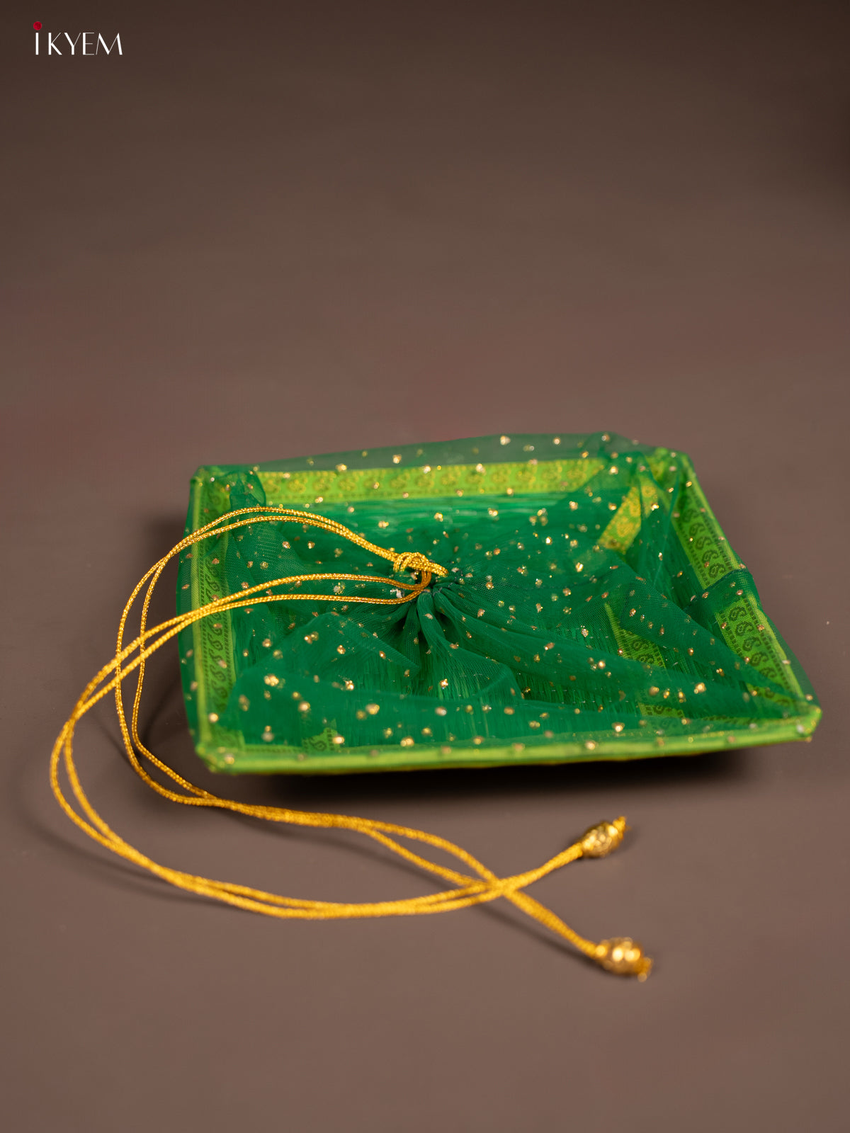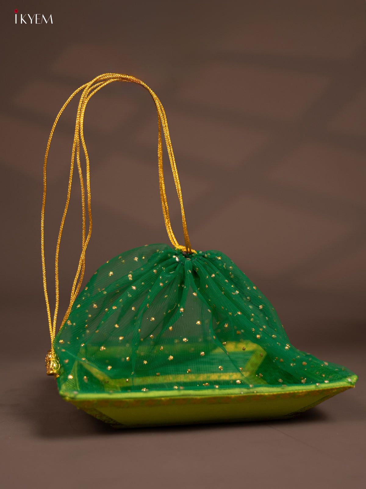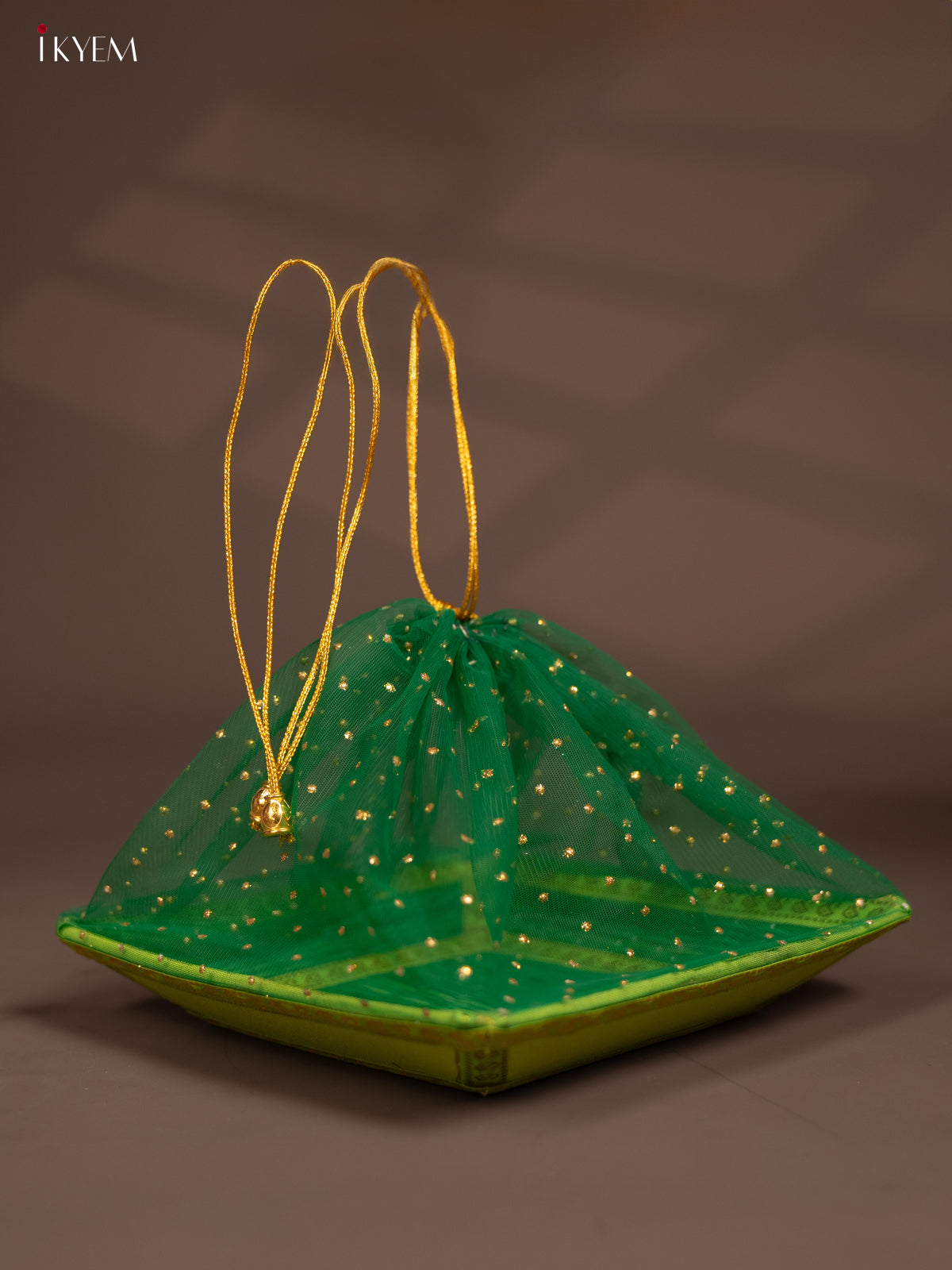 - Elegant green Korai stackable tray paired with a matching potli bag, perfect for traditional thamboolam presentations or as a thoughtful return gift.