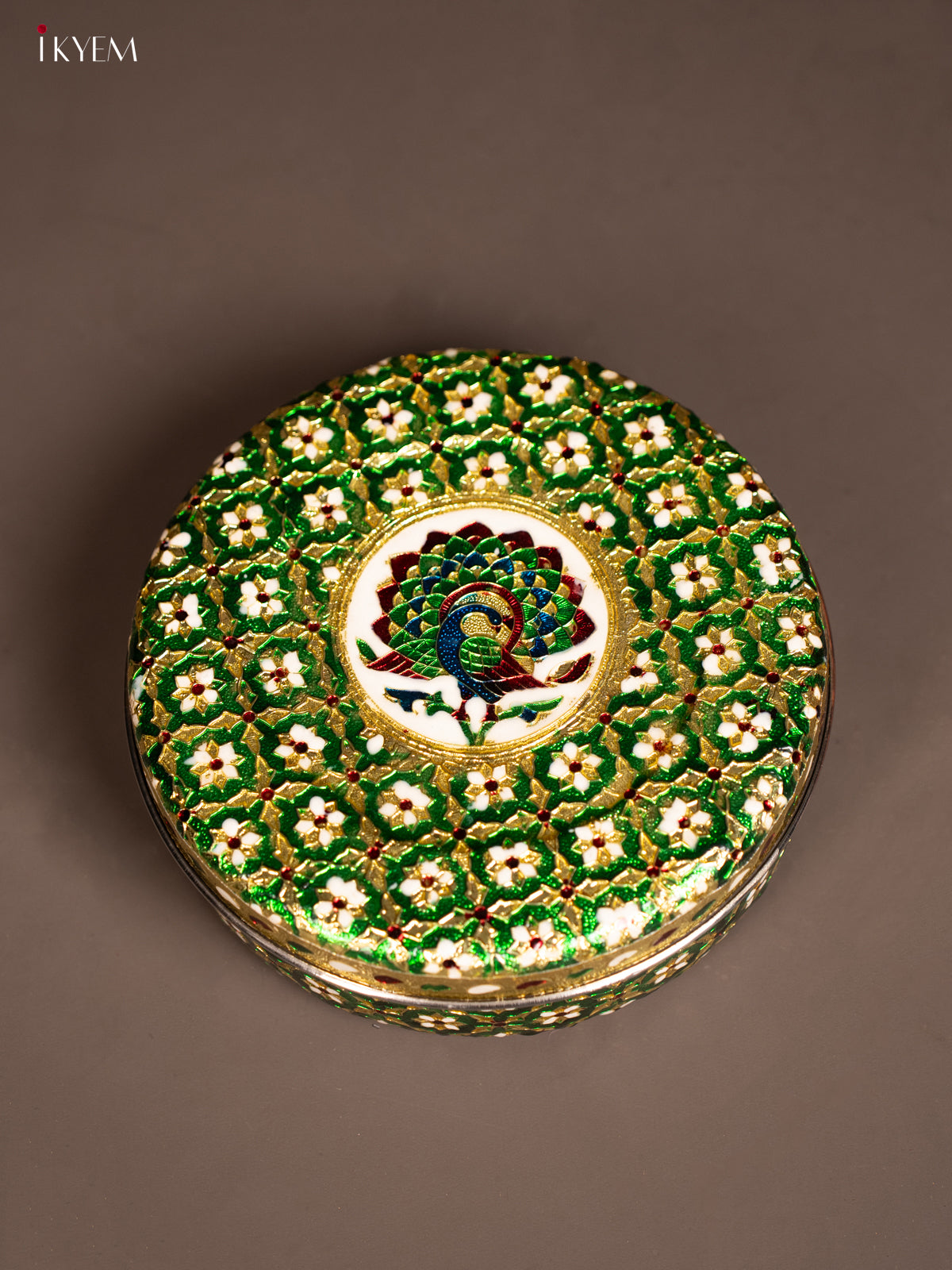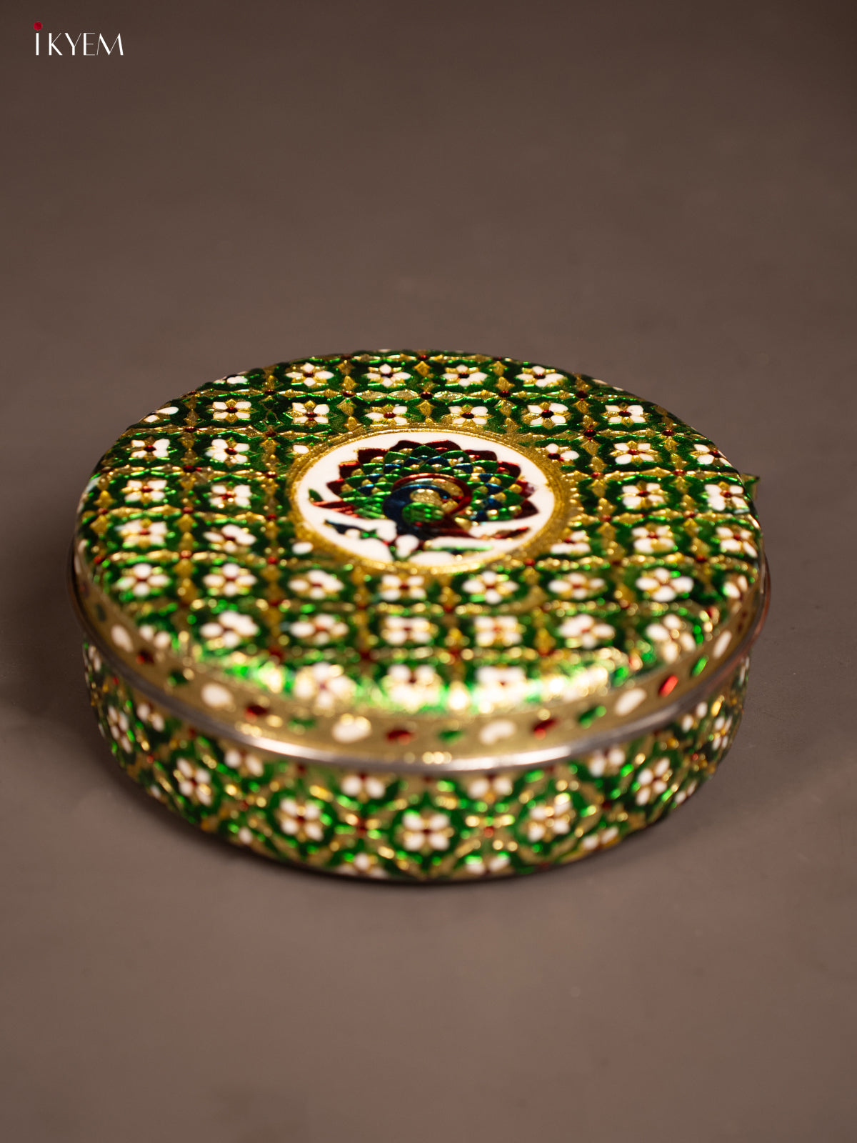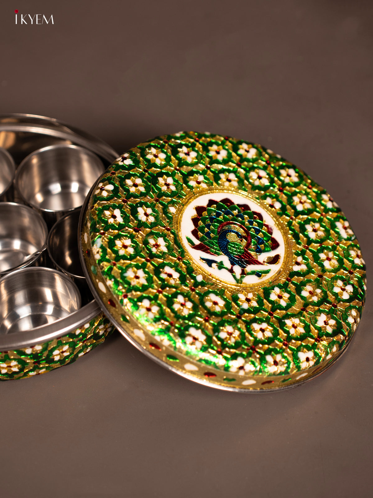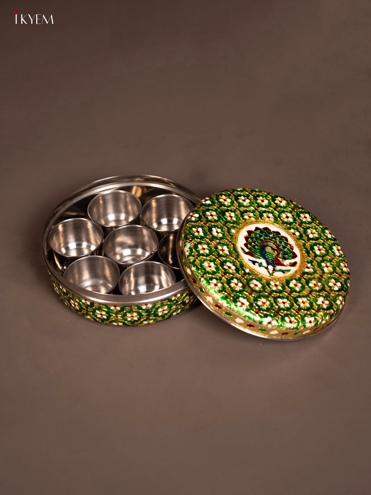 - The Meenakari Masala Box in green combines traditional craftsmanship with practical design, offering a stylish and organized way to store your spices.