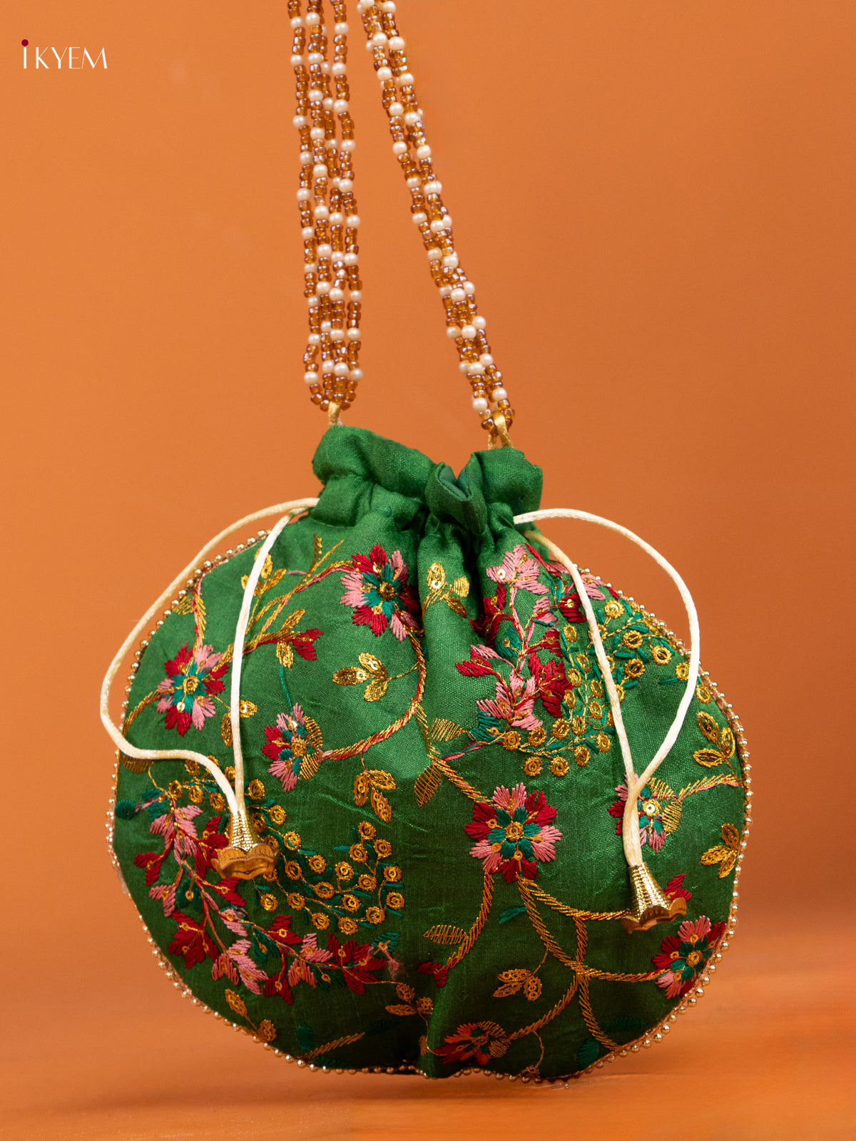 - This Green Gold Zari Potli Bag exemplifies technical mastery through its precisely rendered floral embroidery.
