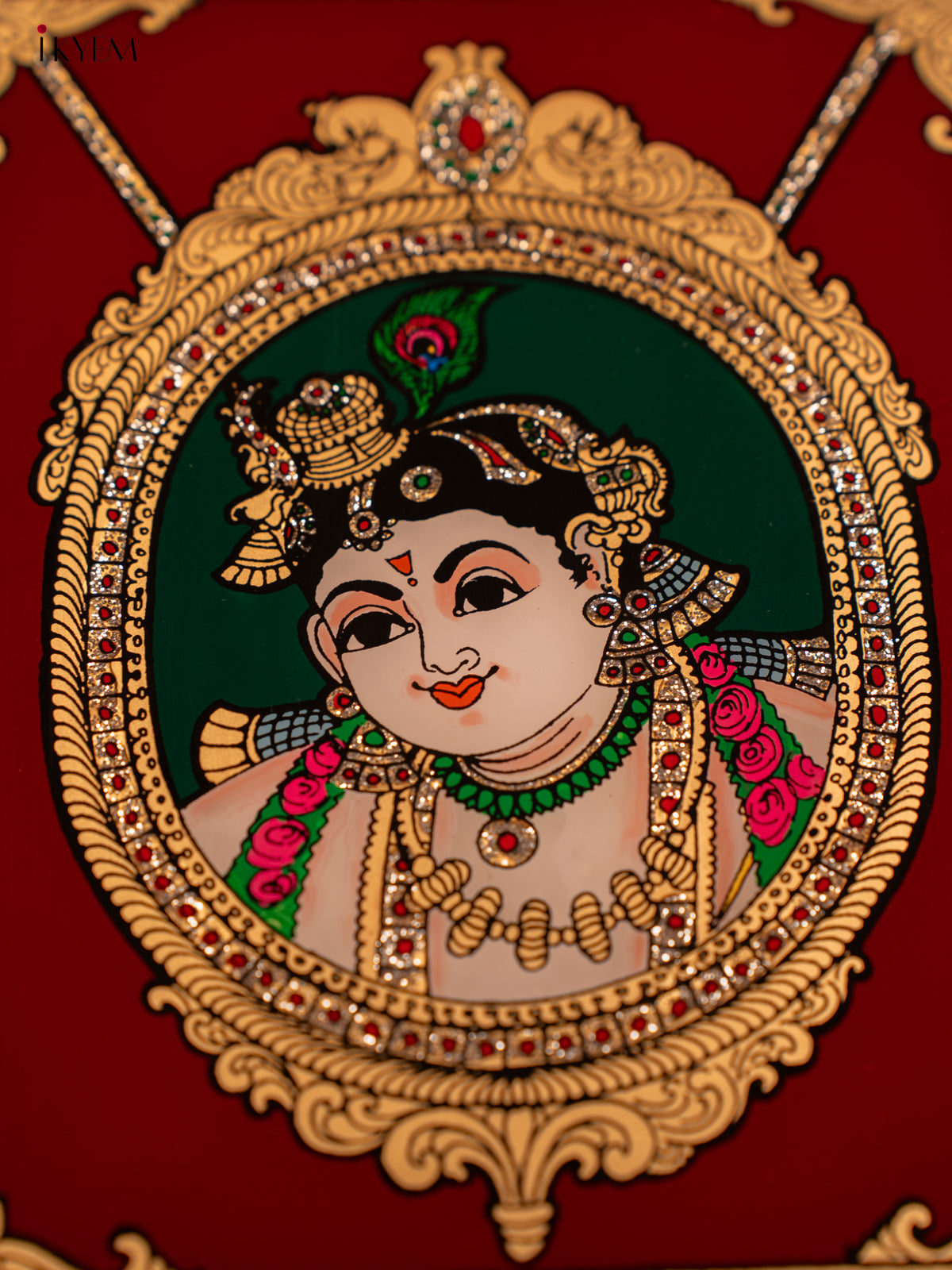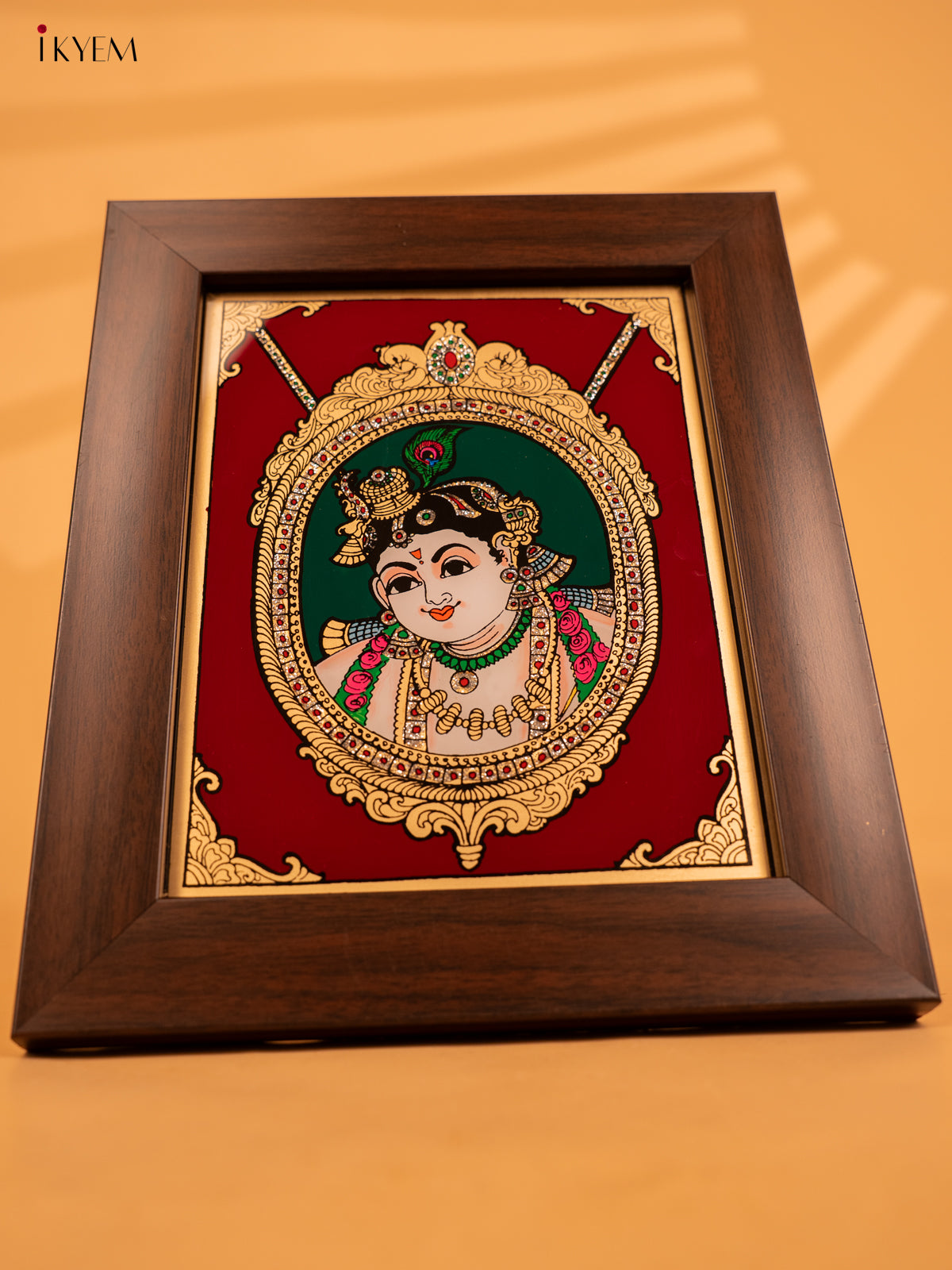 • This Reverse Glass Painted Photo Frame features a unique design of Krishna, perfect for decorating your pooja room.