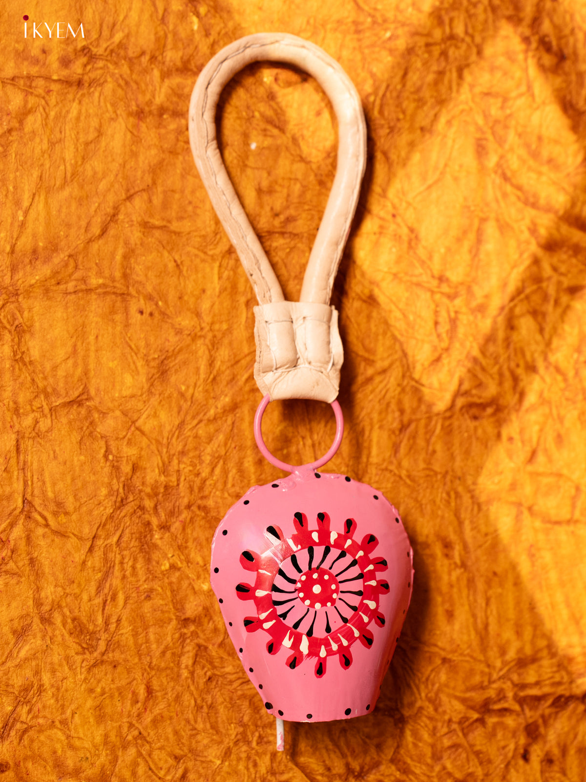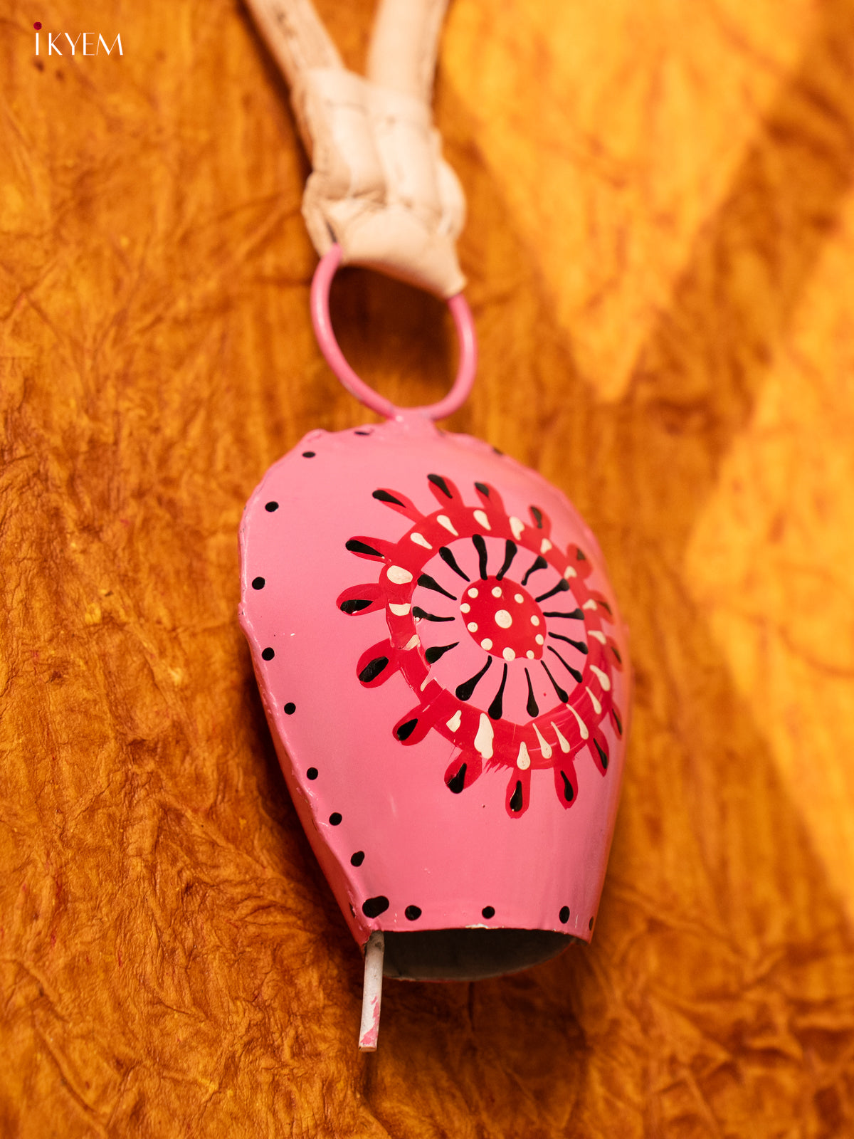 Hand Painted Cow Bell with Leather Handle- Small - Pink with Red - KA11116