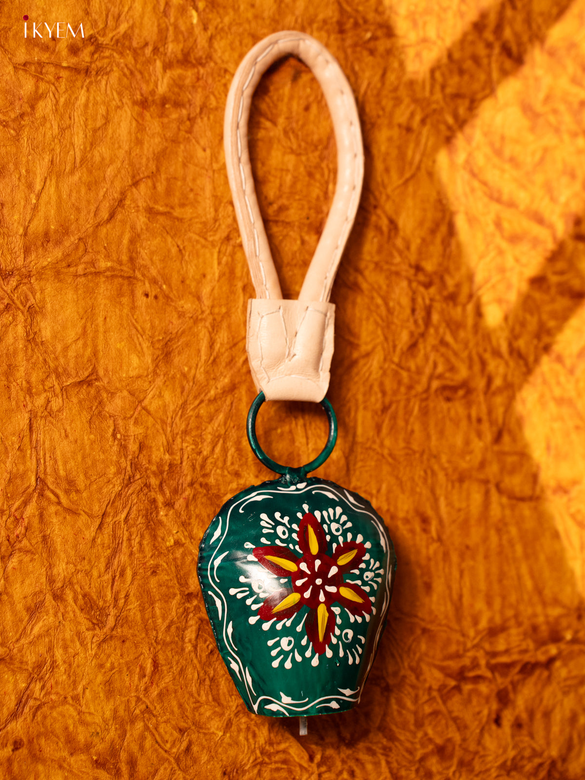 Hand Painted Cow Bell with Leather Handle - Small - Green with Red - KA11121
