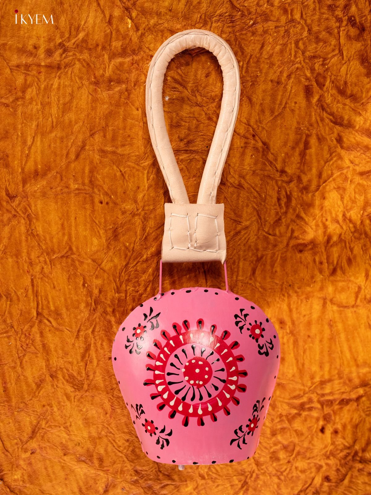 Hand Painted Cow Bell with Leather Handle - Medium - Pink with Red - KA11134