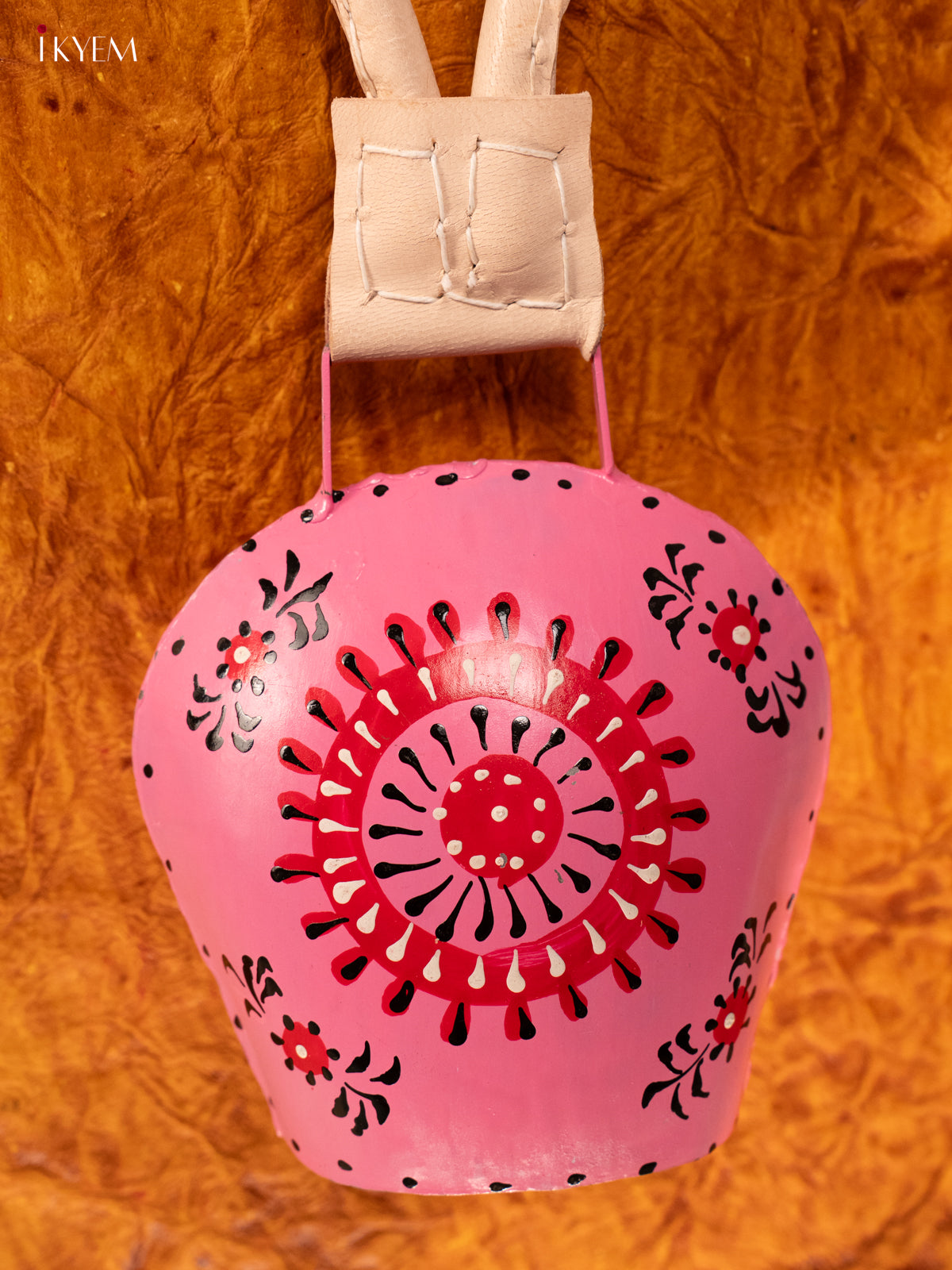 - Expertly crafted with hand-painted designs, this medium-sized cow bell boasts a sturdy leather handle for easy use.