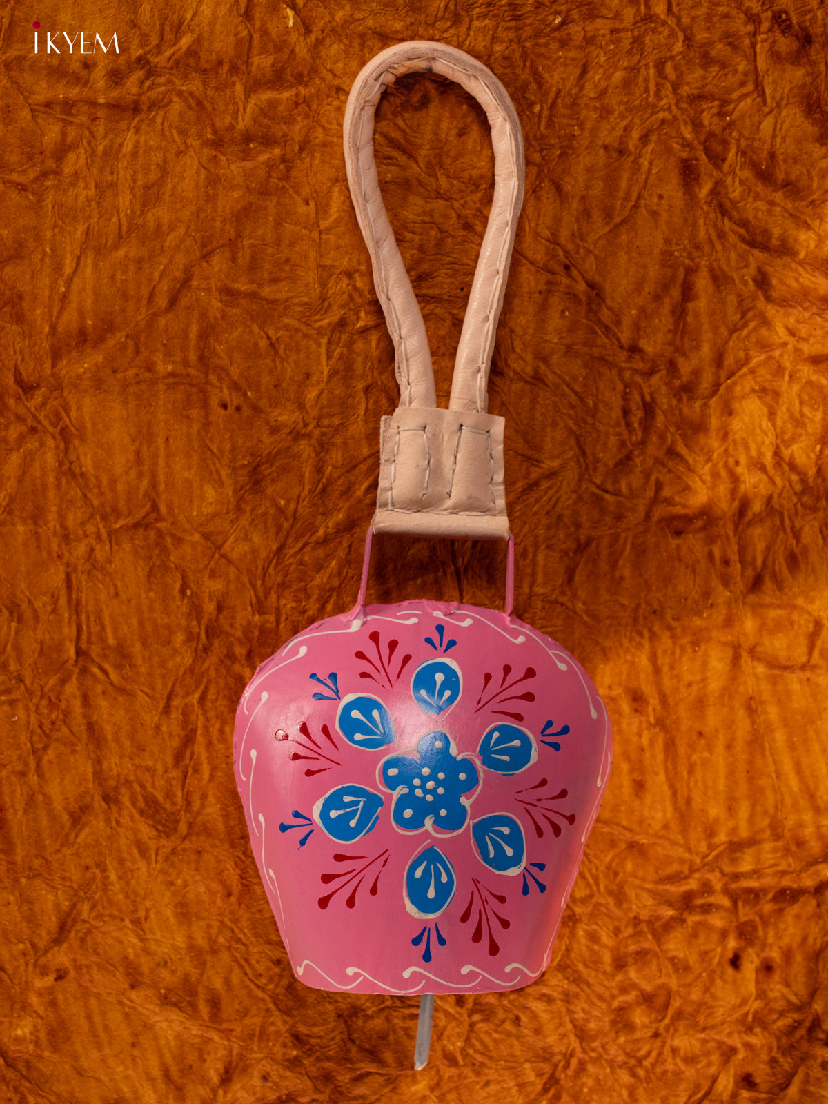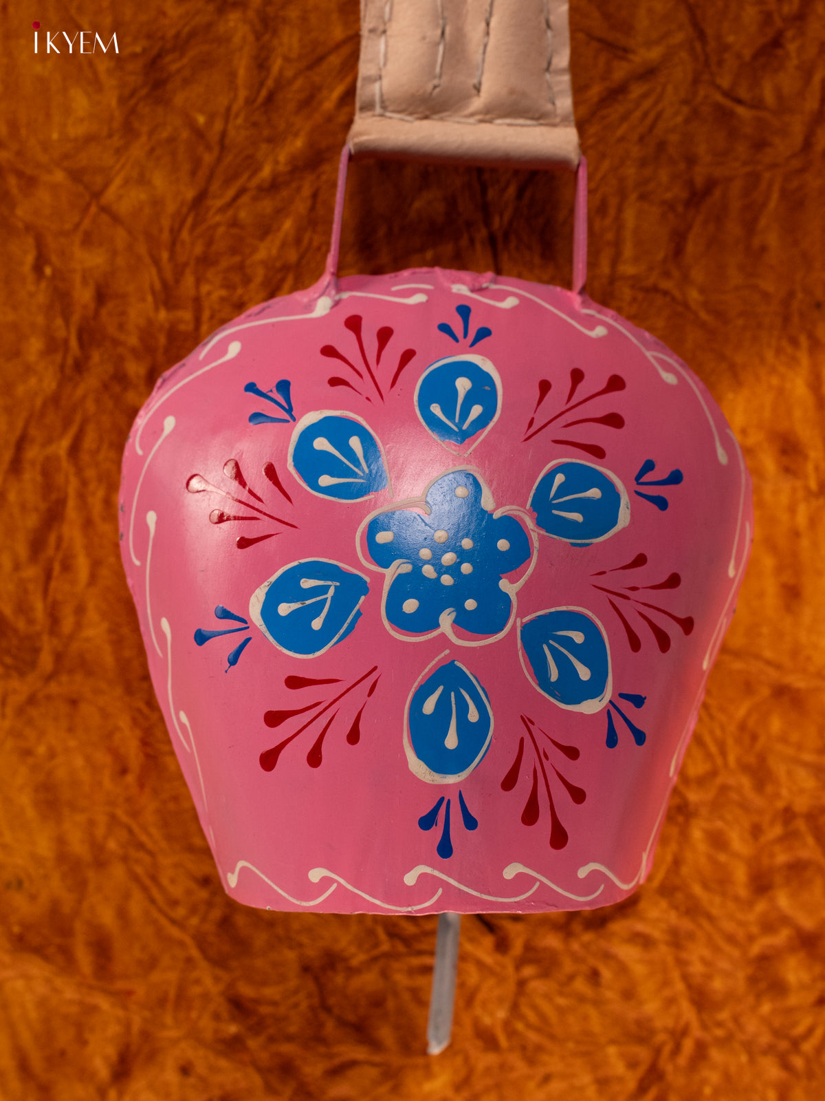 Hand Painted Cow Bell with Leather Handle - Medium - Pink with Blue - KA11135