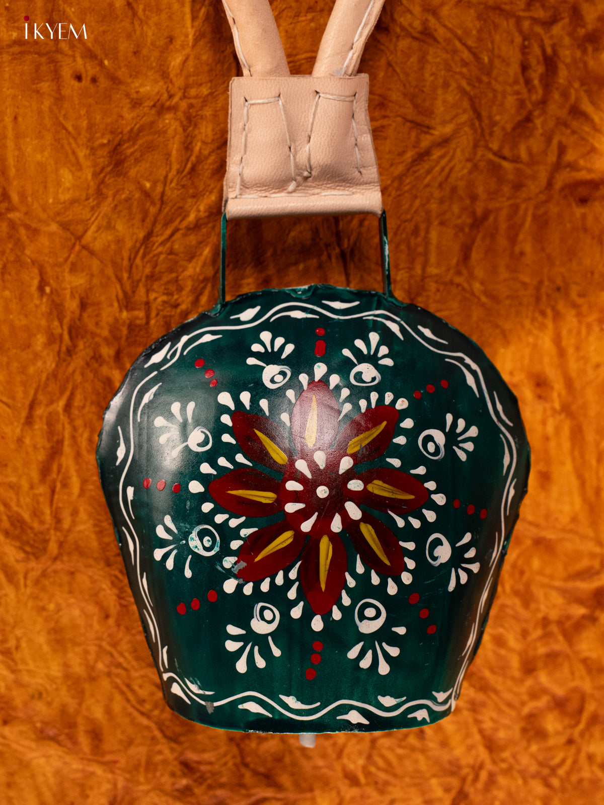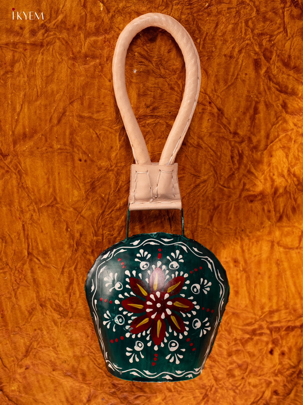 Hand Painted Cow Bell with Leather Handle - Medium - Green with Red - KA11138