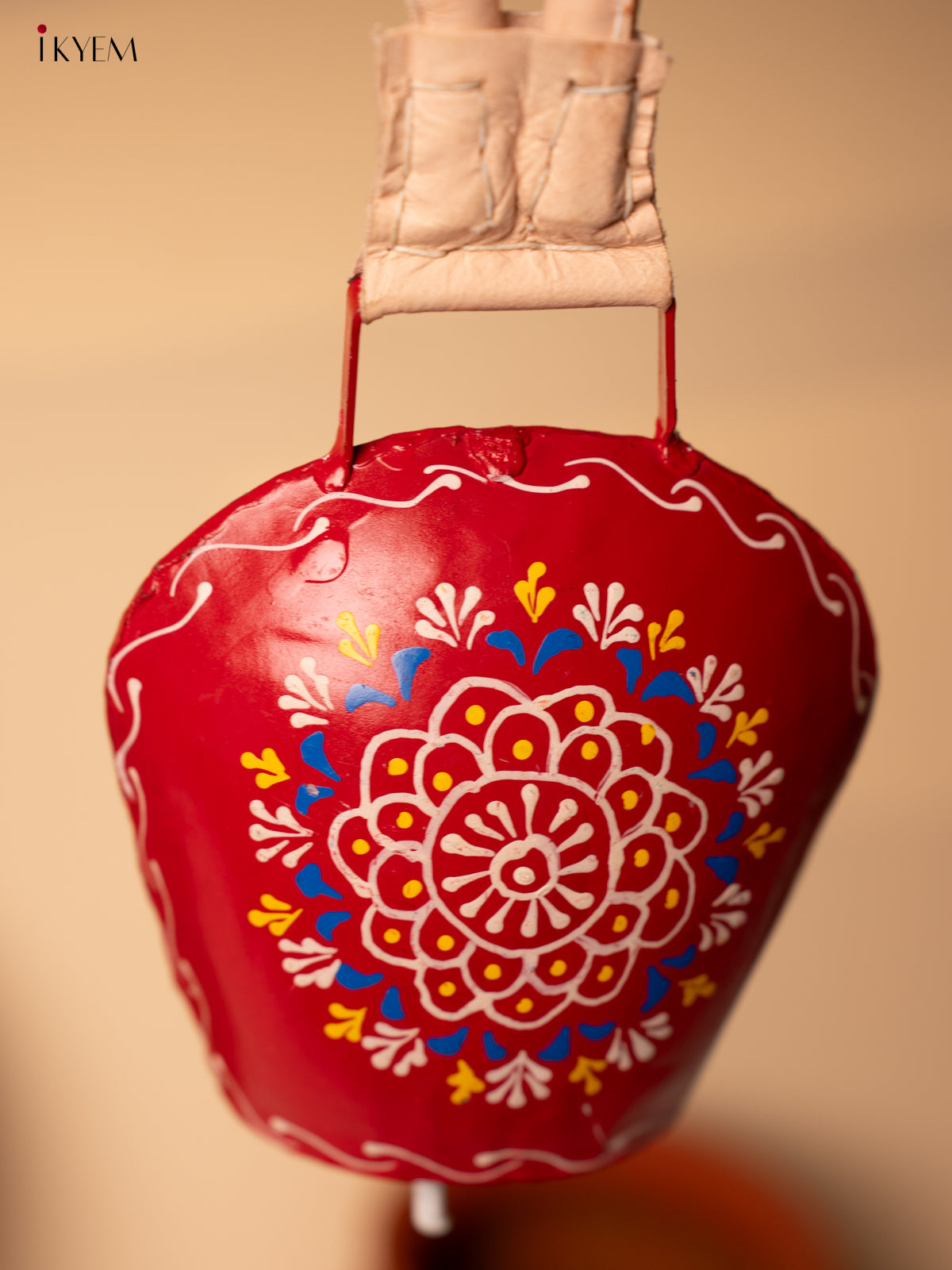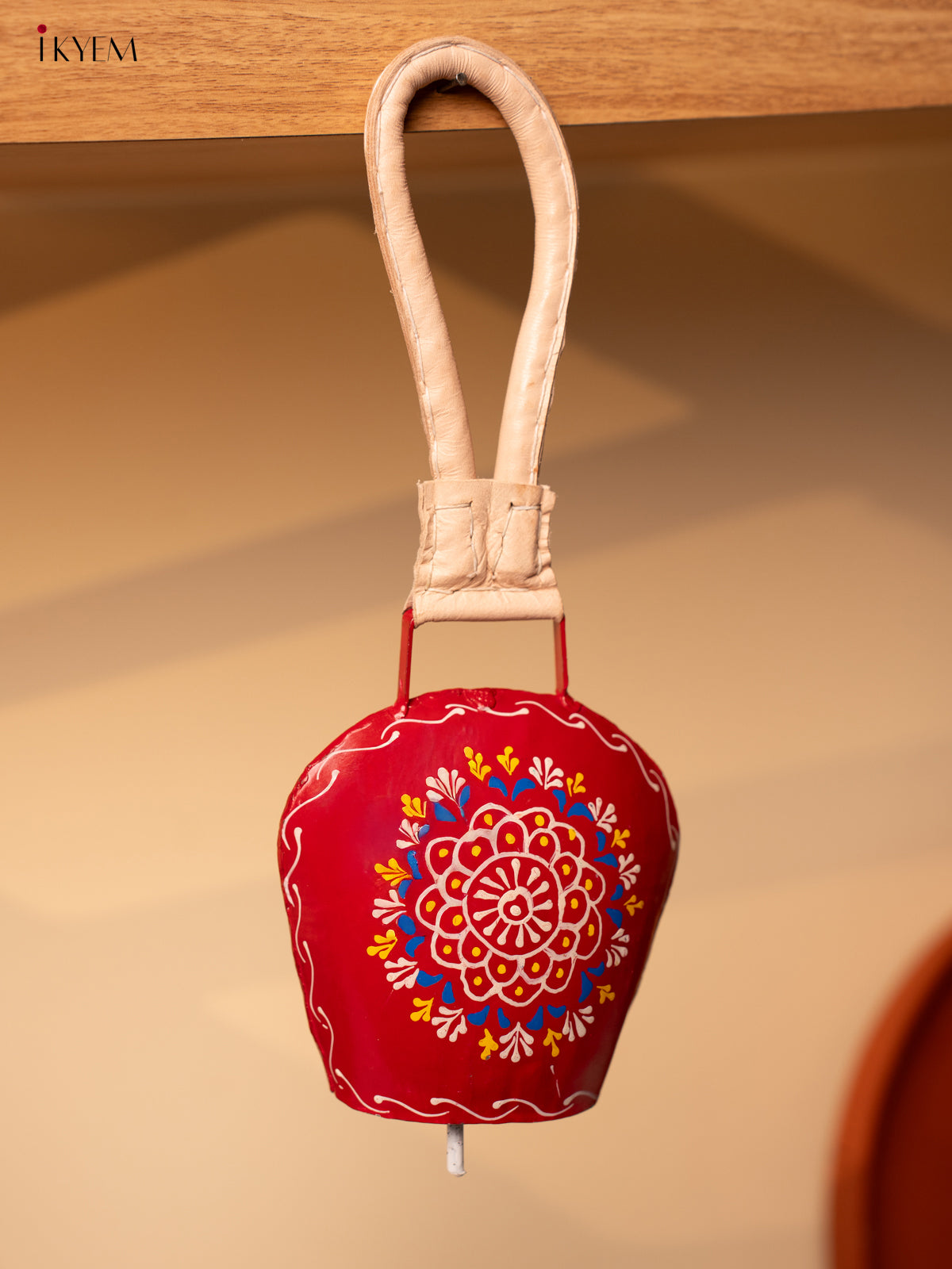 Hand Painted Cow Bell with Leather Handle - Medium - Red with White - KA11142