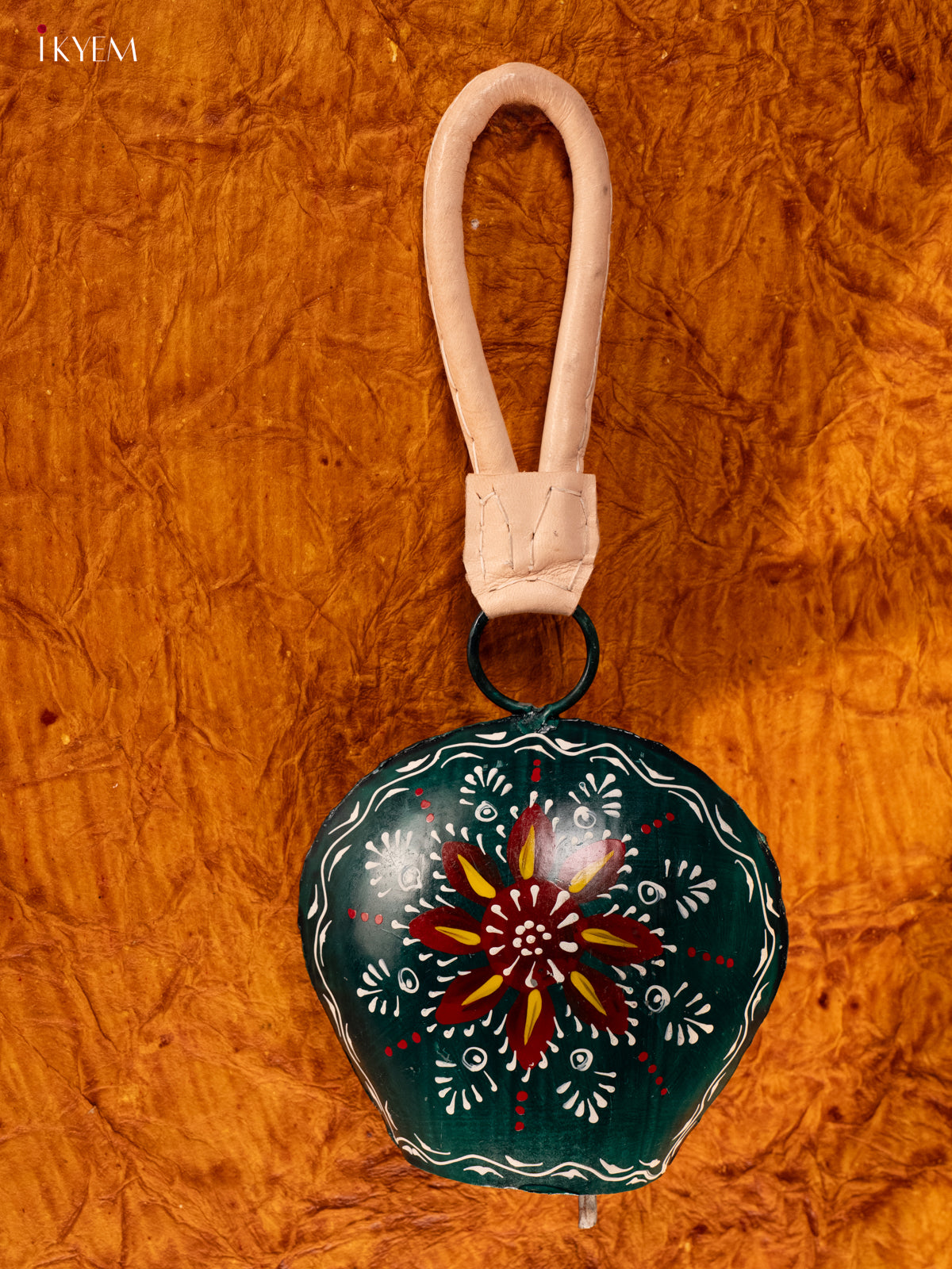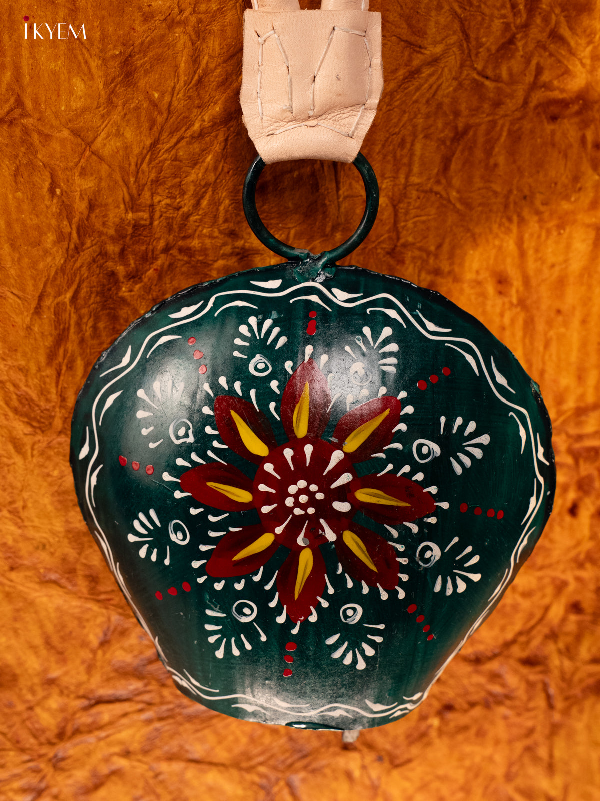 Hand Painted Cow Bell with Leather Handle - Big - Green with Red - KA11150