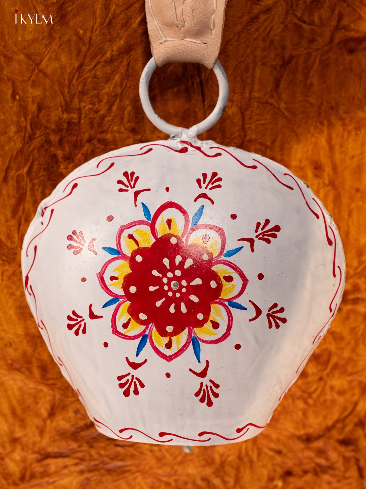 Hand Painted Cow Bell with Leather Handle - Big - White with Red - KA11151