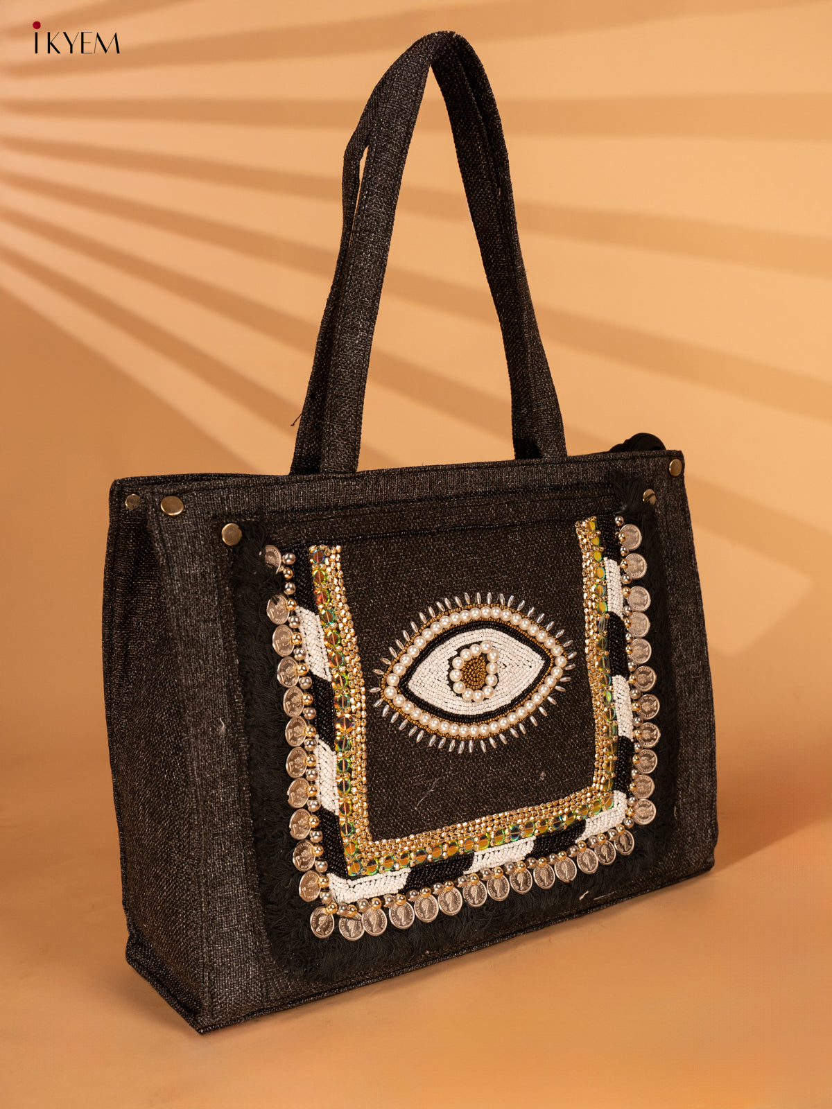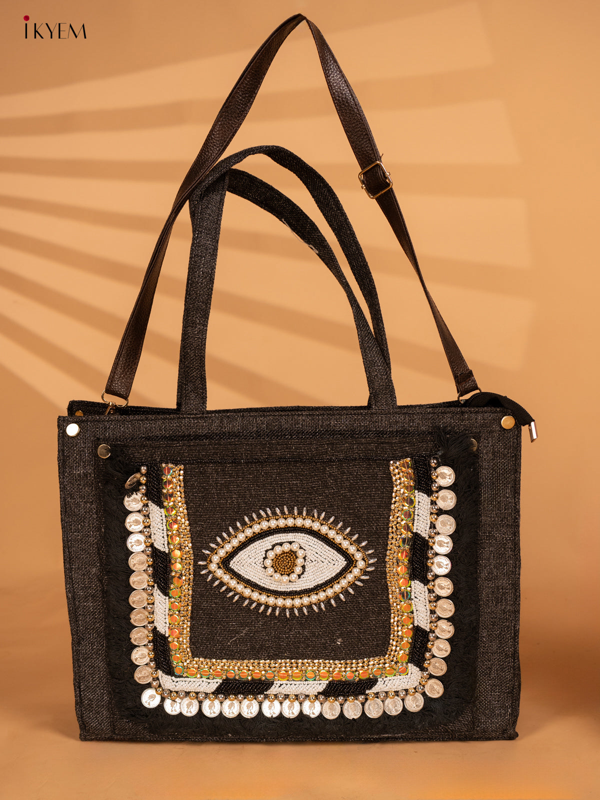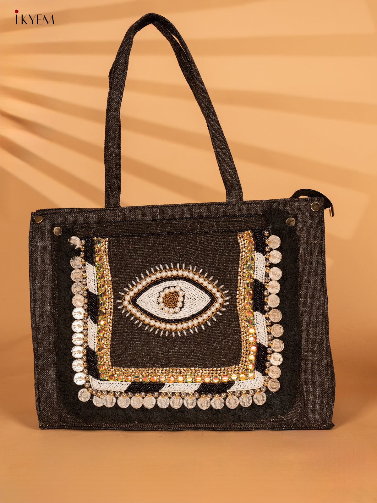 - This Embellished Jute Handbag features a unique Black Evil Eye design that adds a touch of charm to any outfit.