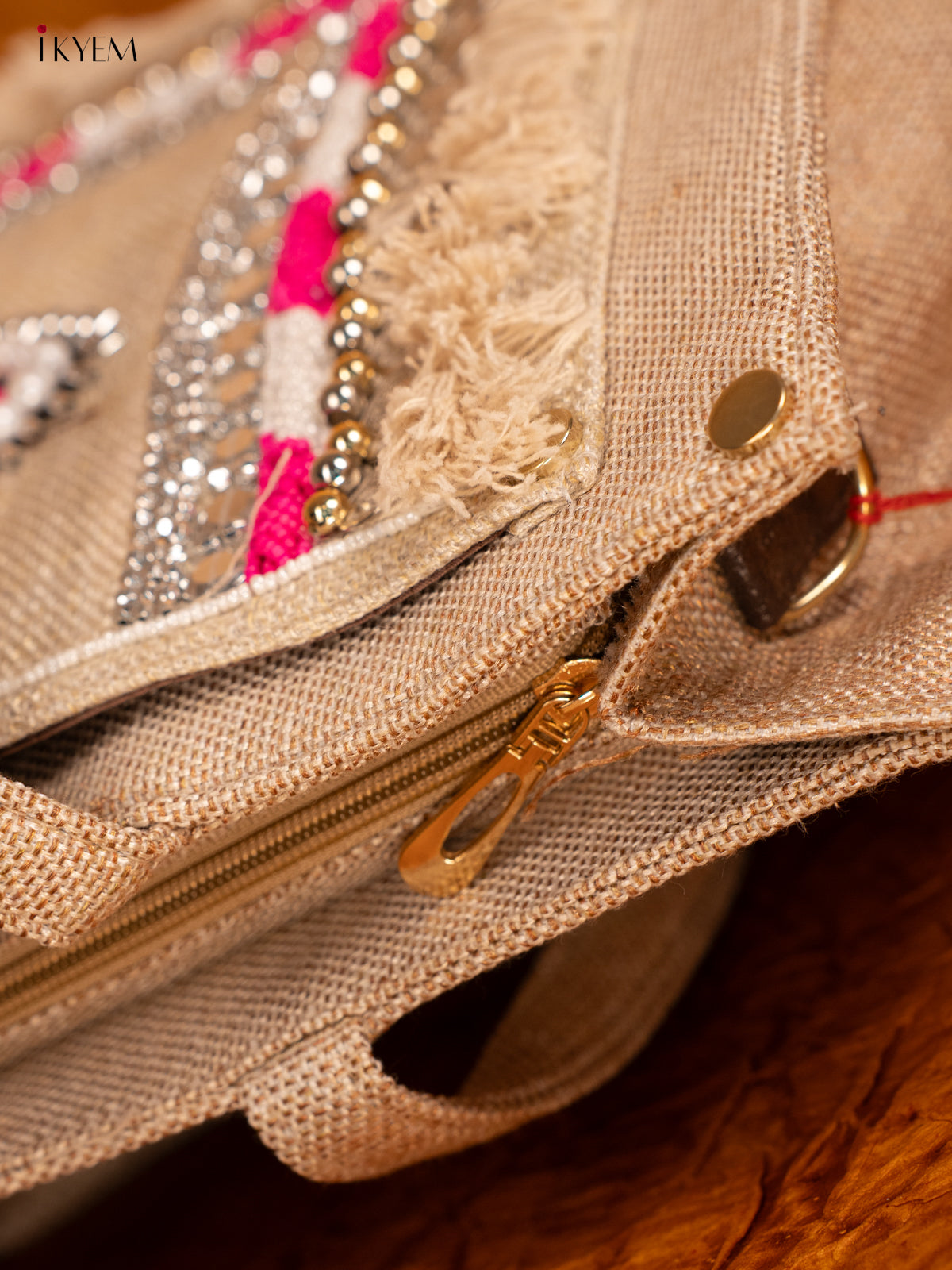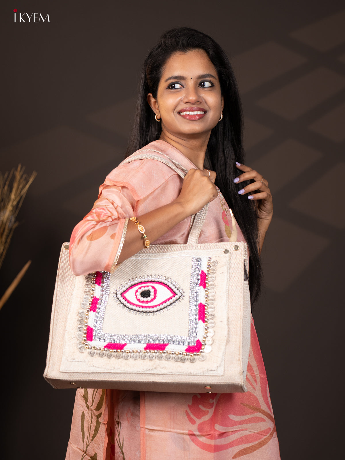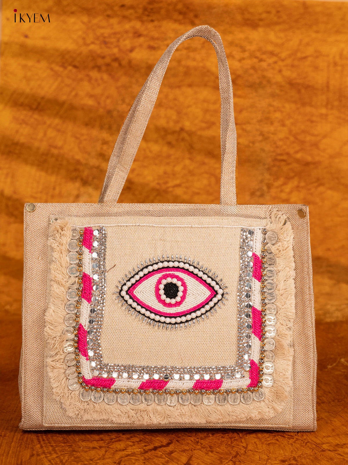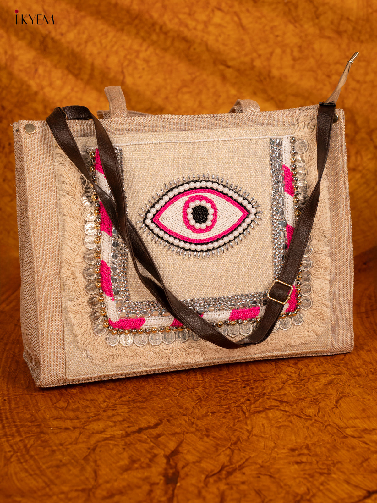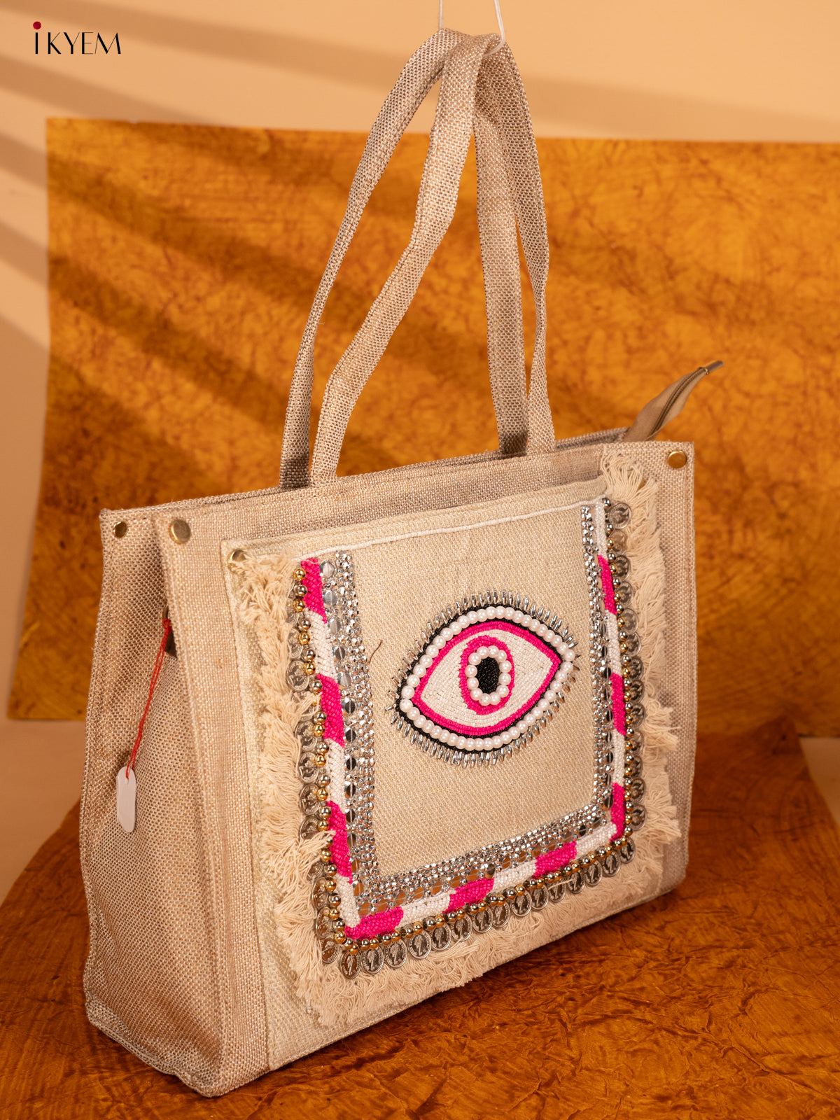 - Expertly crafted from durable jute, this handbag features a striking pink evil eye design embellished onto the front.