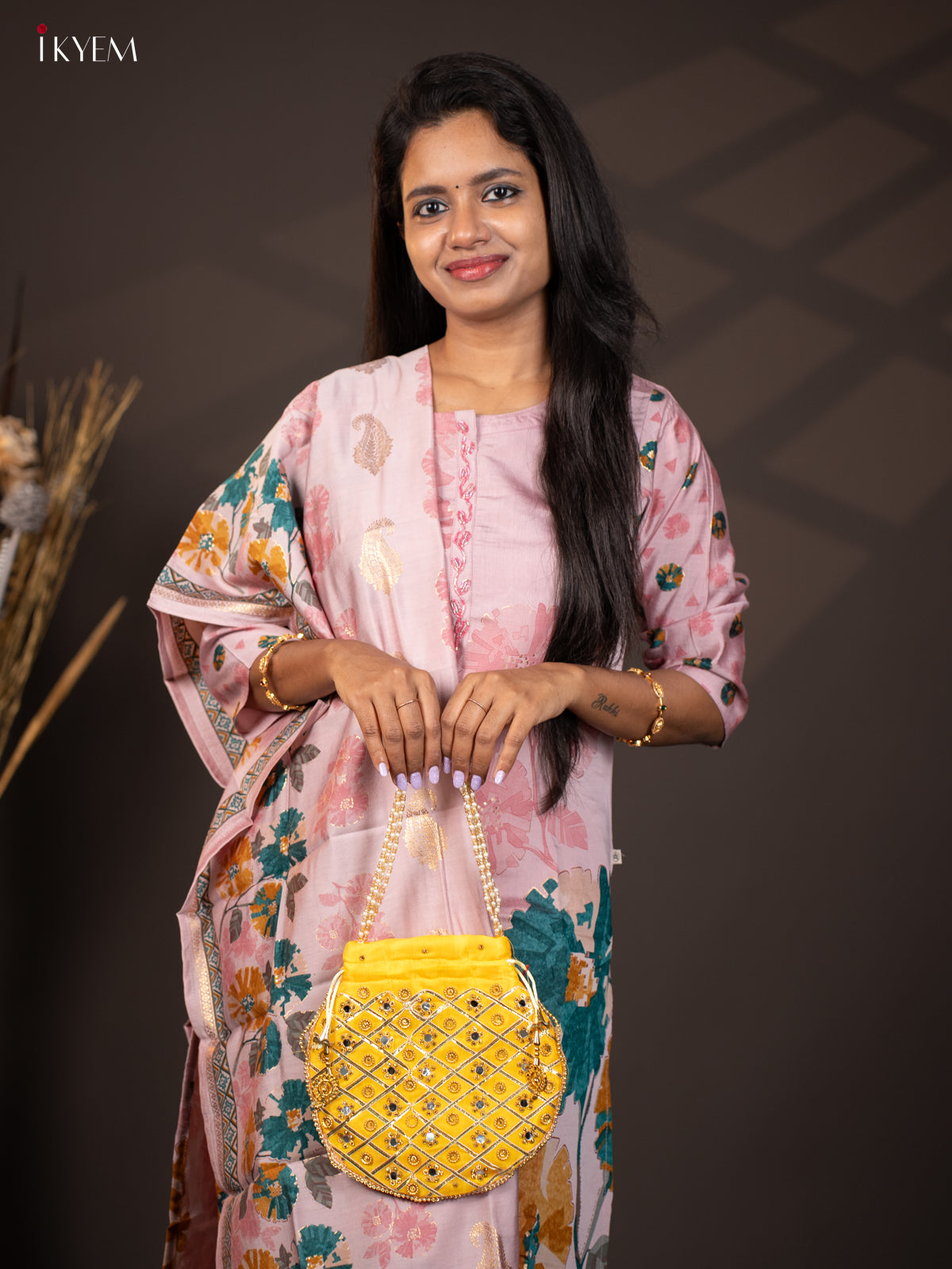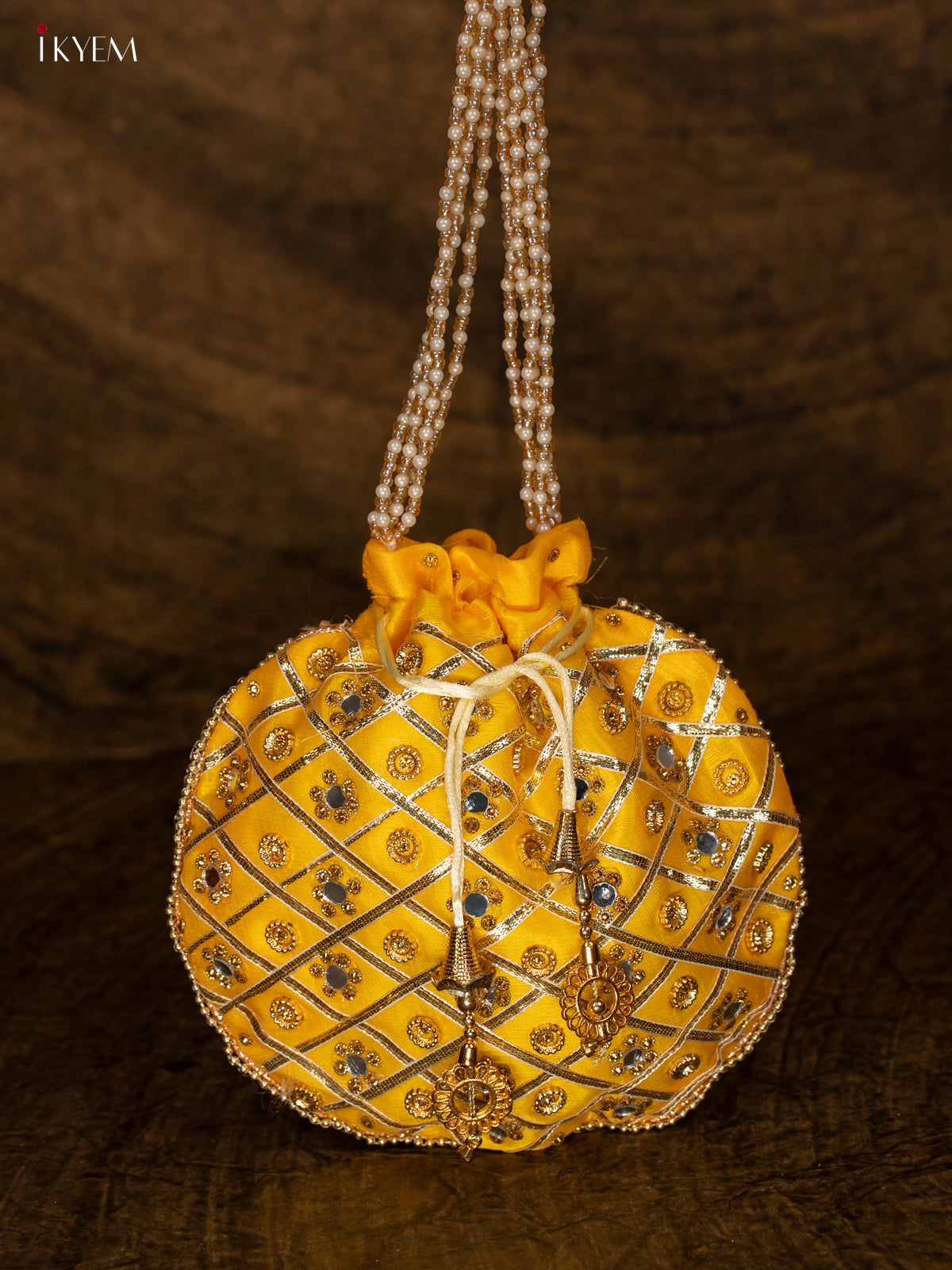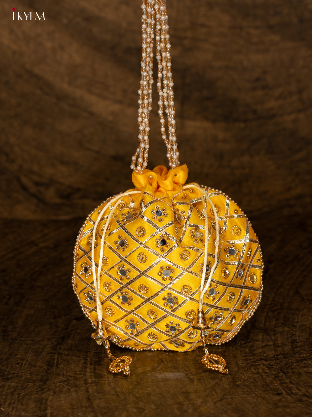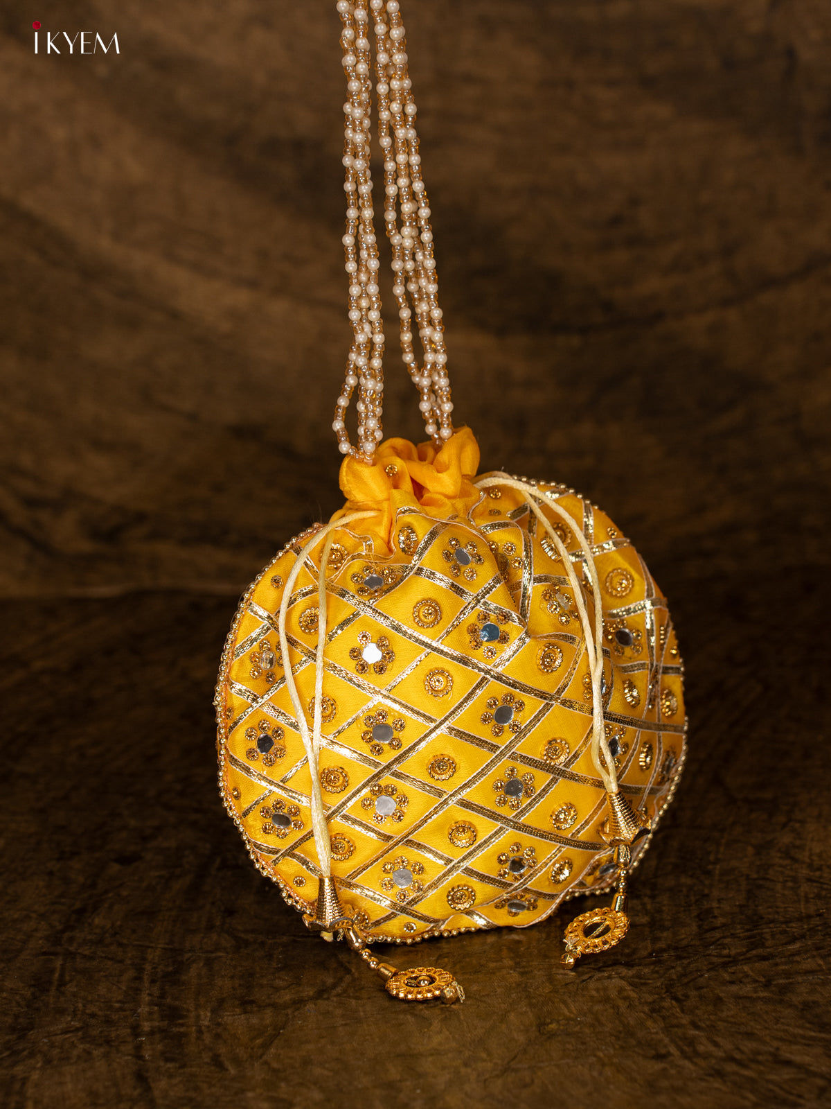 - Elevate your style with our Designer Potli Bag! Crafted with exquisite mirror work, this yellow bag adds a touch of elegance to any outfit.