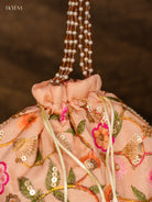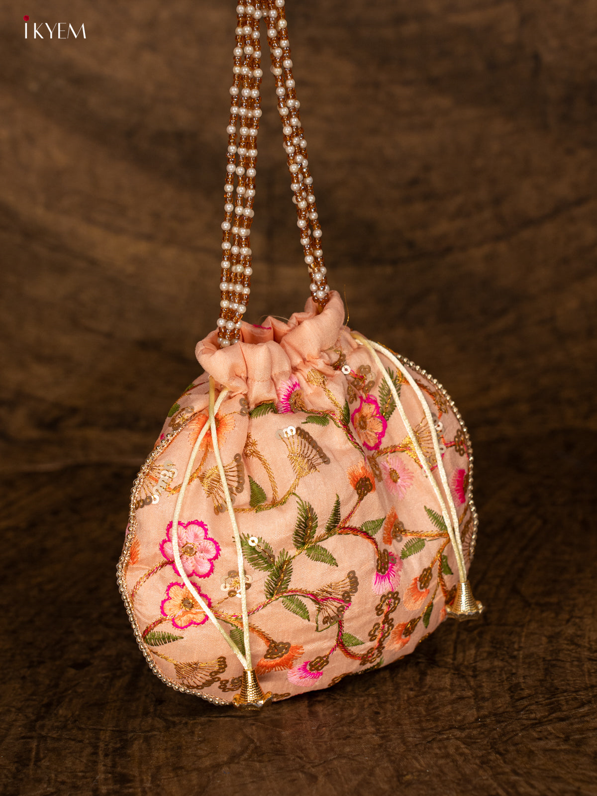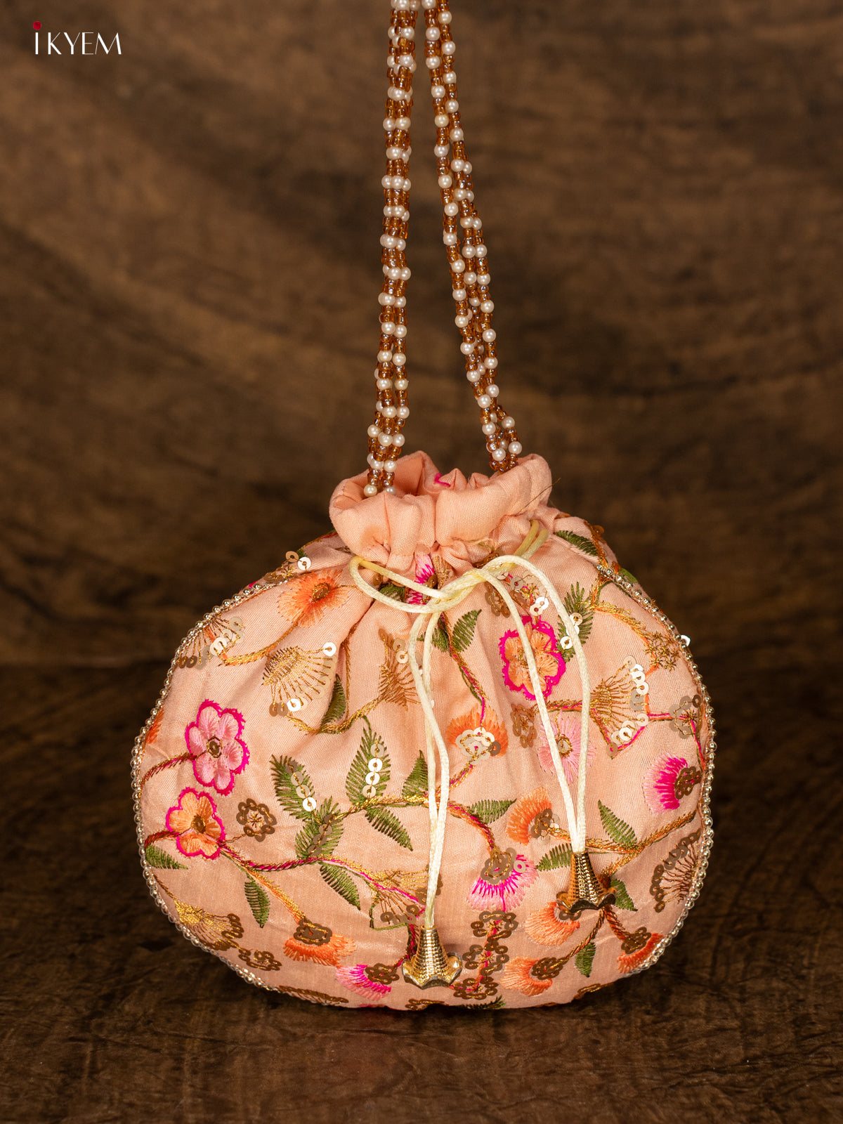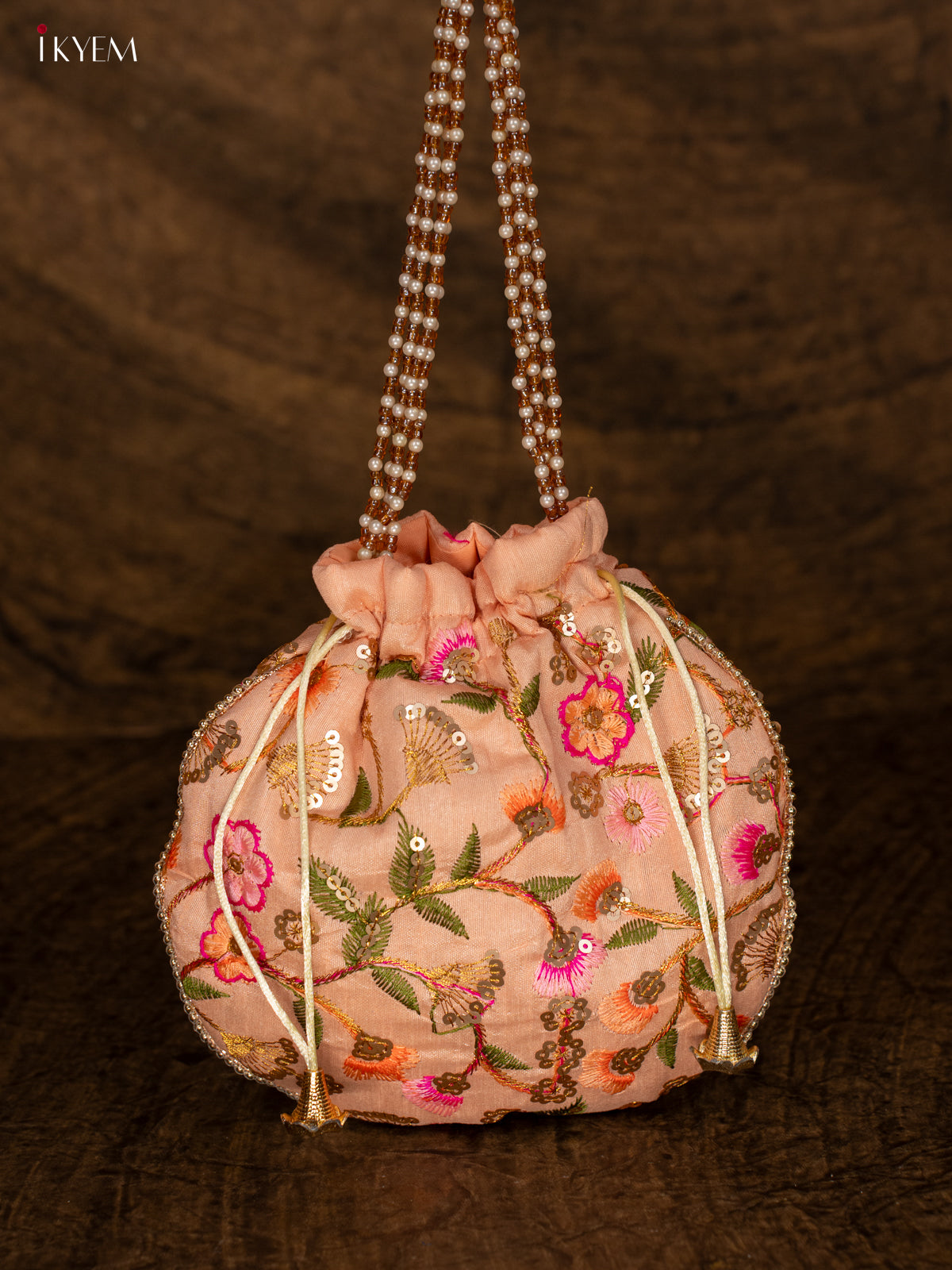 - Introduce a touch of elegance with our Designer Floral Potli Bag in Peach.