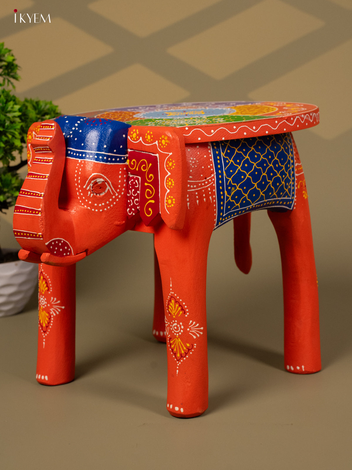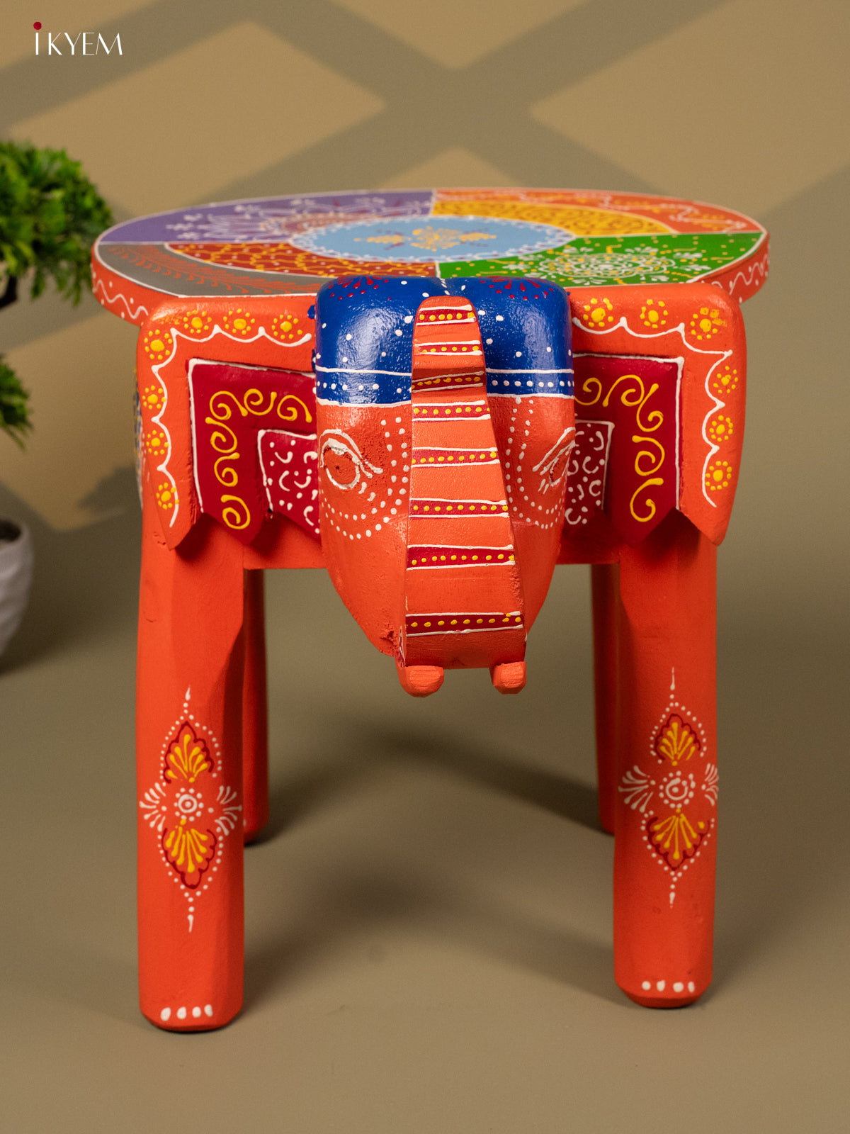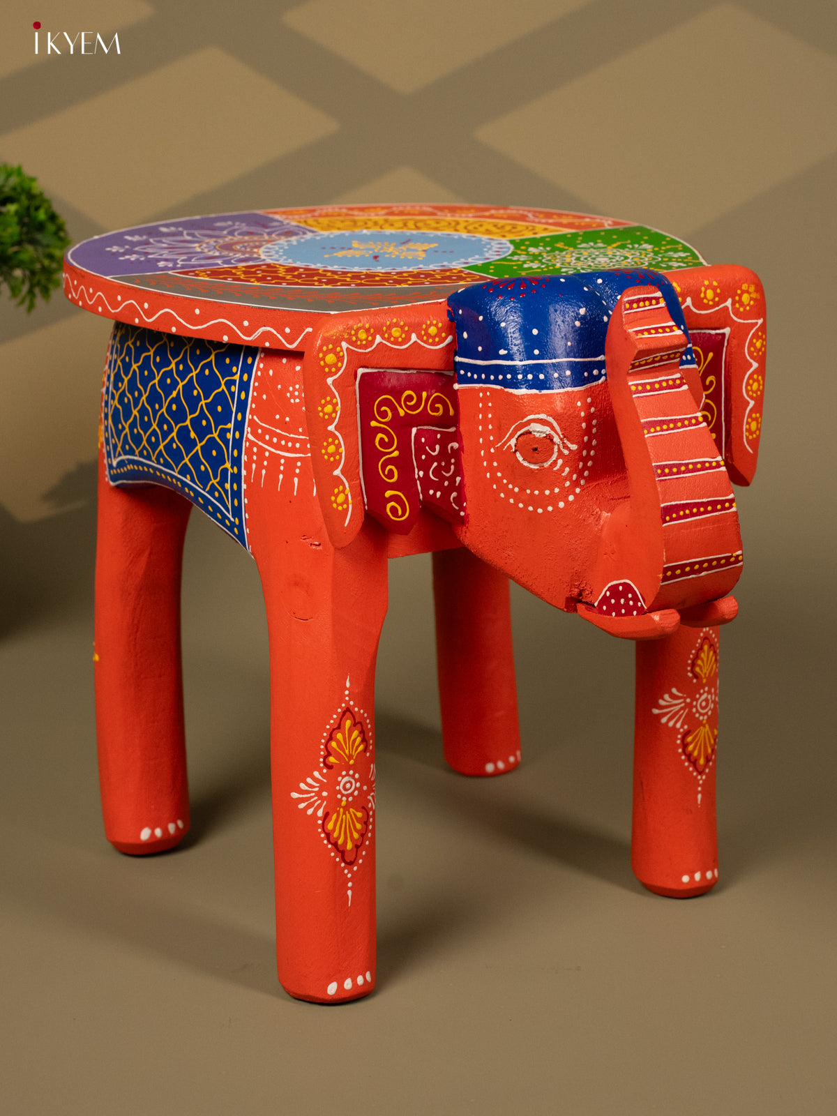 Hand Painted Elephant Stool - Orange - 12 inch - KA30127