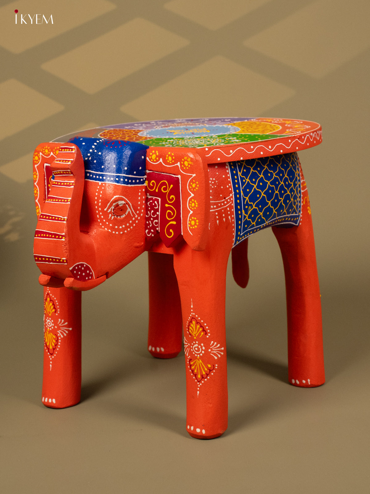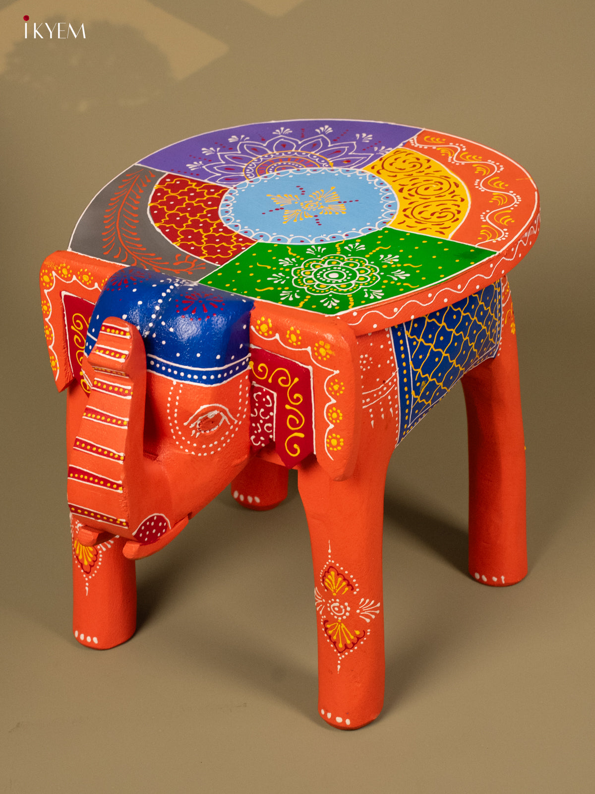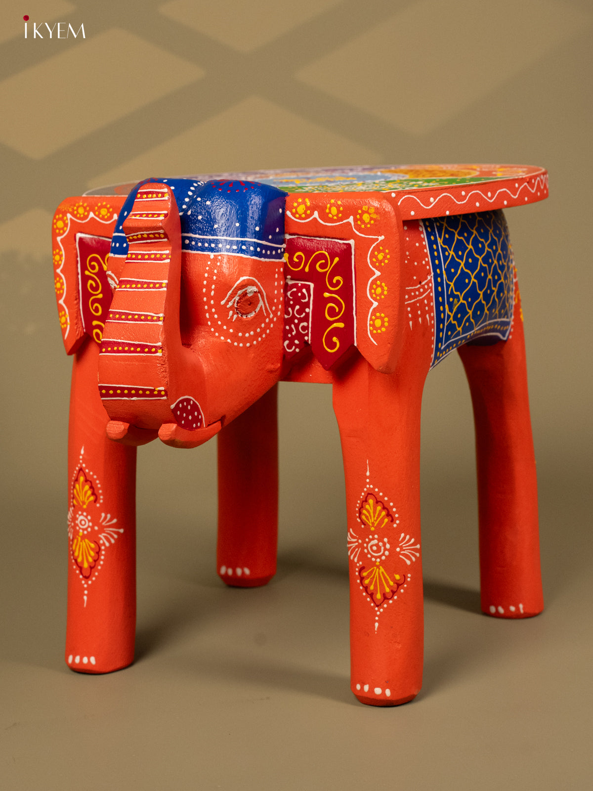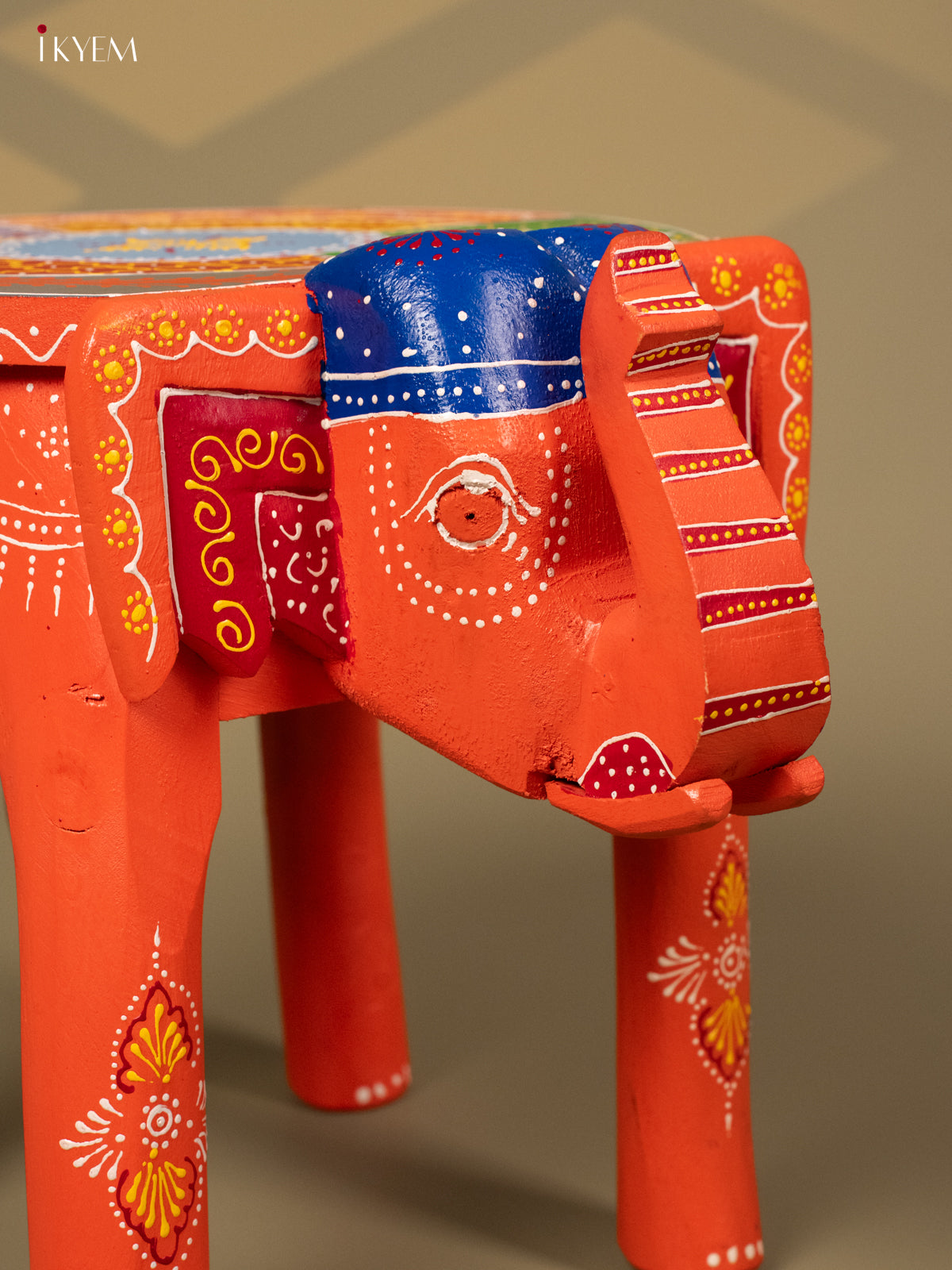 Hand Painted Elephant Stool - Orange - 12 inch - KA30127