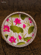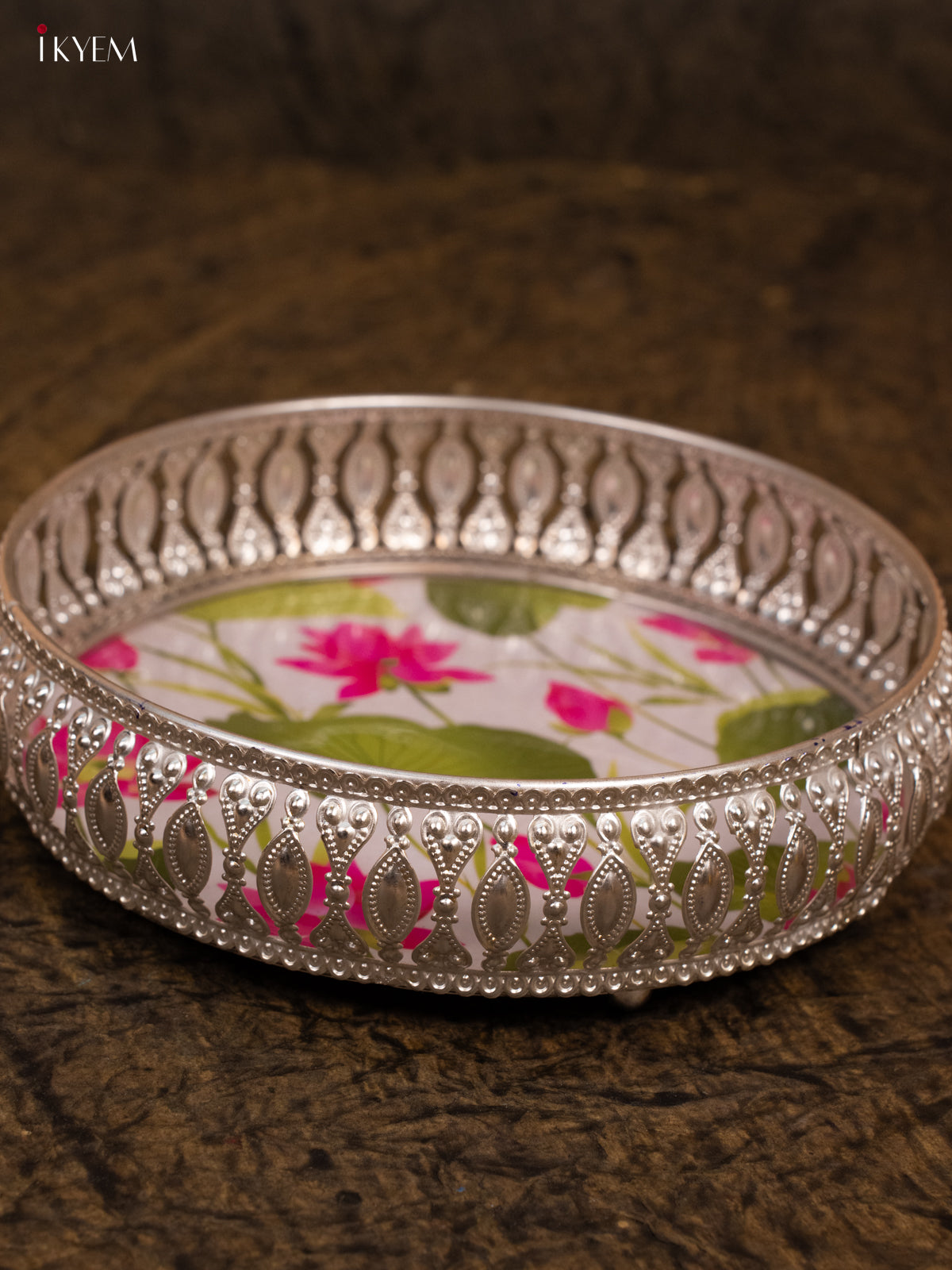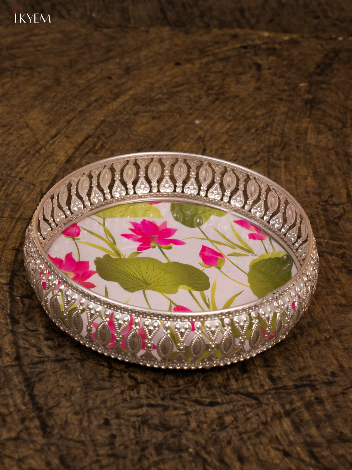 - This digital printed German silver tray features a beautiful pichwai lotus design, making it an ideal gift for housewarming or traditional occasions.