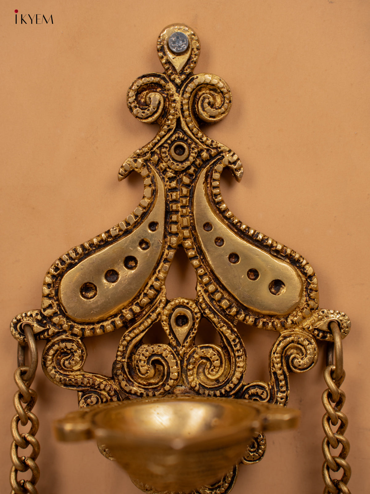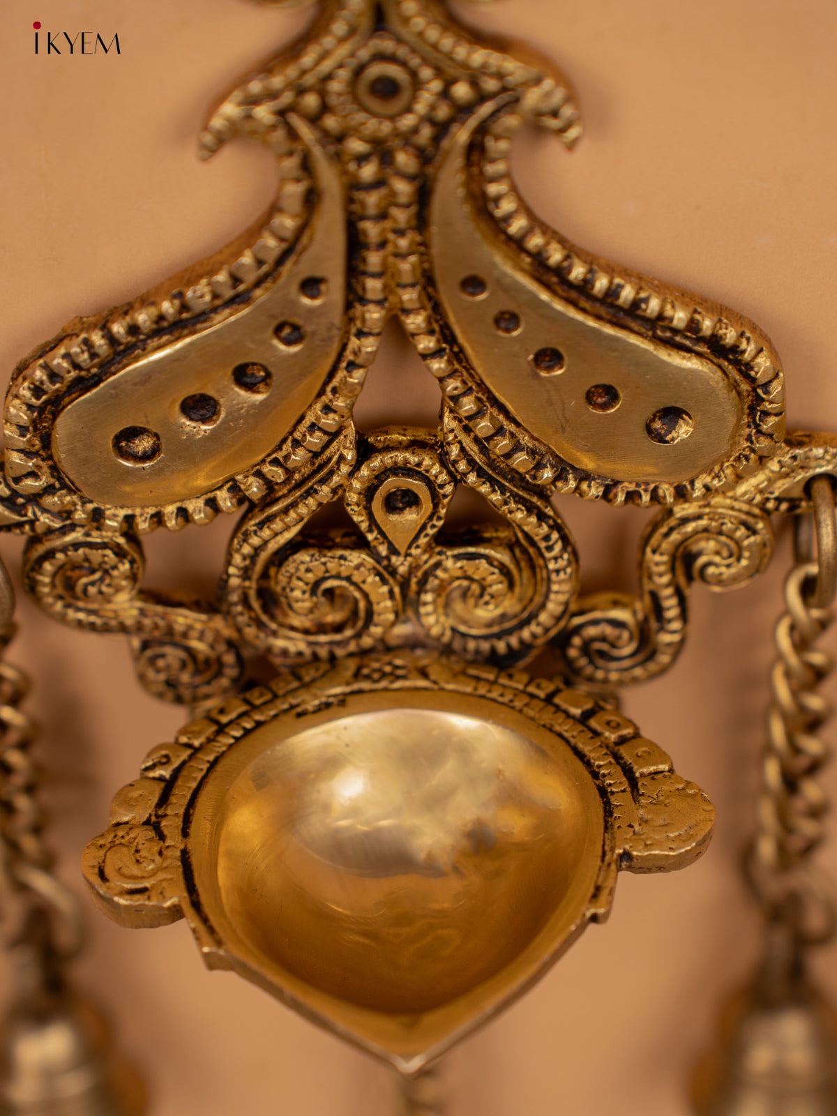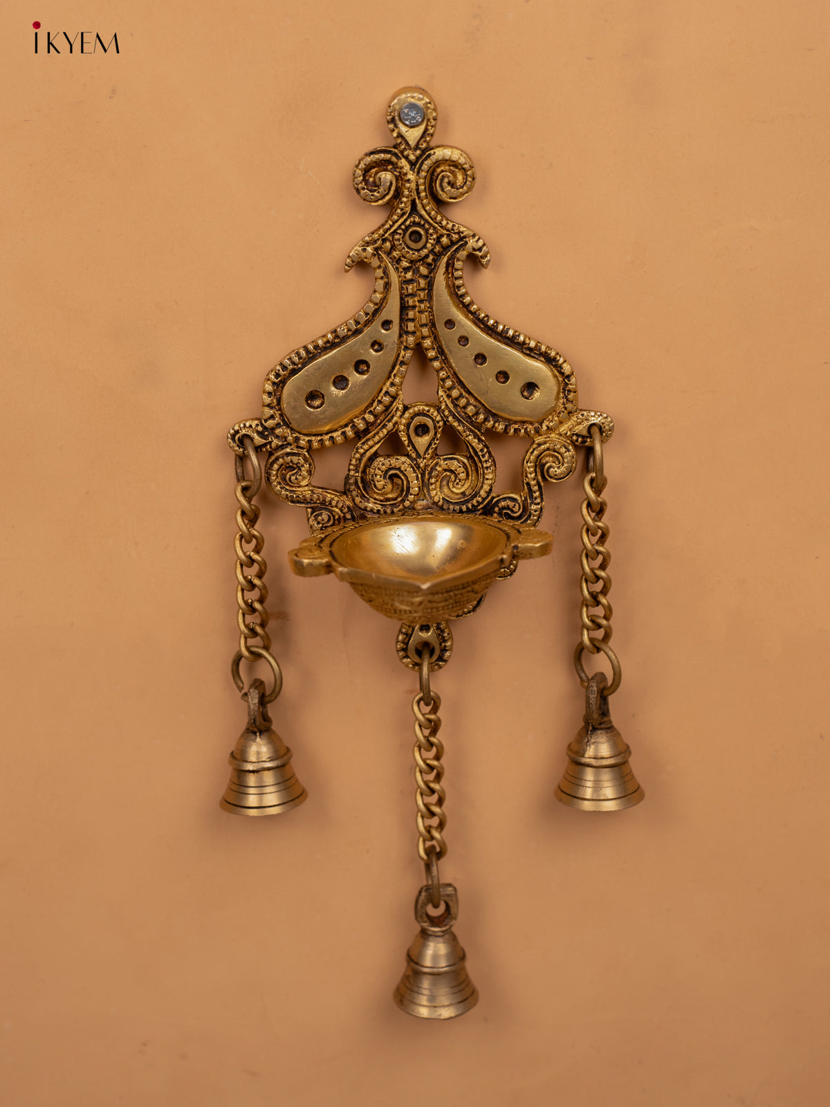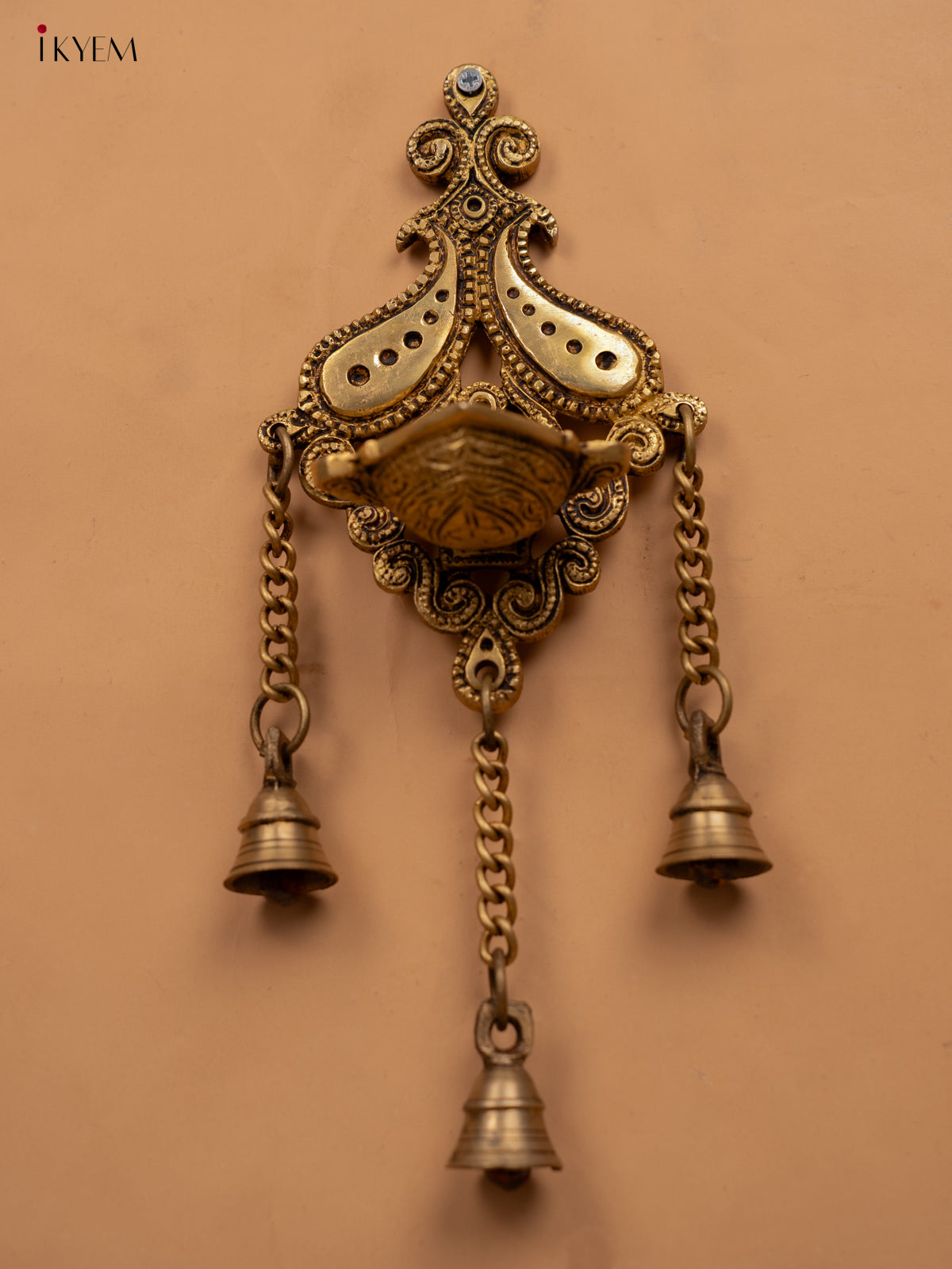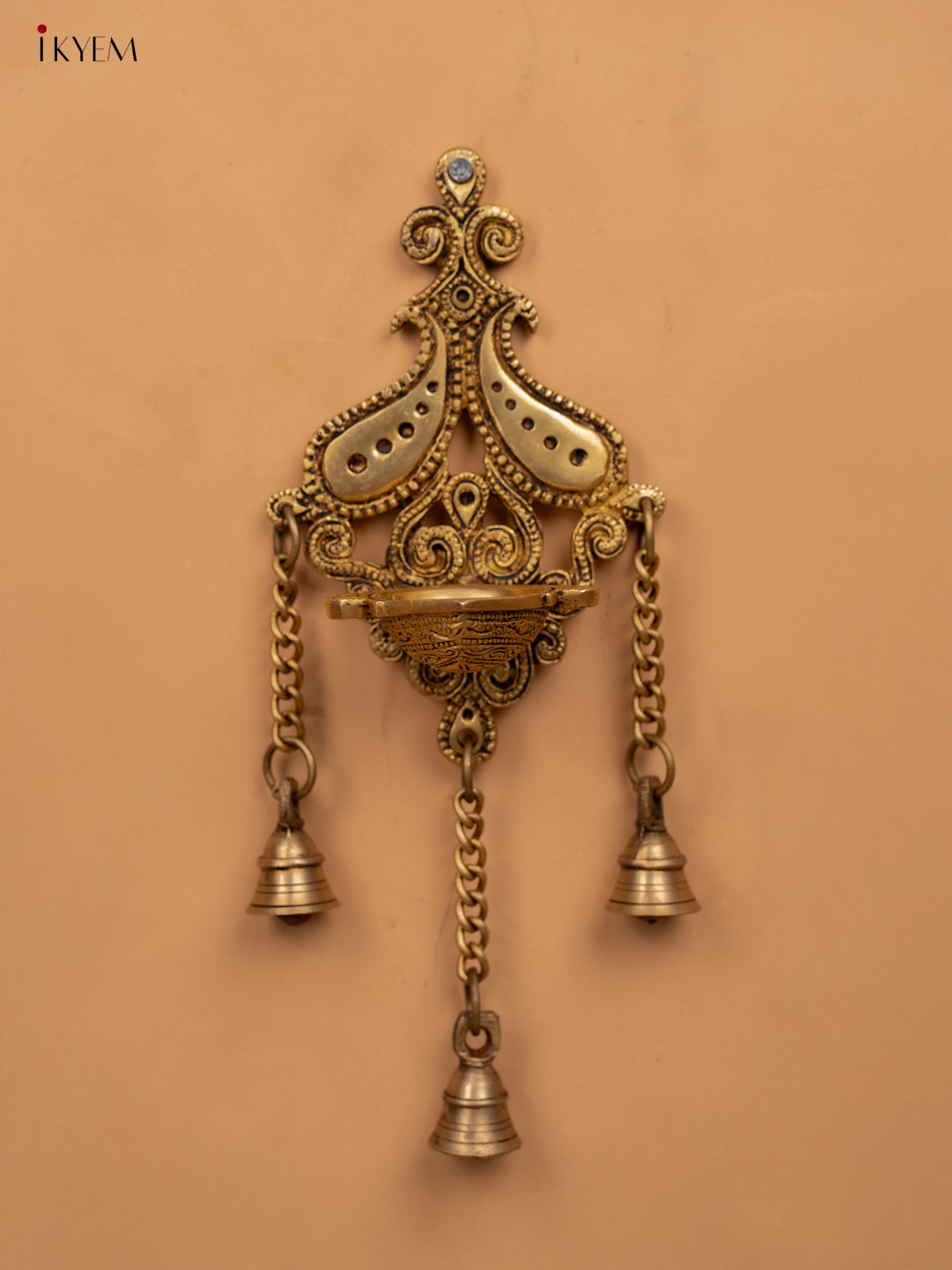 - Expertly crafted from brass, this antique wall mount hanging diya with 3 bells is a beautiful addition to any space.