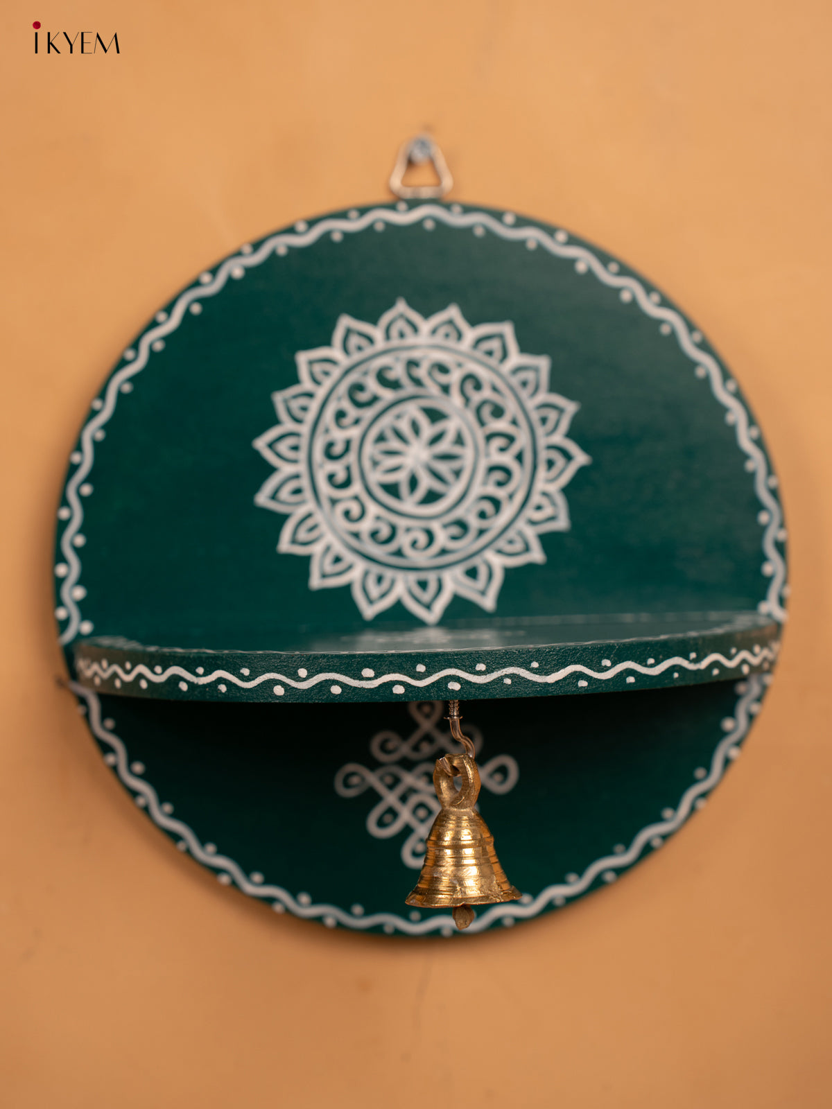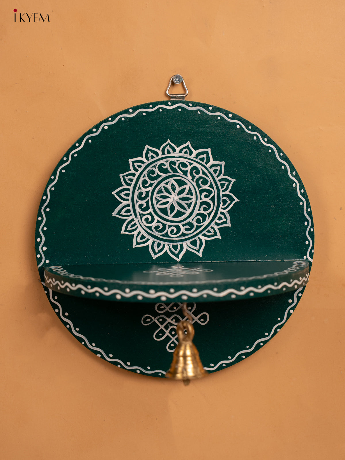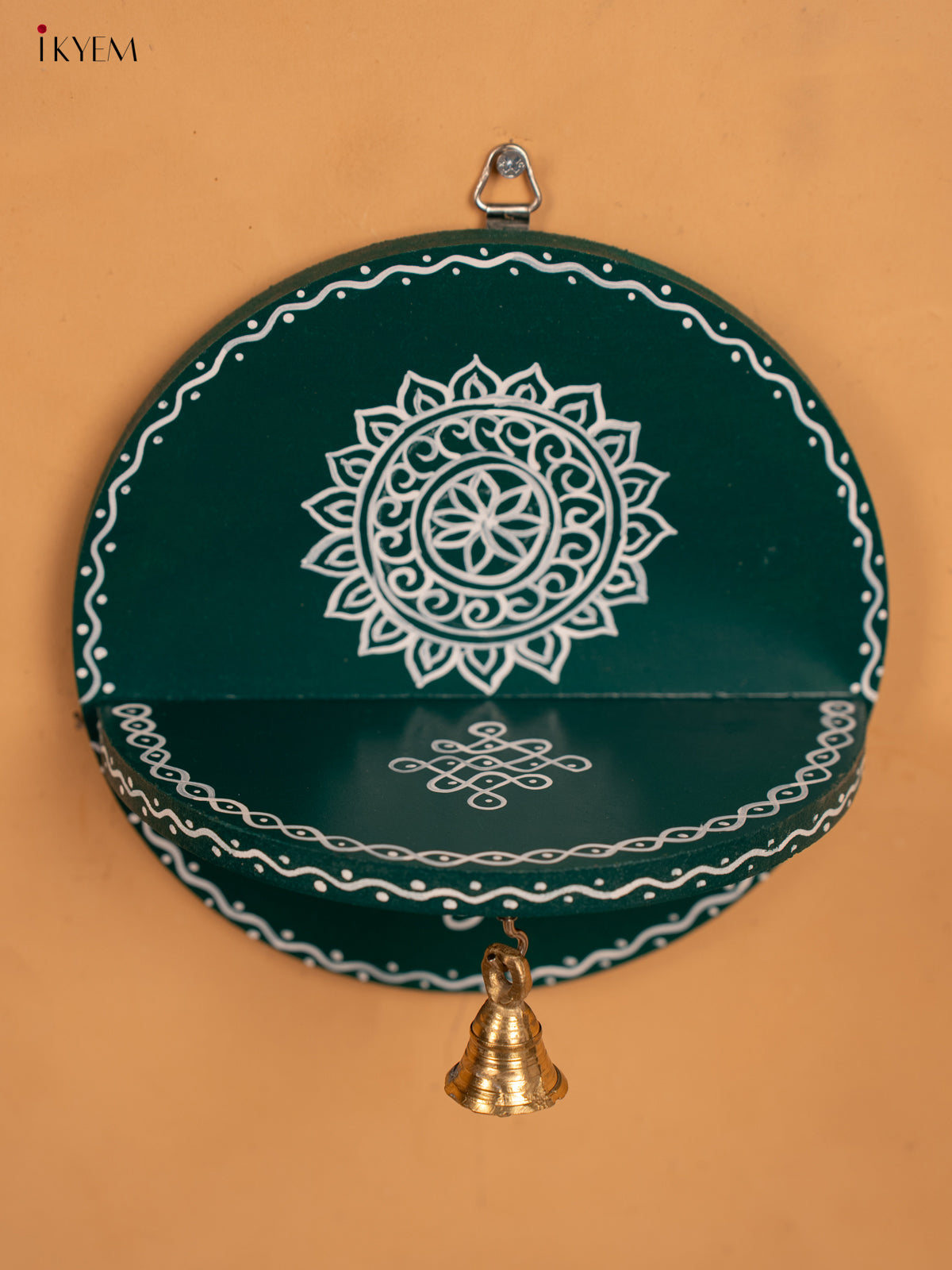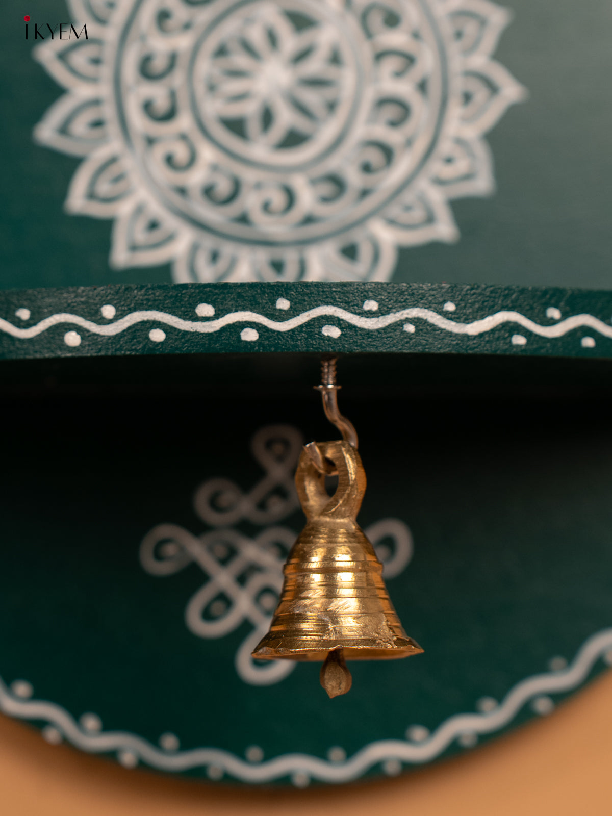 Hand Painted Round Wall Shelf with Brass Bell - Green - KB17160