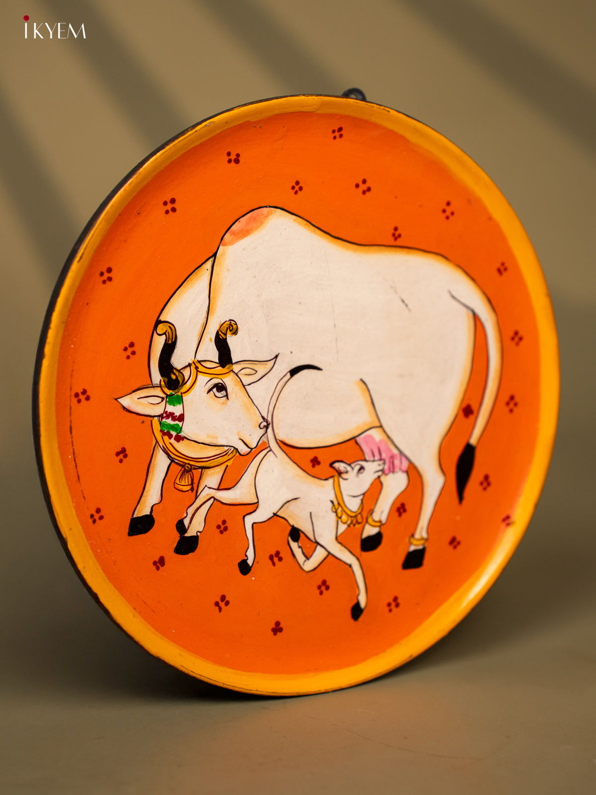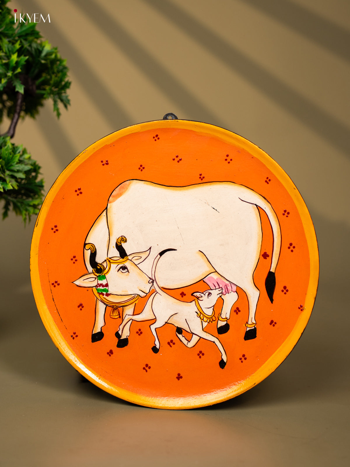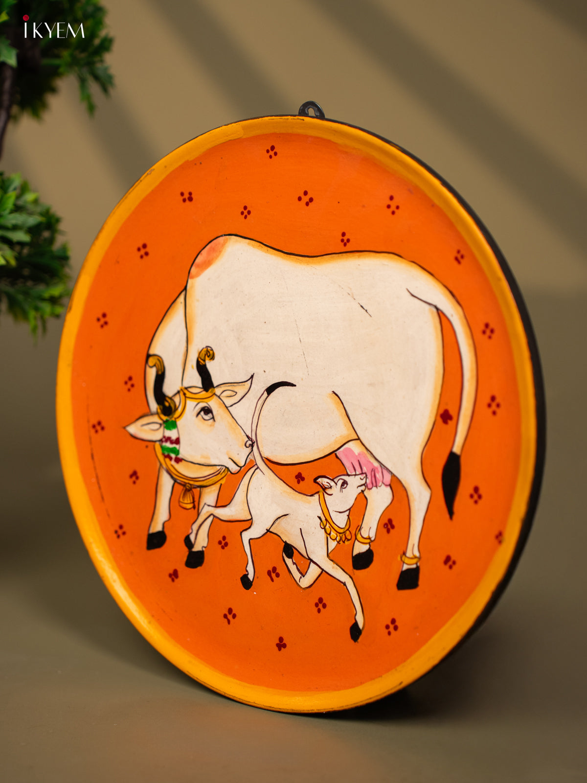 - Introducing our Wooden Hand Painted Wall Hanging Plate, featuring a beautiful Cow And calf design.
