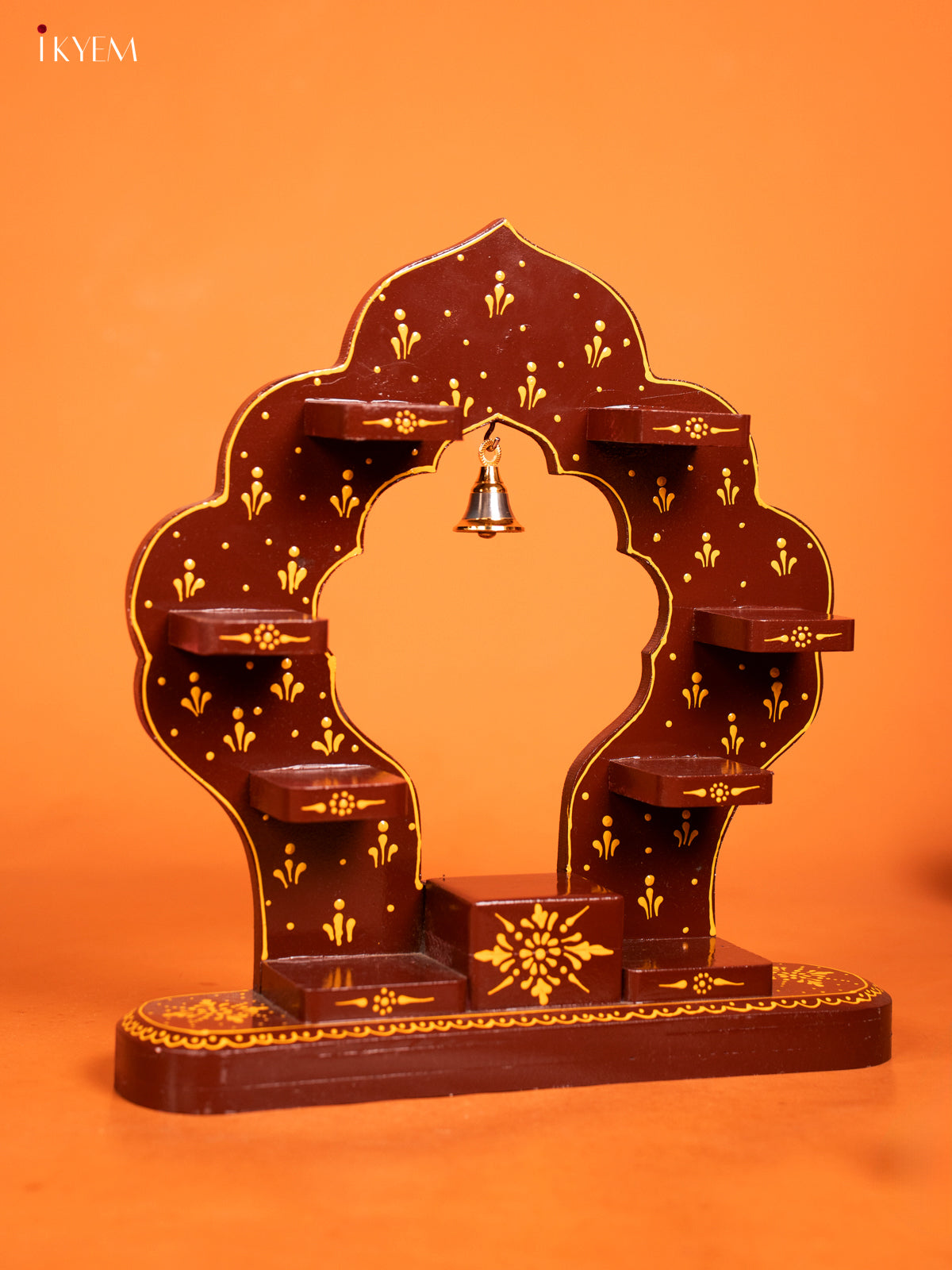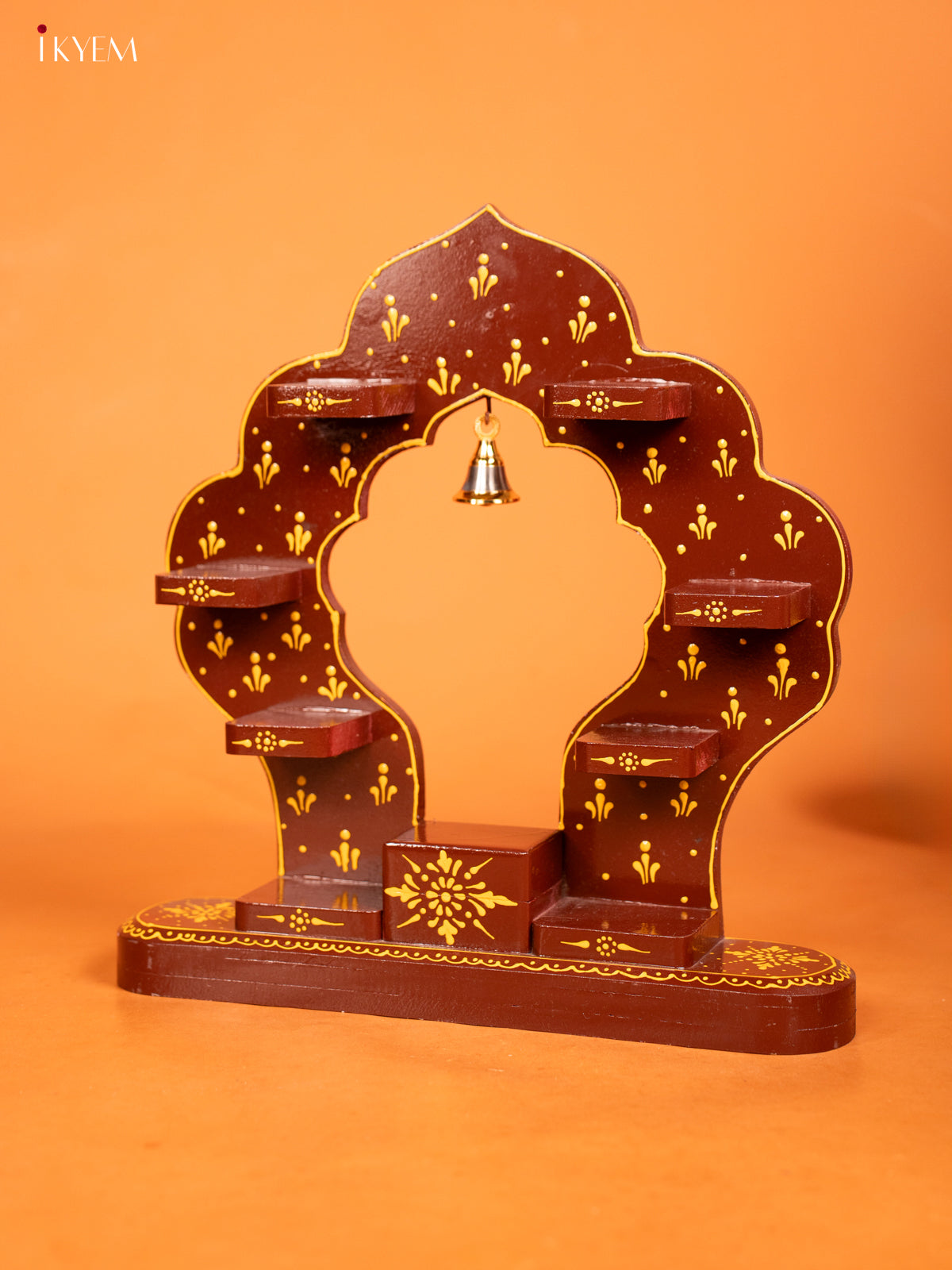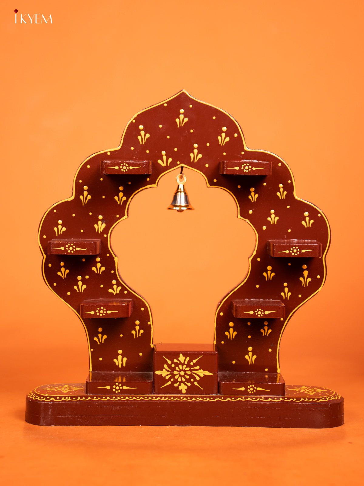 - Elegant arch-shaped wooden wall shelf in rich brown finish with beautiful hand painted designs.