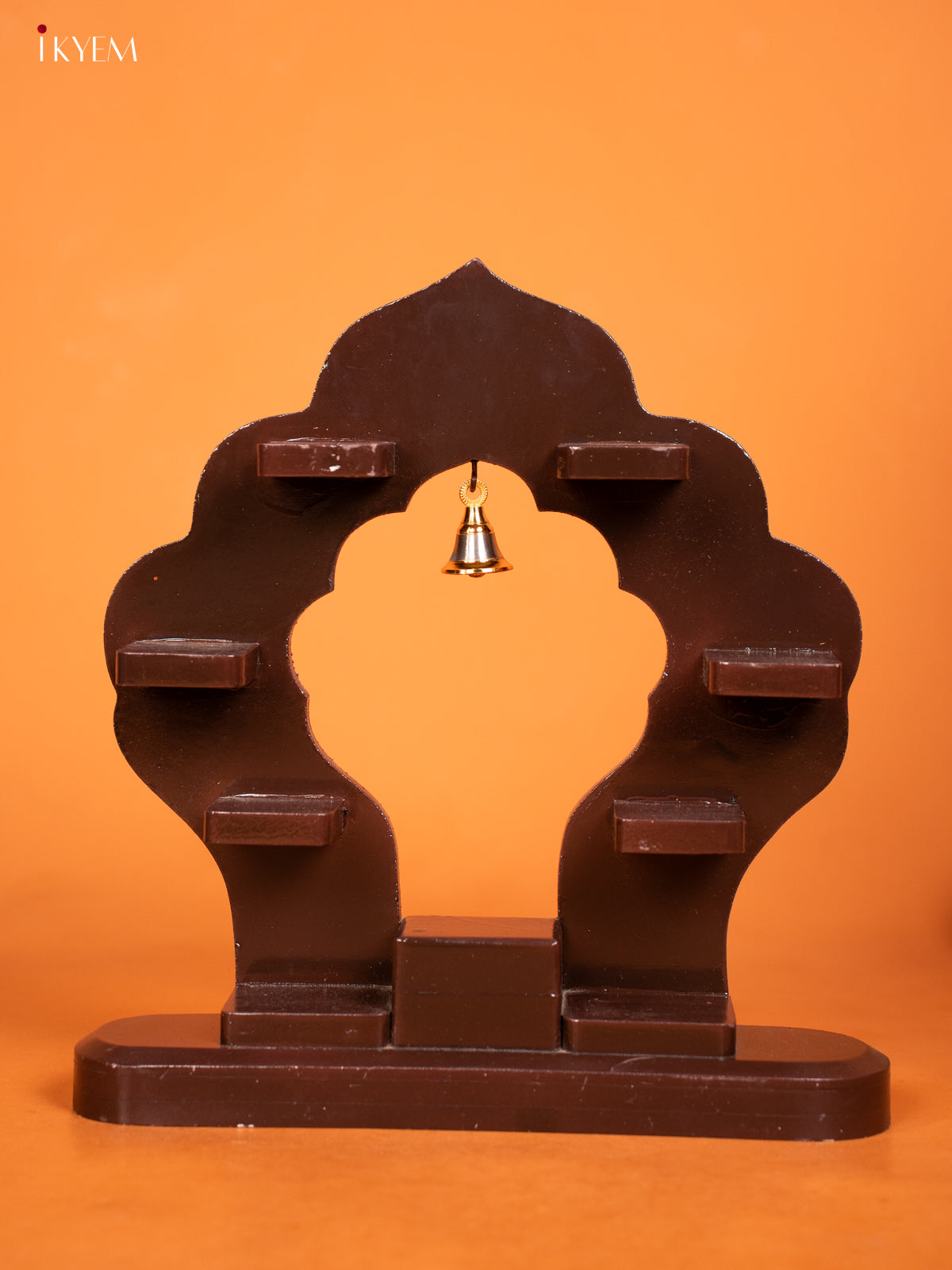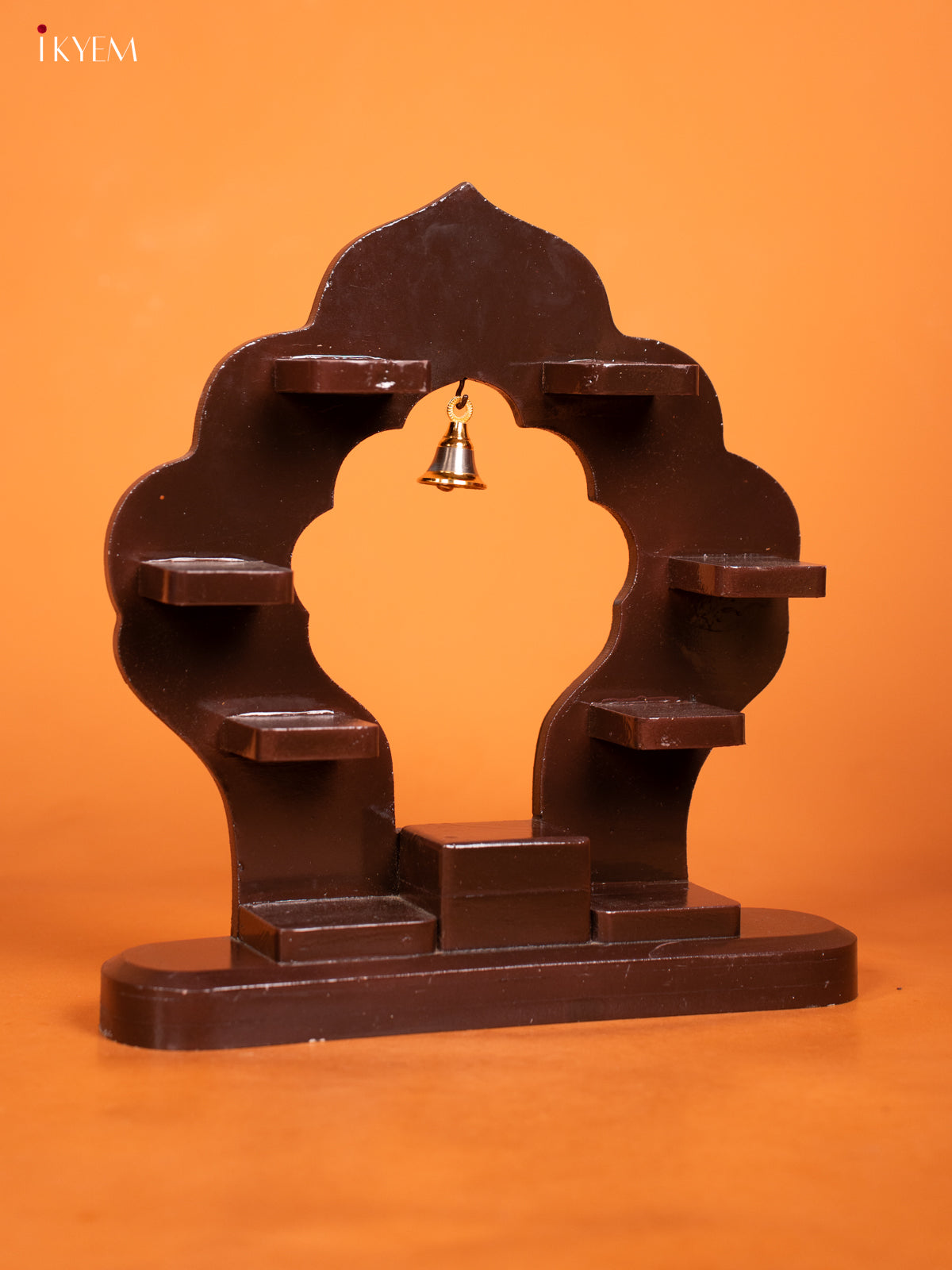 - Elegant arch-shaped wooden wall shelf in rich brown finish.