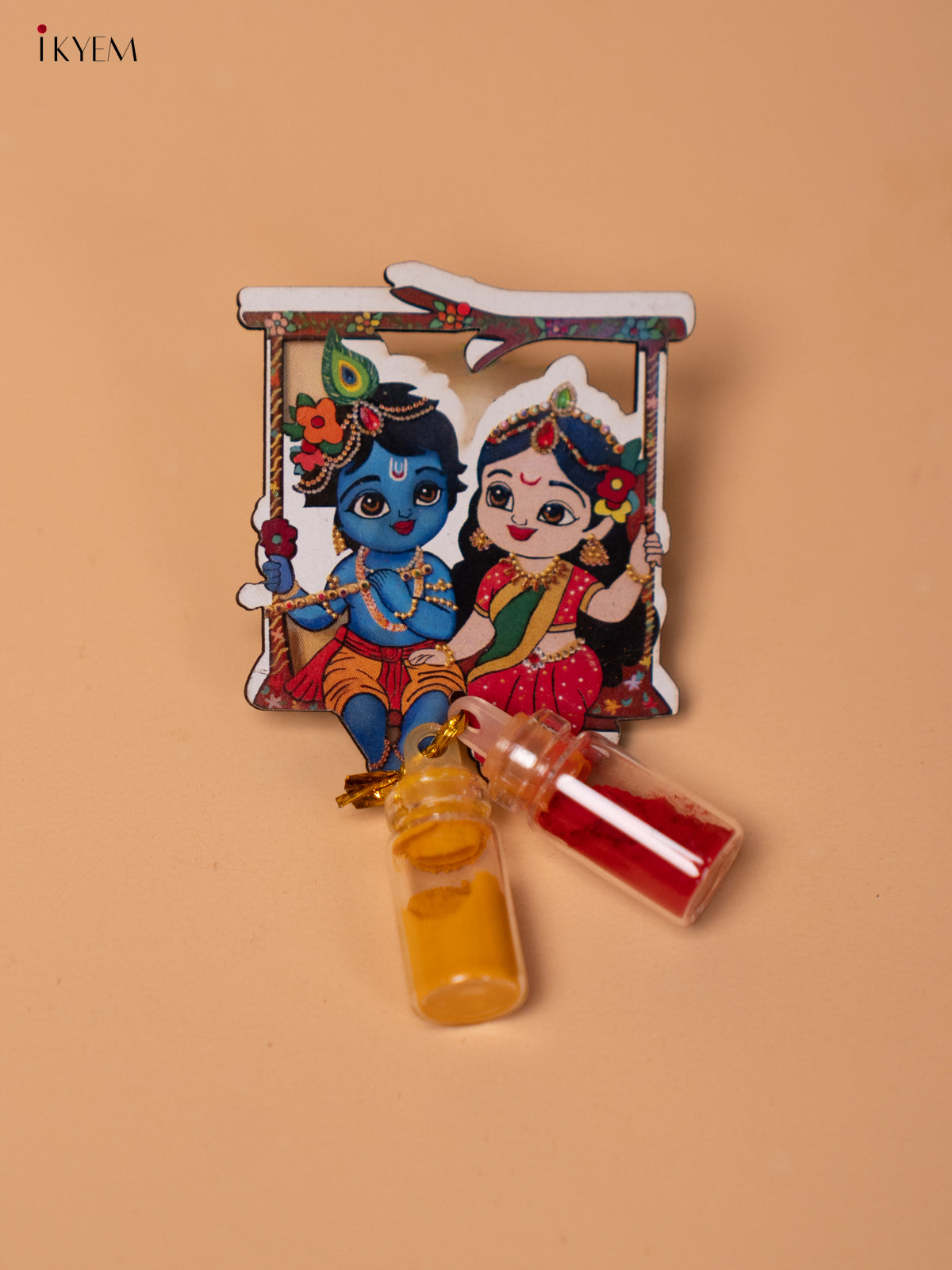 - Perfect for pooja and Navaratri, this elegant Haldi Kumkum bottle set features a beautiful design of Radhakrishnan.