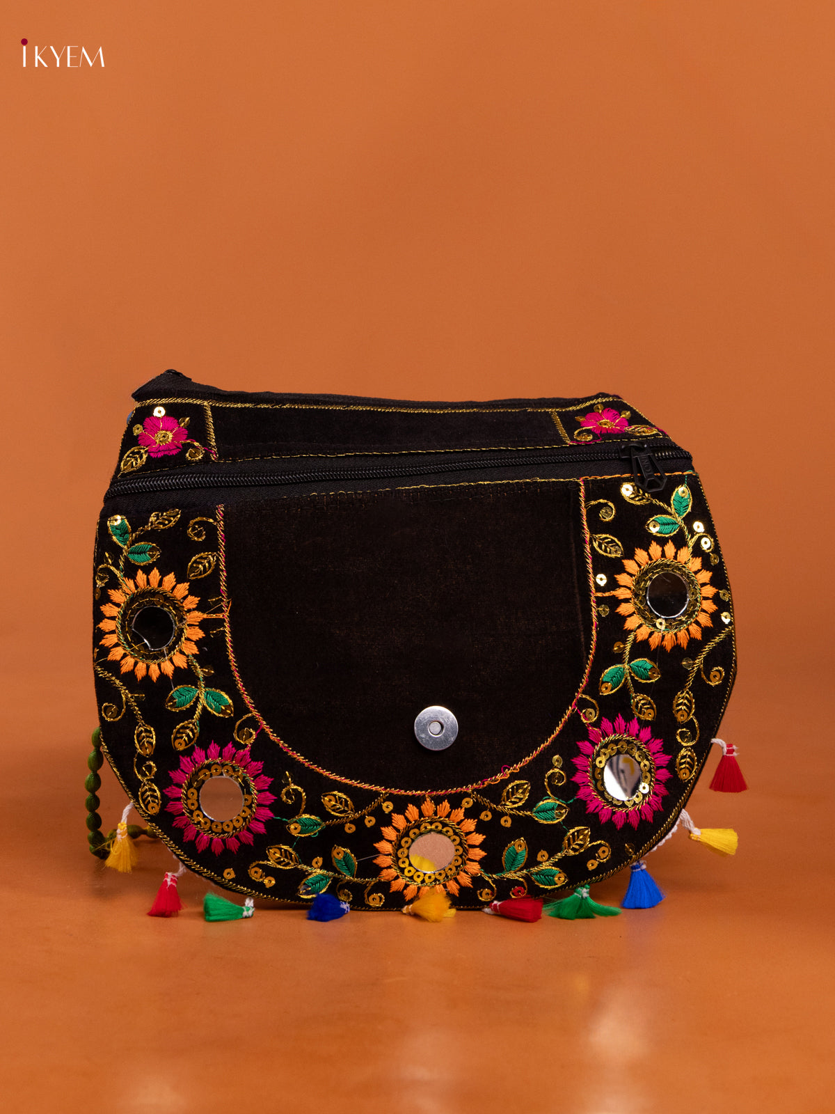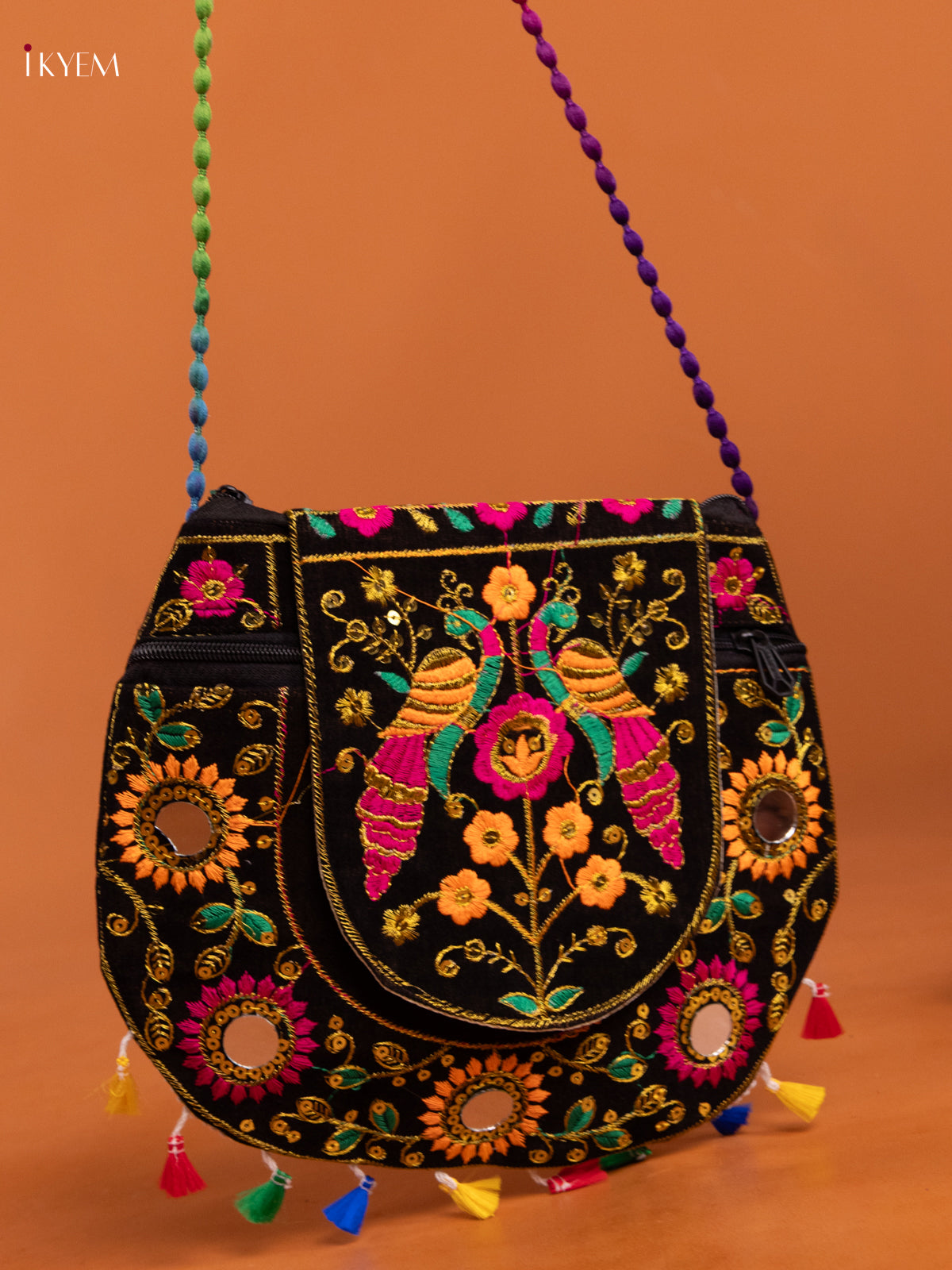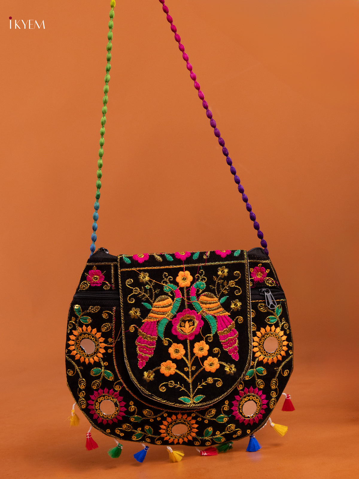Embroidery Rajasthani Ethnic Peacock Design Sling Bag - Black - KD26421