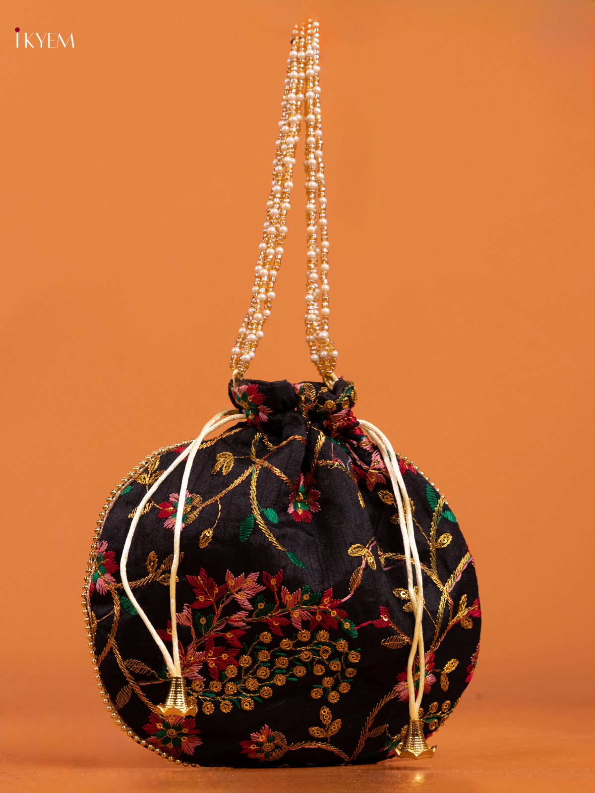 Embroidered Floral Design Gold Zari Potli Bag - Navy Blue - KD26520
