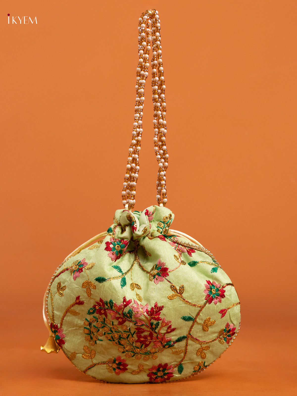 - The Embroidered Floral Design Potli Bag in vibrant green features intricate embroidery that adds a refined touch to any occasion.