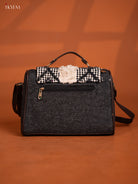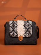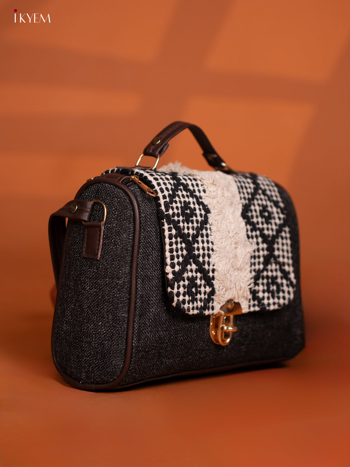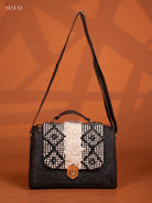Jacquard Embroidered Gusset & Flap Leather Sling Bag with 3 Compartments - Grey with Cream