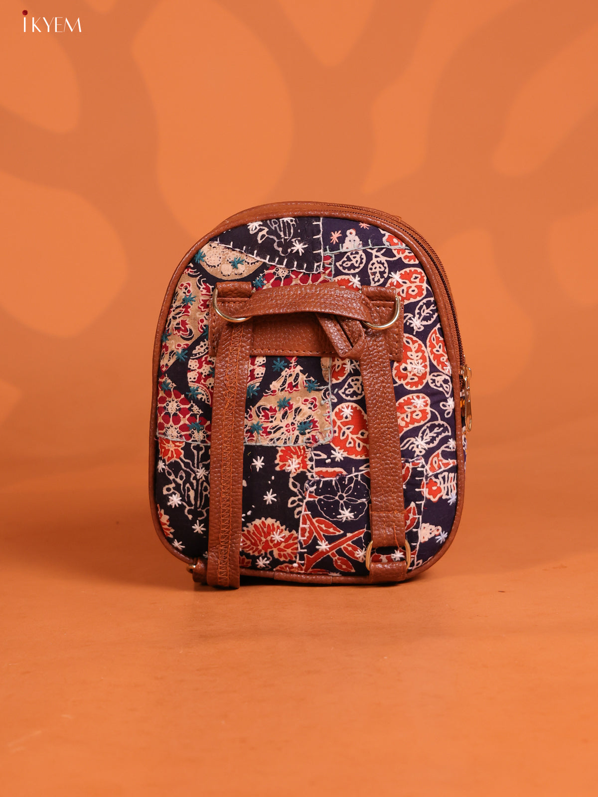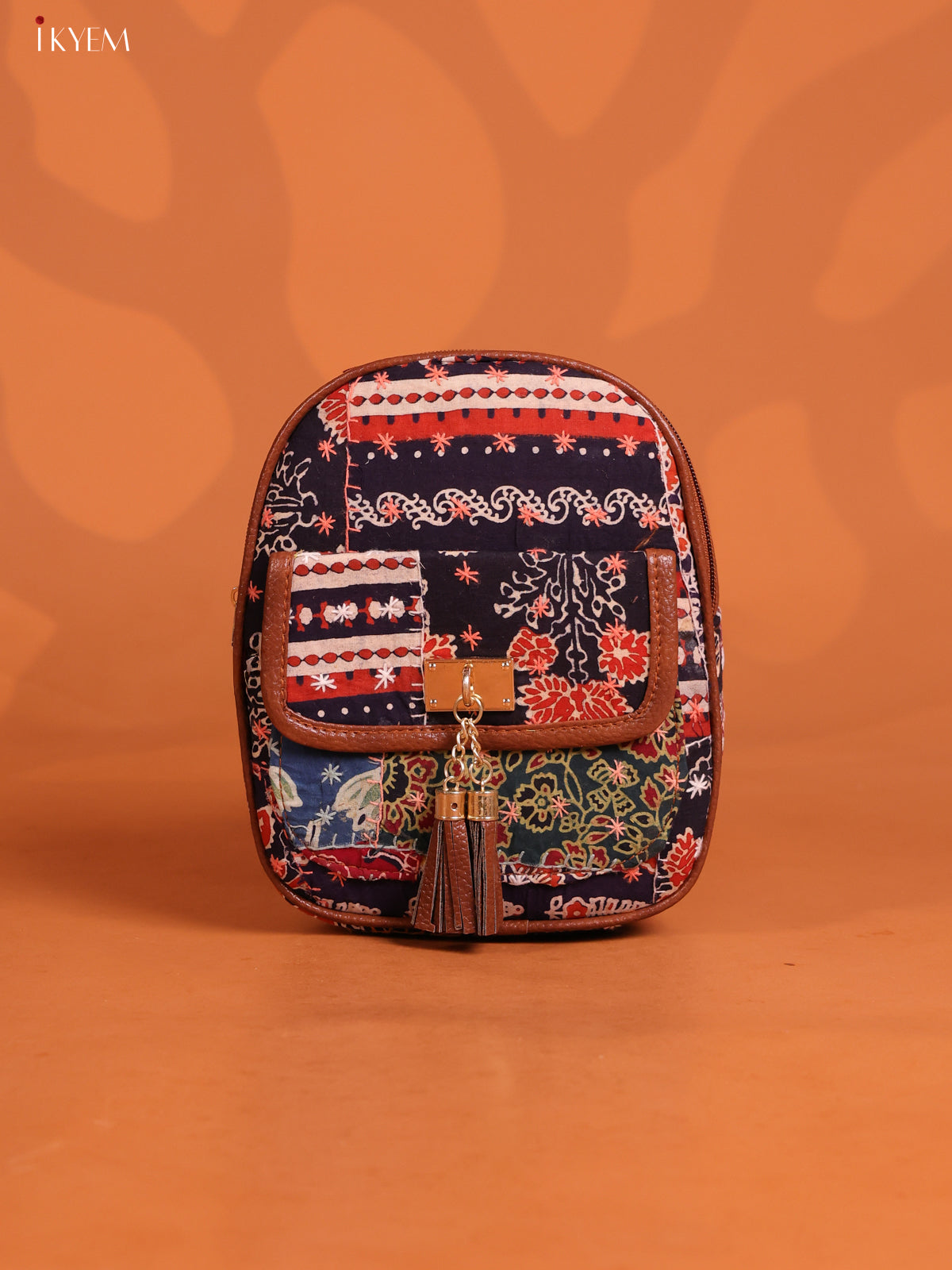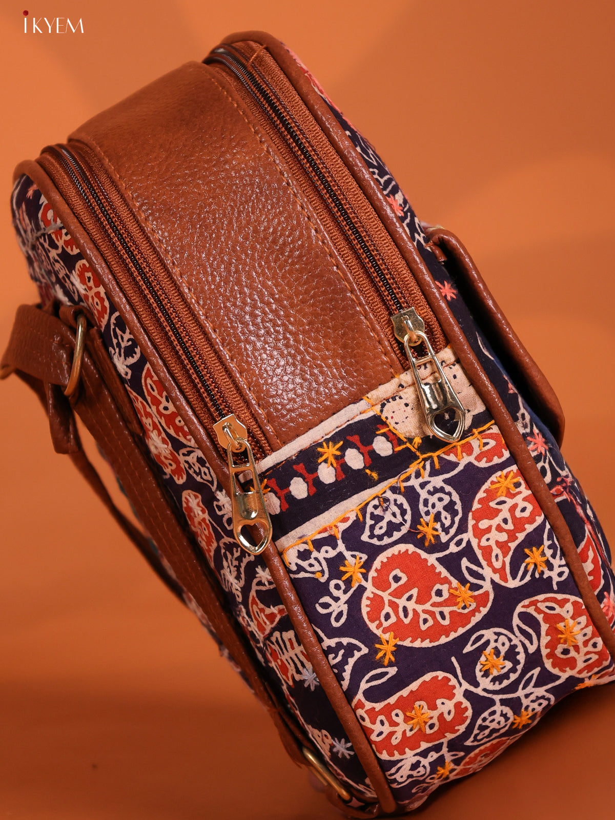 Embroidered Cotton Floral Back Bag Flap with 2 Compartments -Navy Blue with Orange - KD26657