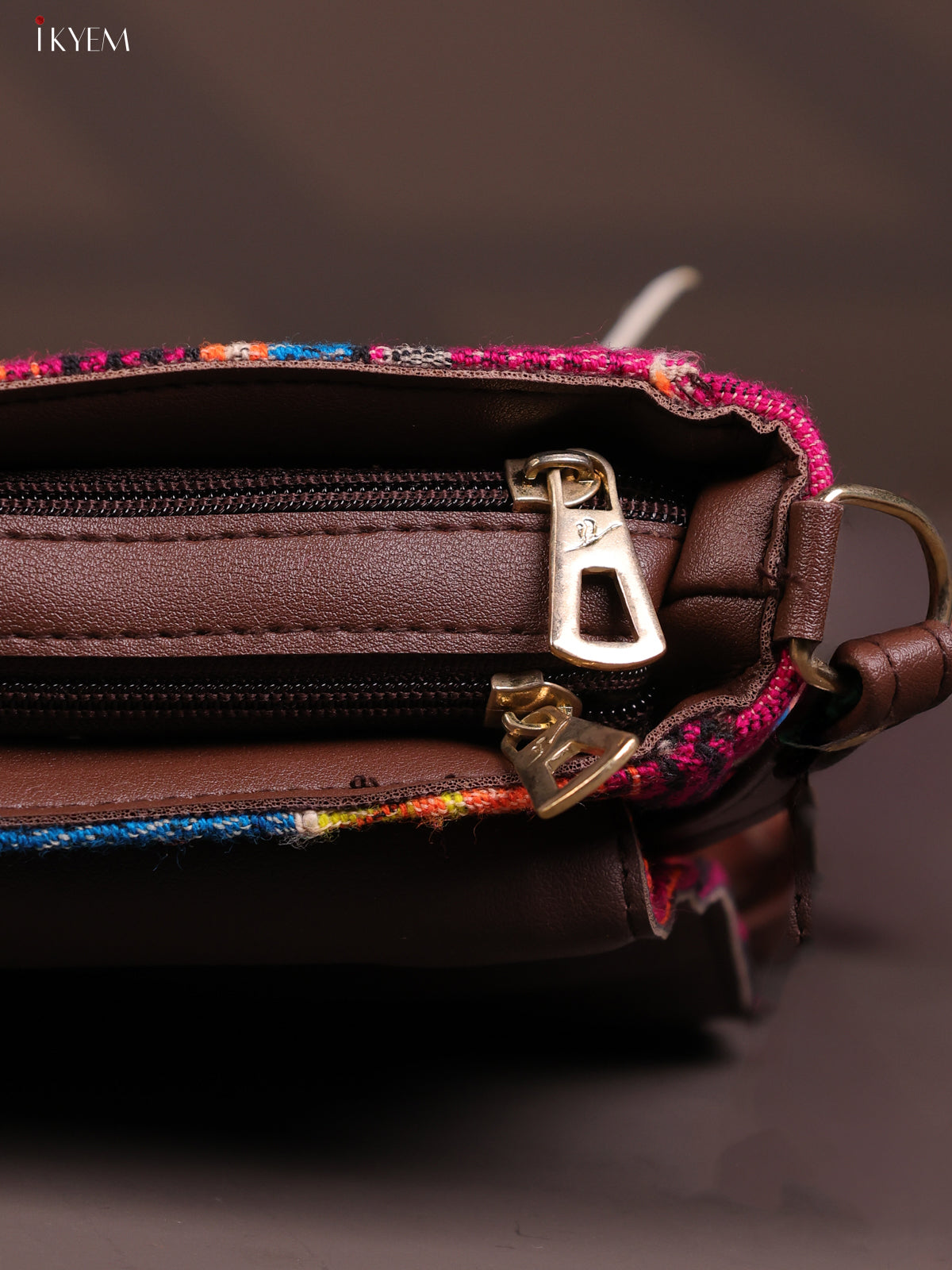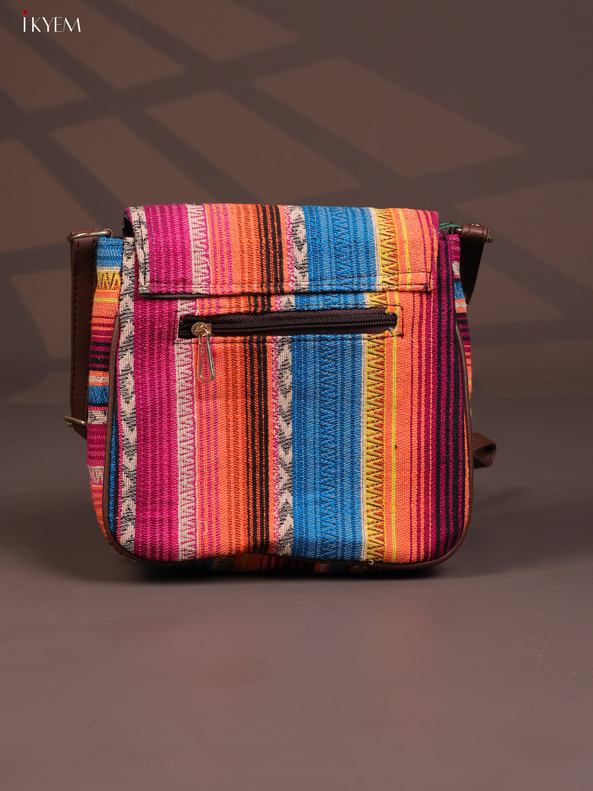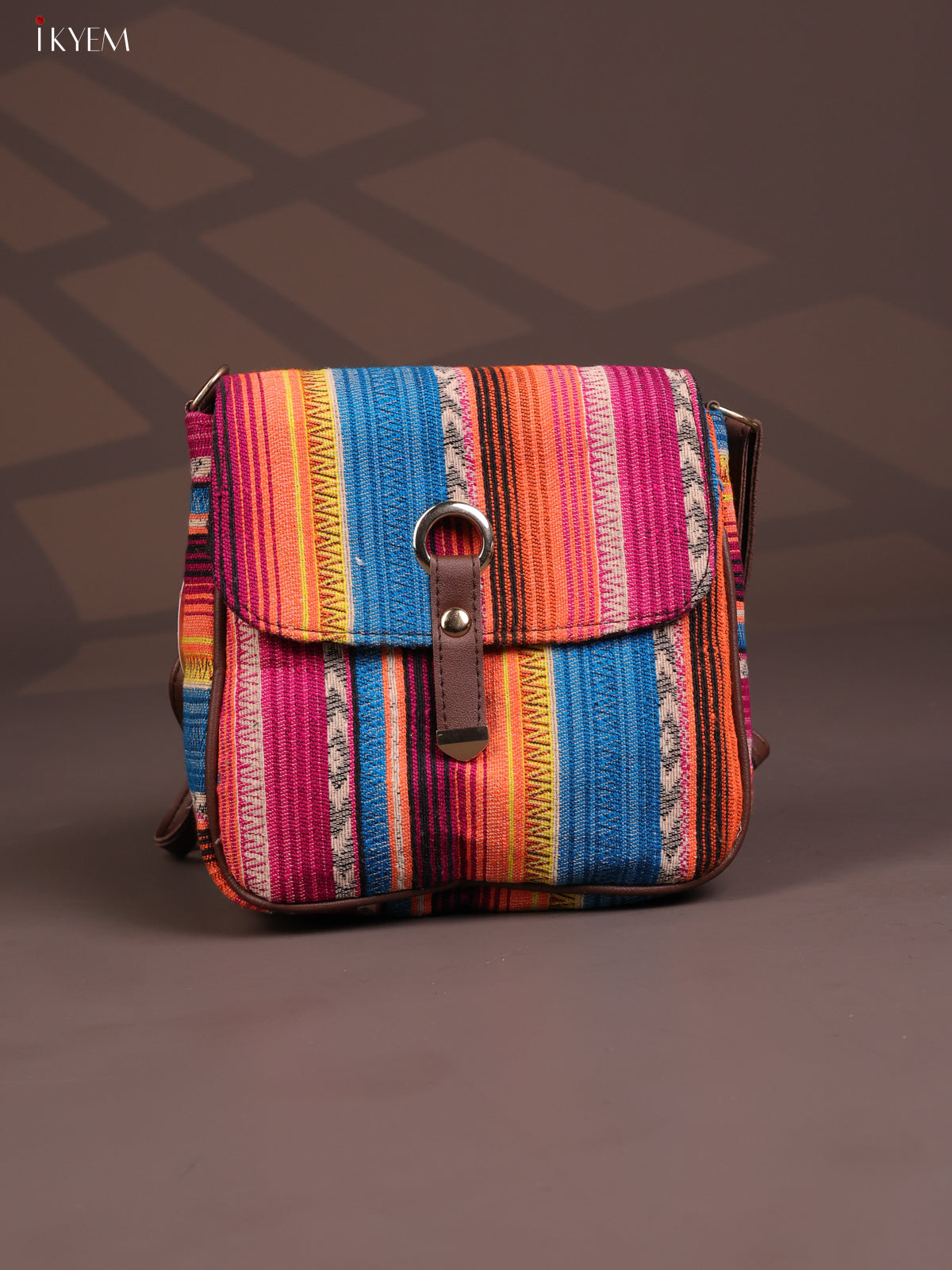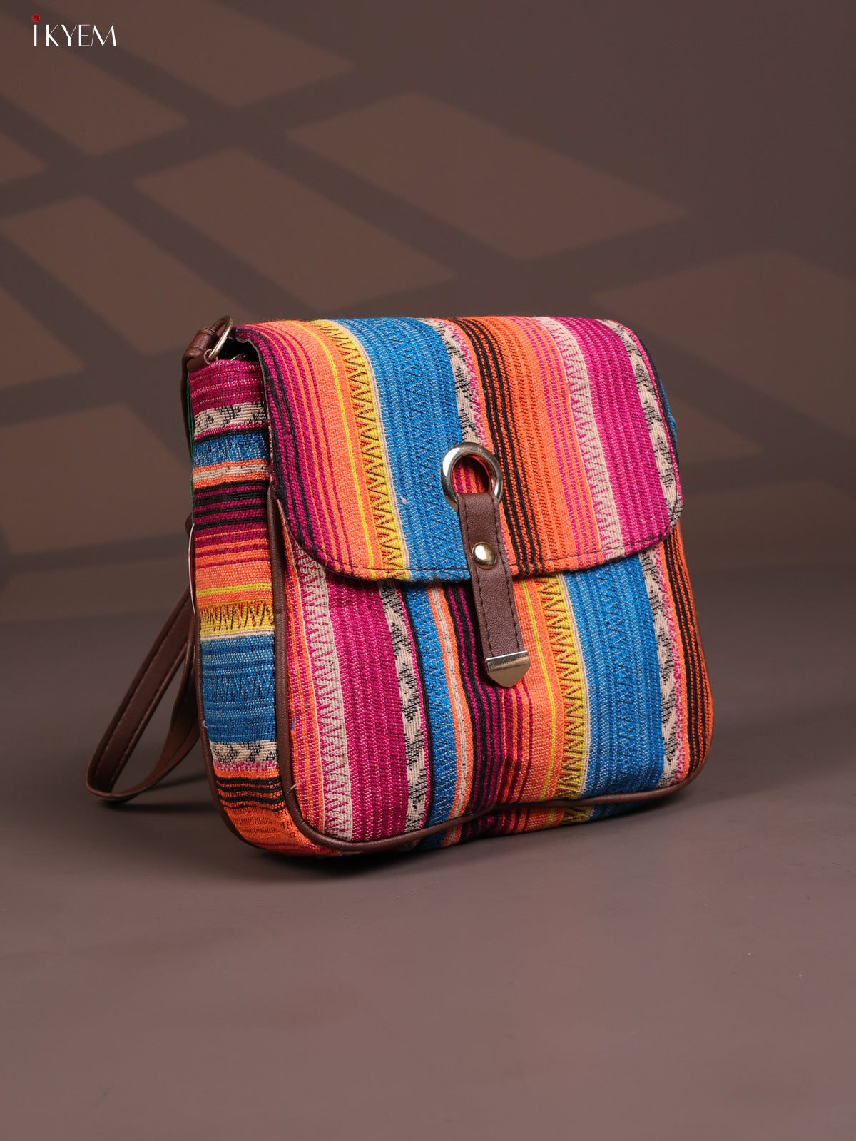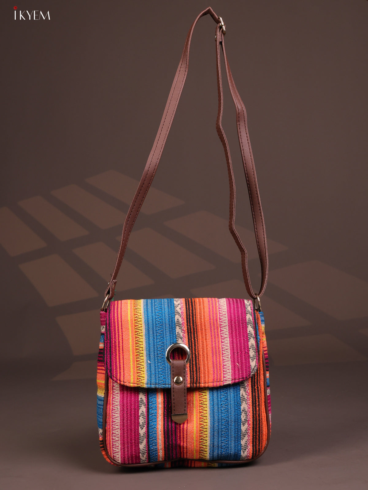 - This stylish and comfortable embroidered cotton flap leather sling bag features 3 compartments in a vibrant multicolour design.