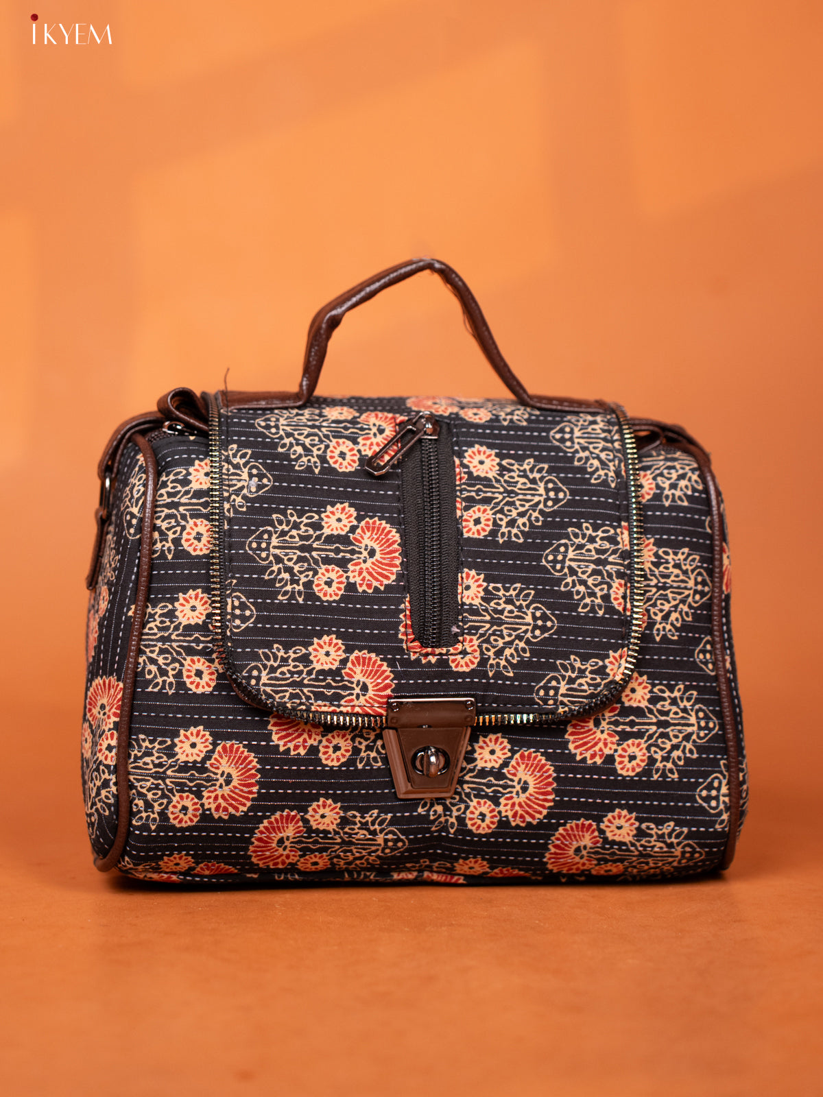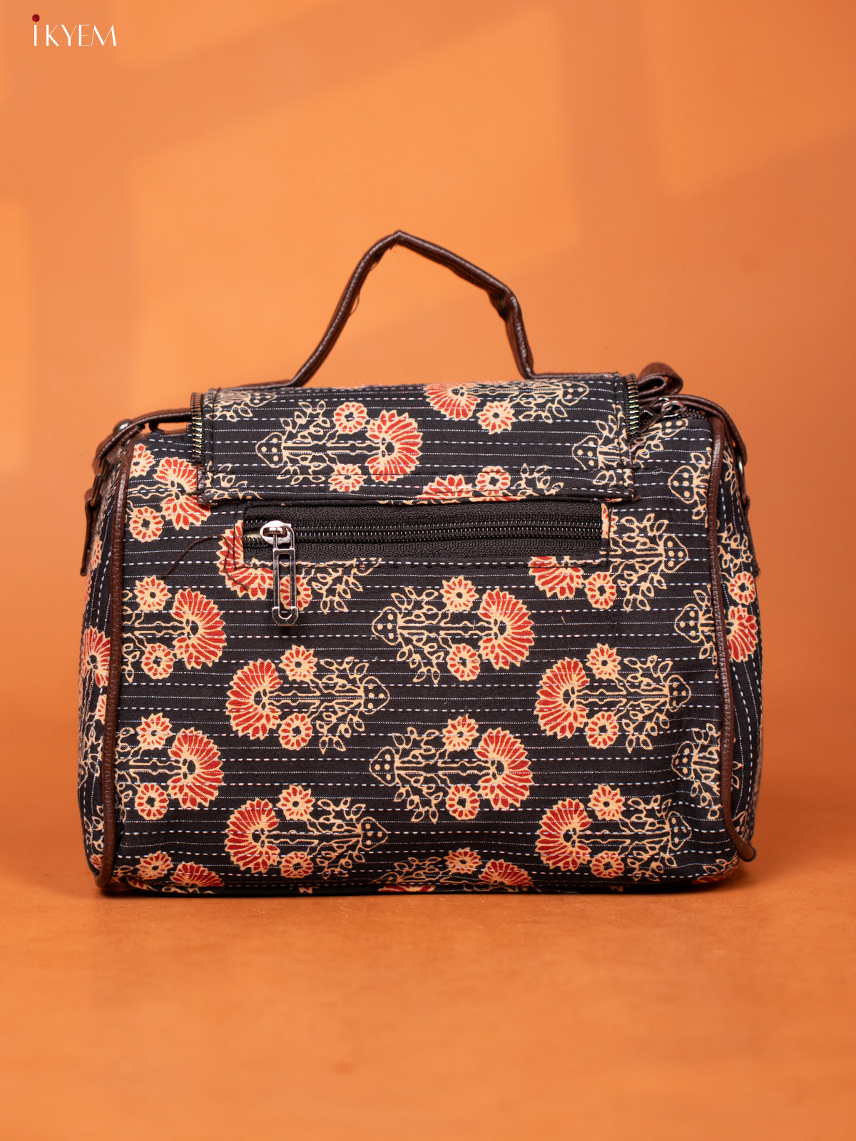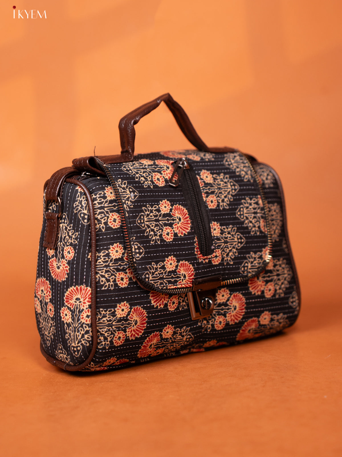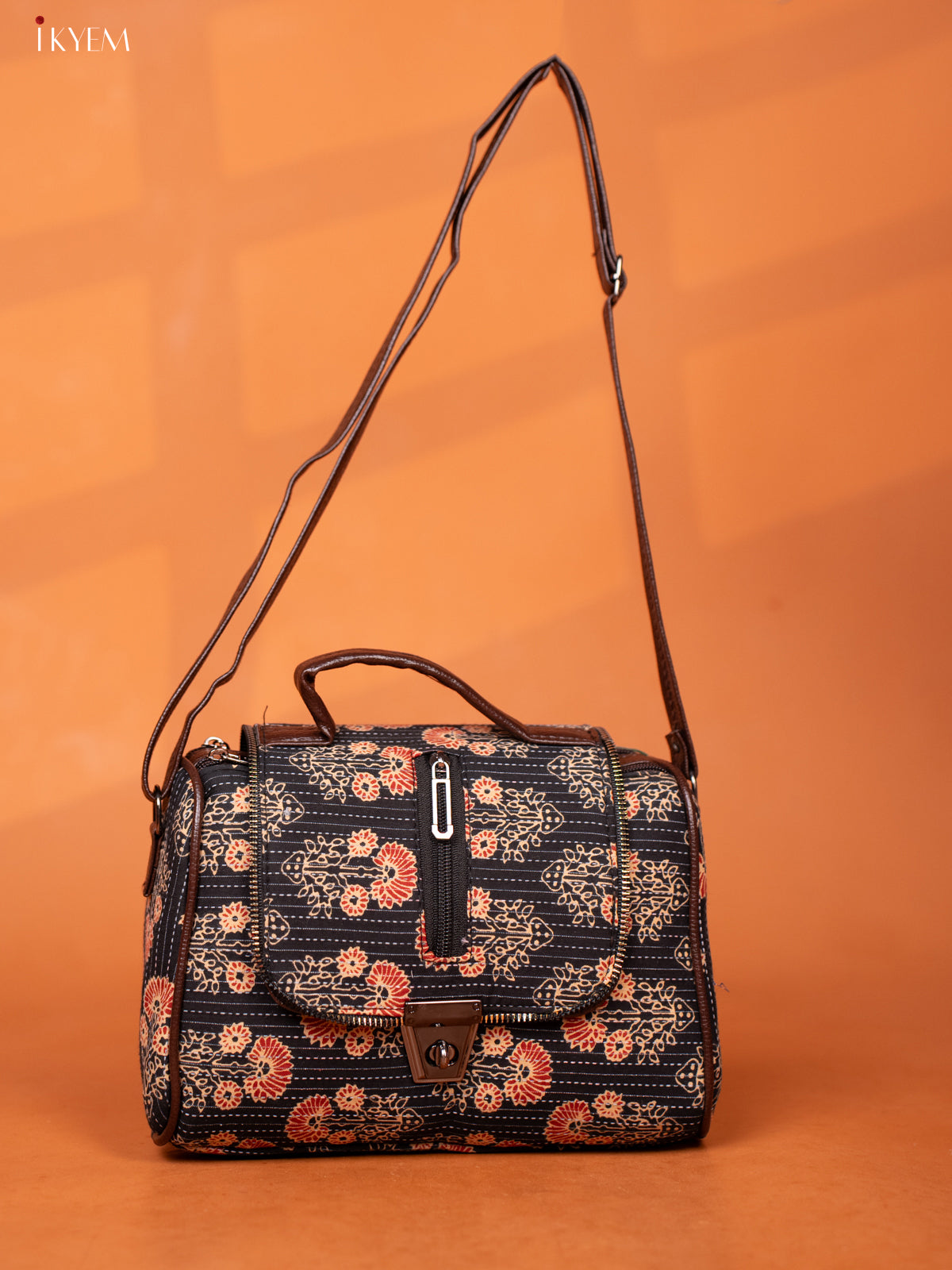 Floral Printed Leather Sling bag with Gusset & Flap - Black - KD26938
